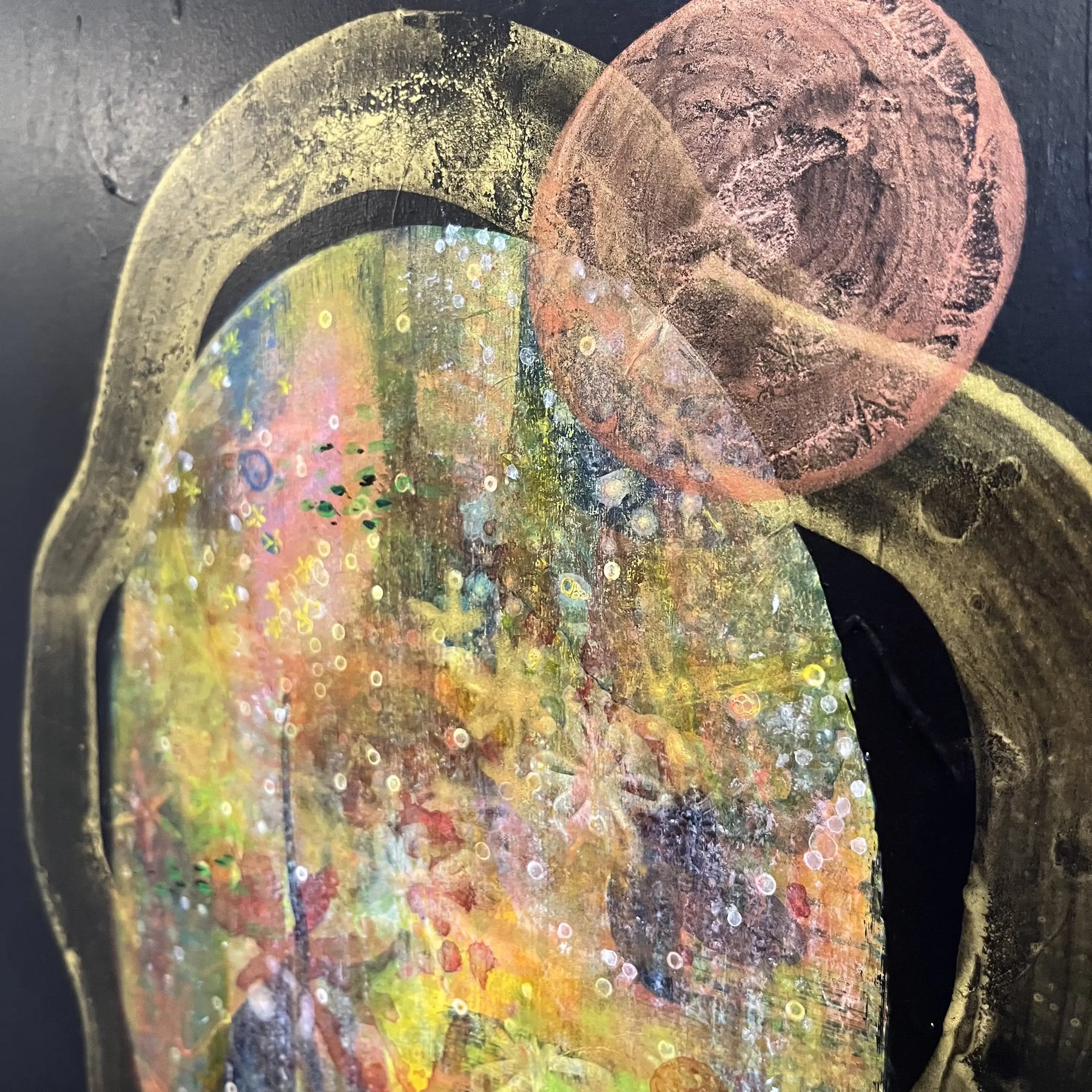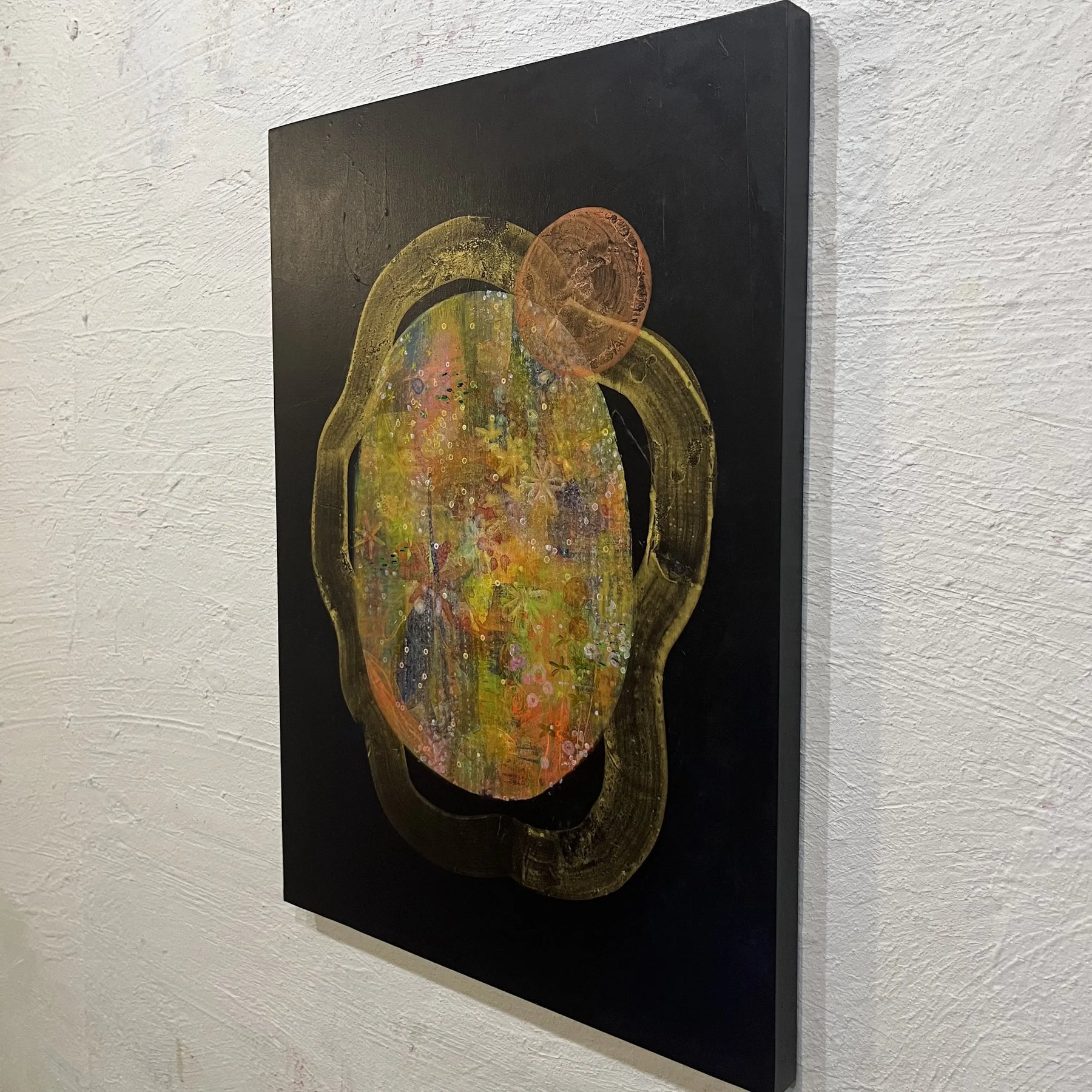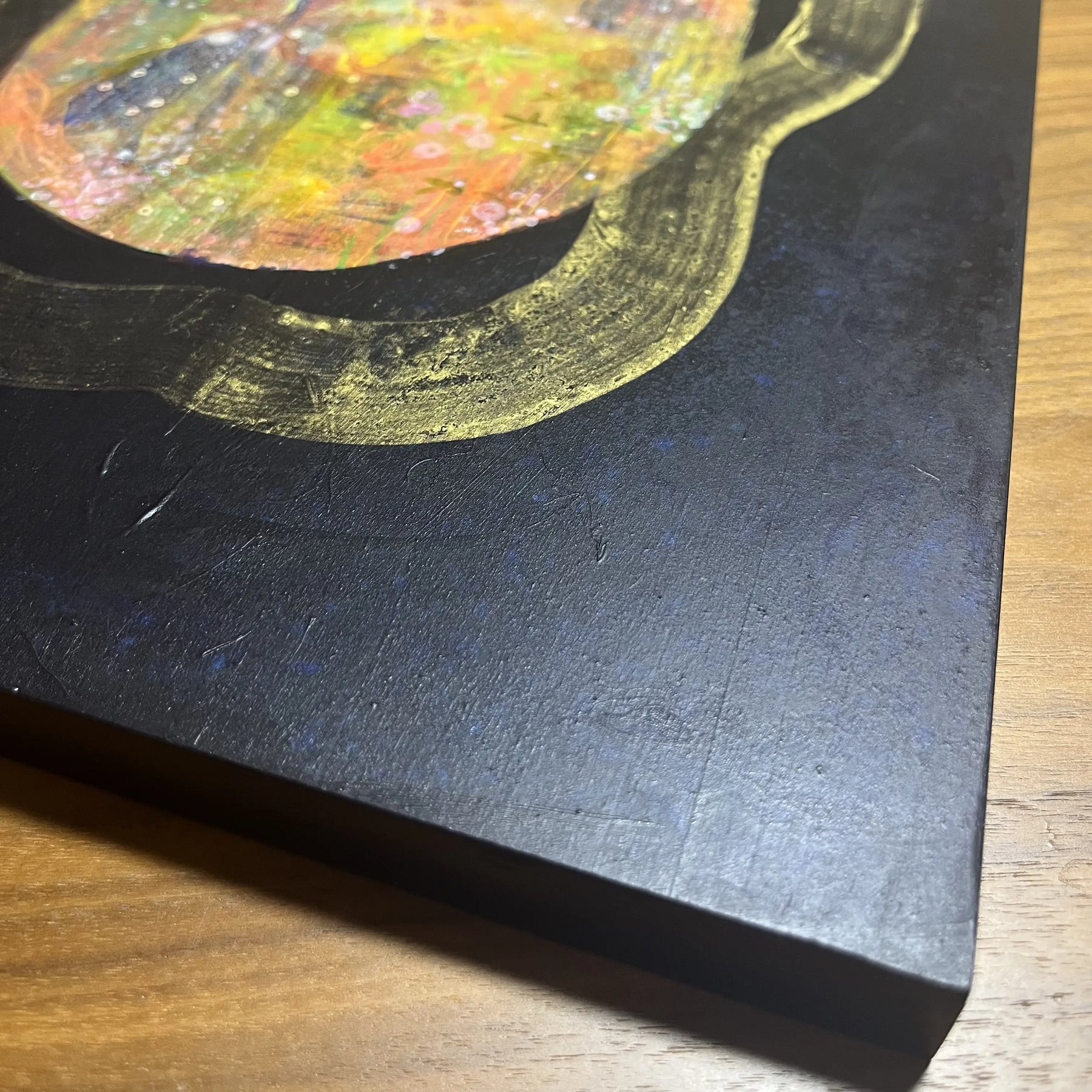 やわらかな金色の輪が、内側の世界をそっと包み込んでいます。淡い花や星のような模様が重なり、夜明け前の夢の名残のように揺れています。光の粒が静かに息づくその姿は、時間の流れさえやさしく溶かすようです。壁に飾ると、空間全体が穏やかに呼吸をはじめ、思考を深める静けさが生まれます。黒を基調としたモダンなリビングや、灯りの落ち着いた書斎にも自然に調和します。