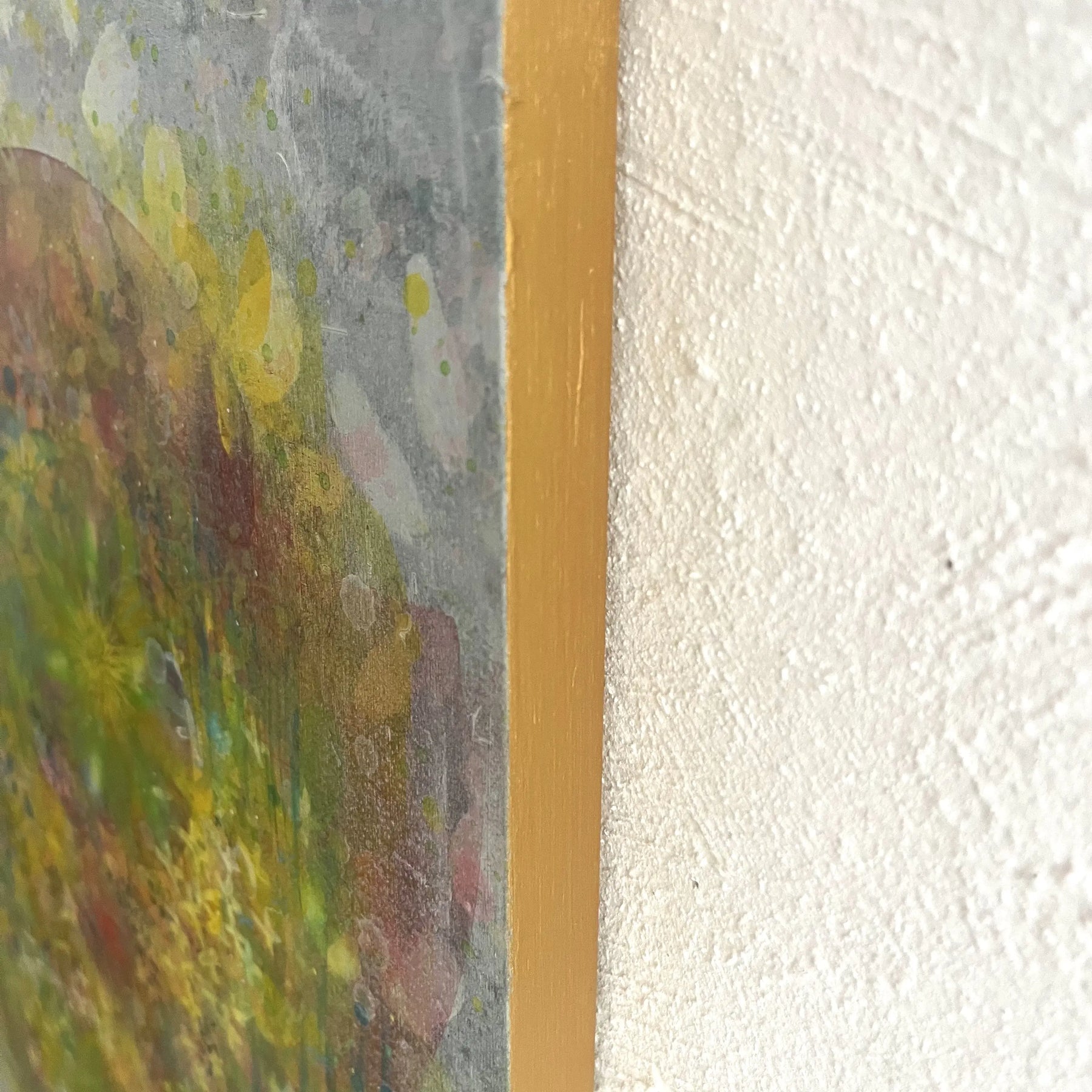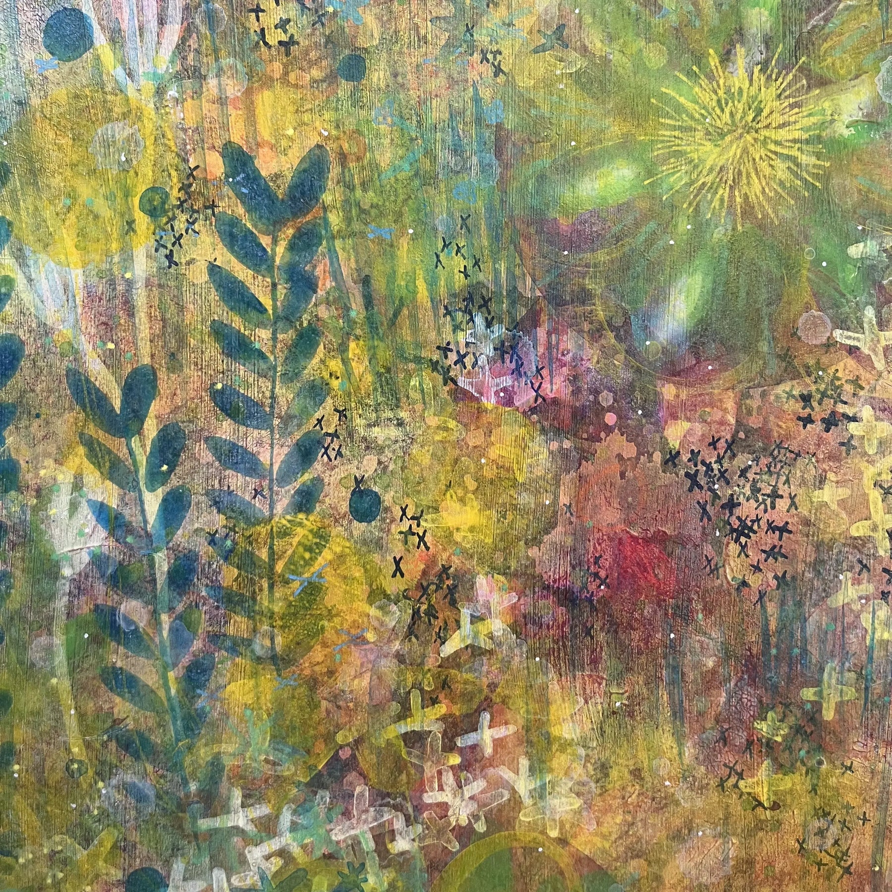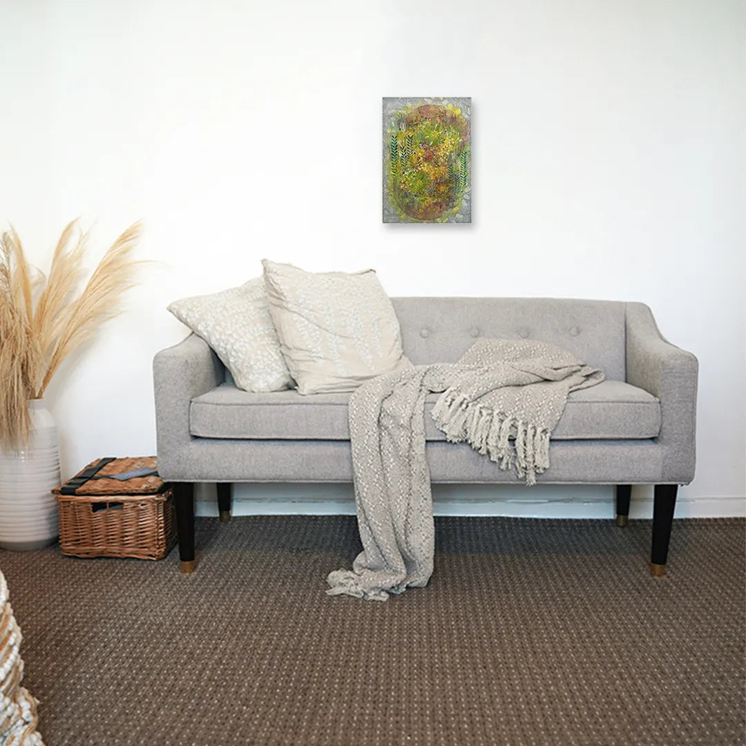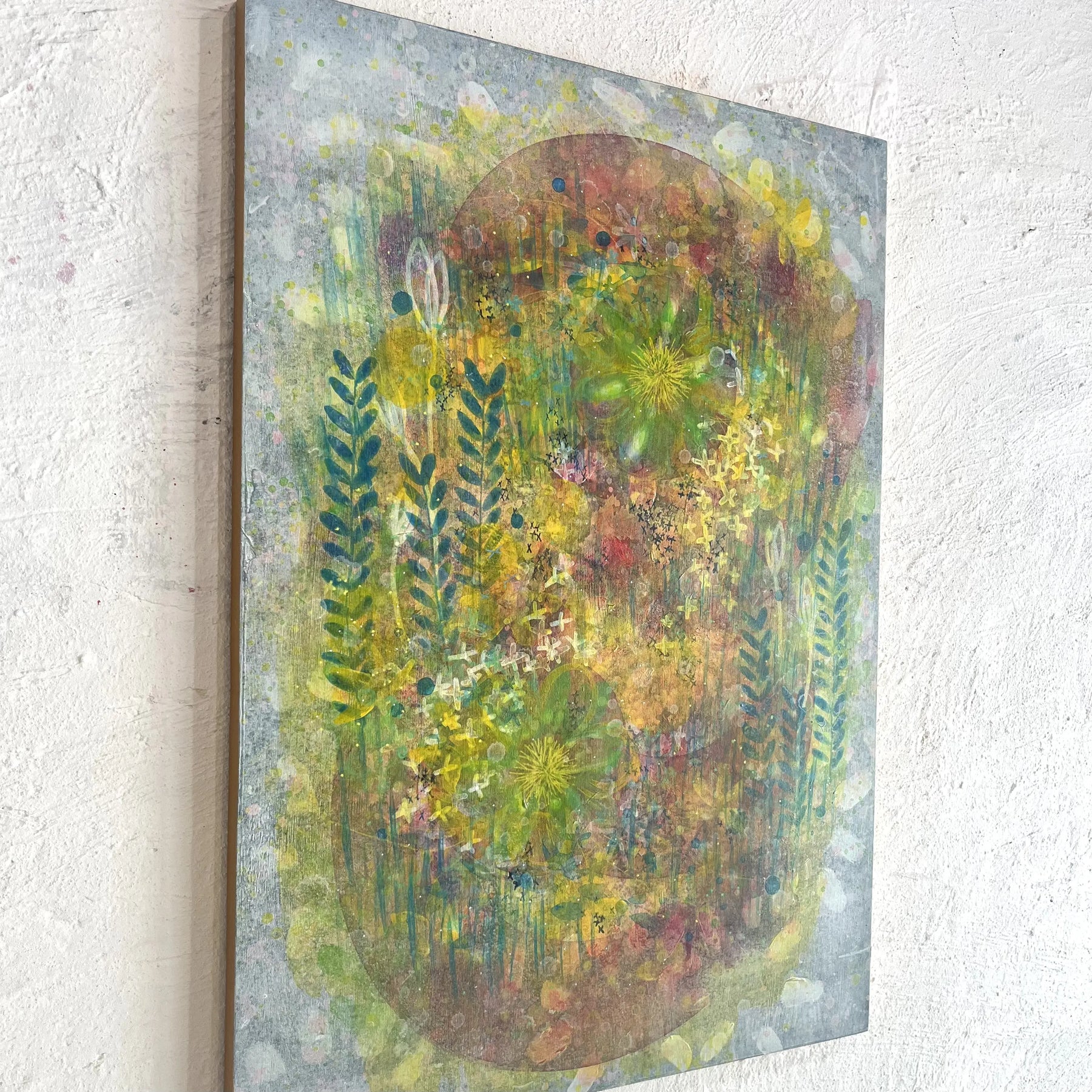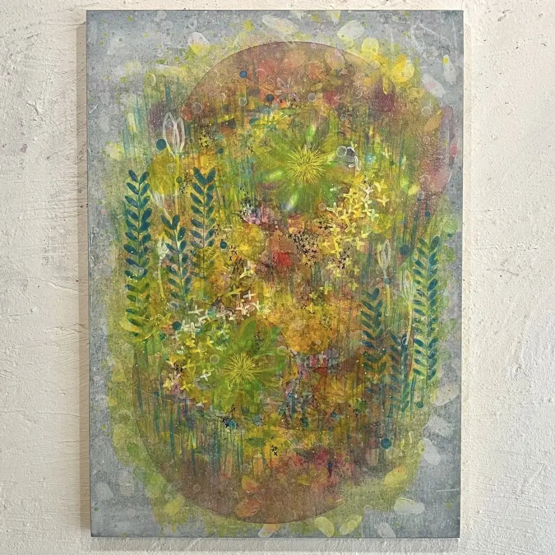 やわらかな黄と緑が重なり合い、光の粒が草の間をすり抜けるように広がっています。にじむ色彩の中で、草花が記憶のように浮かび上がり、静かな鼓動を伝えてきます。壁に掛けると、空気が少し澄み、日々の時間が穏やかに整うようです。ナチュラルな木の家具や、淡いトーンのリネンに囲まれた空間にそっと溶け込み、内側からやわらかな温度を灯します。