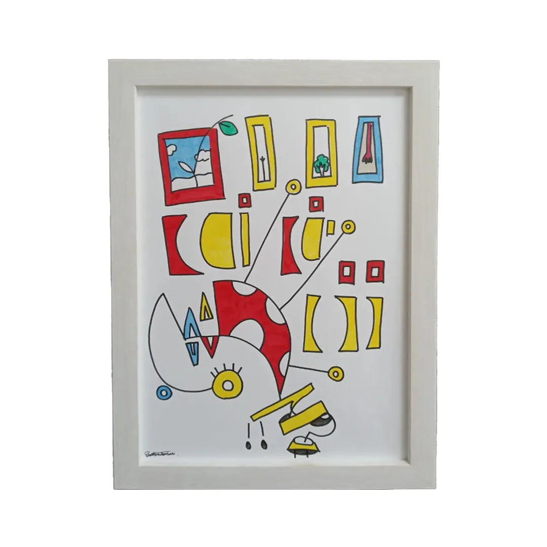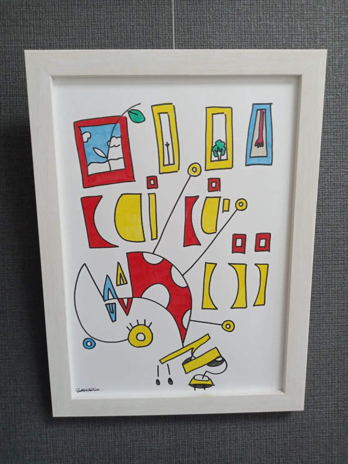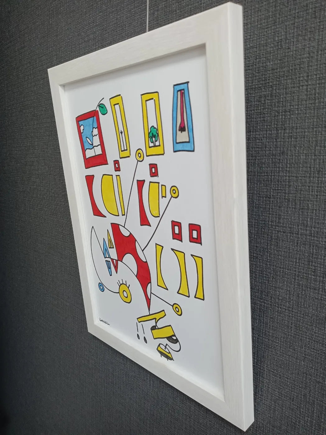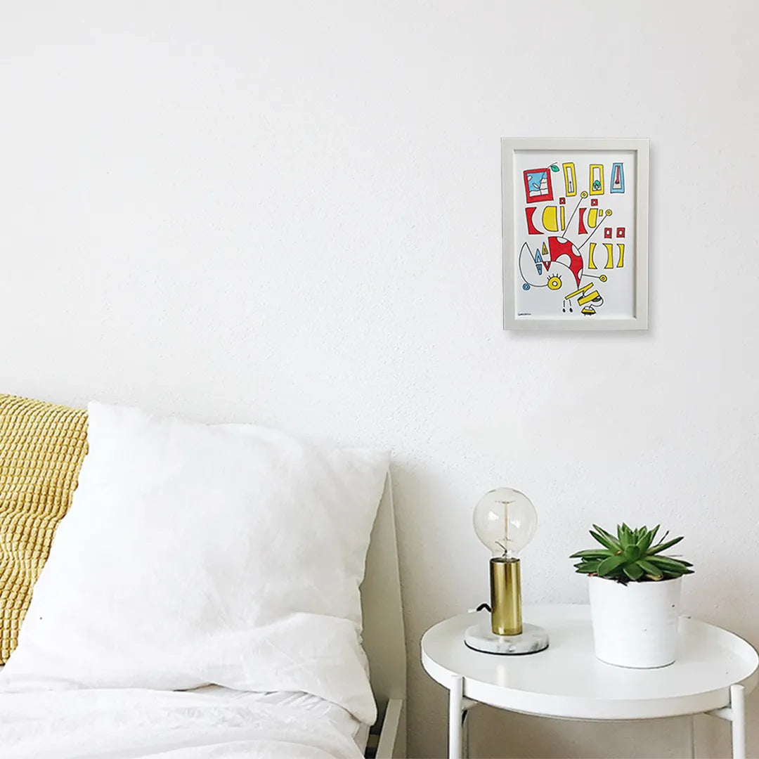 風に揺れるカーテン越しに見えた夢の断片を 、ユーモアとリズムで切り取ったような一枚。赤や黄のかたちが、日常の中にひそむ遊び心をそっと呼び覚まします。壁に飾れば、無機質な空間にもにぎやかな会話が生まれ、気配のある場所に変わっていきます。ナチュラルな木目や北欧風の家具と合わせると、書斎やベッドサイドにも心地よく馴染みます。