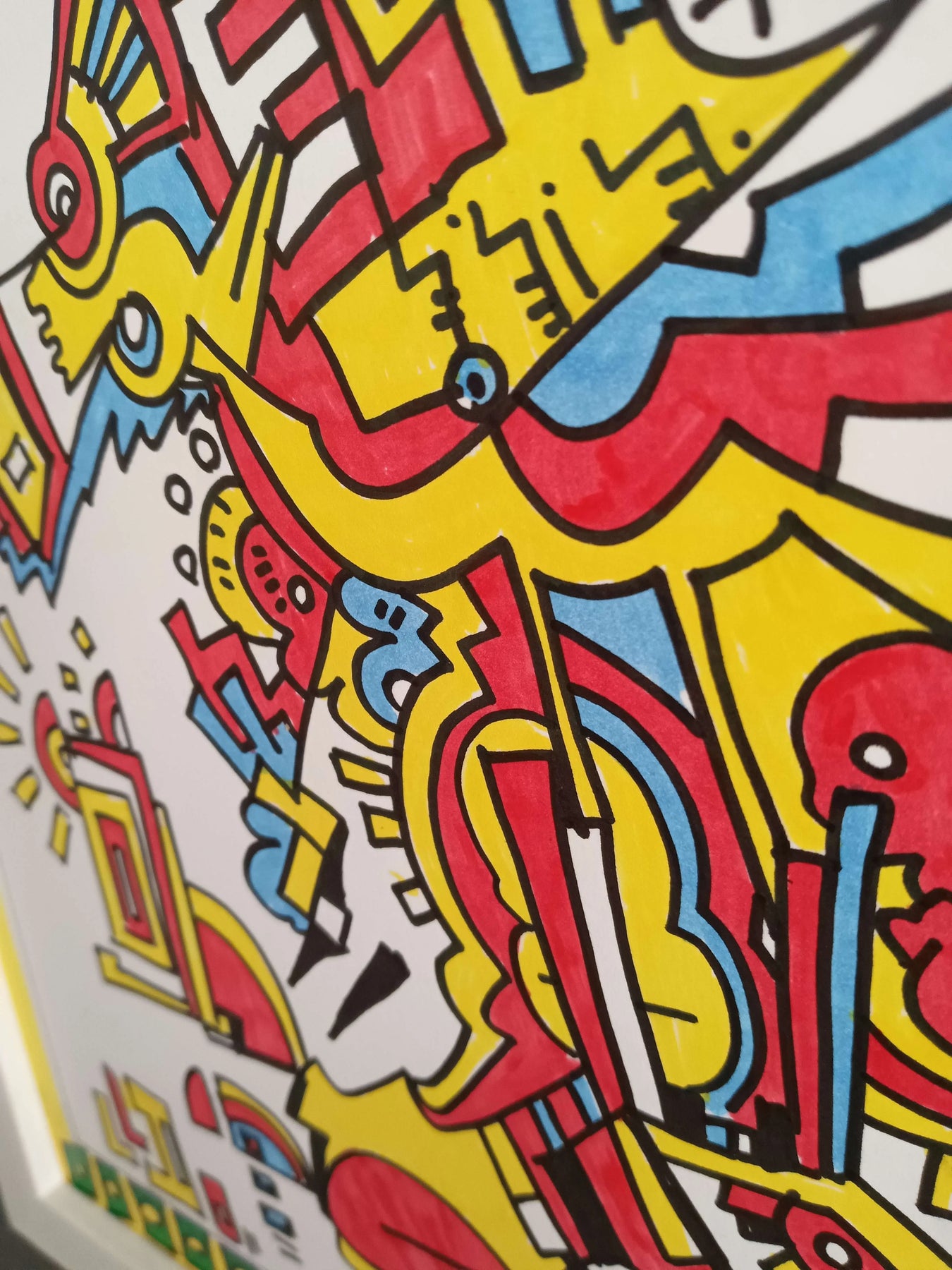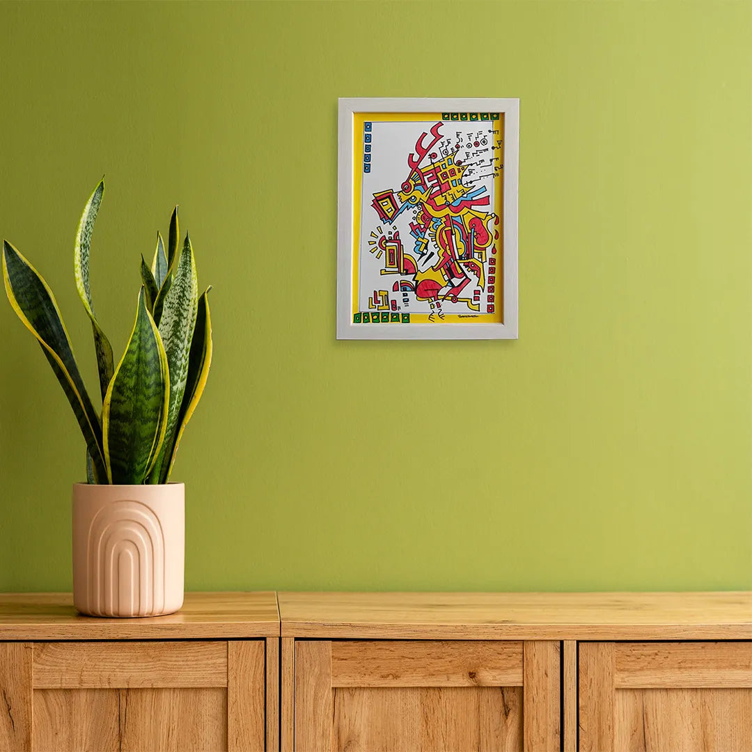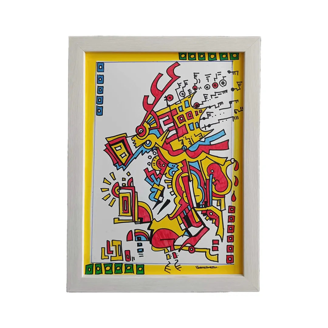 鮮烈なイエローの縁取りに囲まれ、緻密なラインと原色が踊る、エネルギーに満ちた作品です。古代の壁画や複雑な回路図を思わせる不思議な造形は、見るたびに新しい物語を紡ぎ出し、知的好奇心を刺激する心地よい高揚感を与えてくれるでしょう。この一枚を壁に飾ることで、日常の風景に鮮やかなアクセントが加わり、空間全体が創造的な熱量と活気に包まれます。書斎や仕事場のデスク周りに、モダンなインテリアとも格好よく調和します。