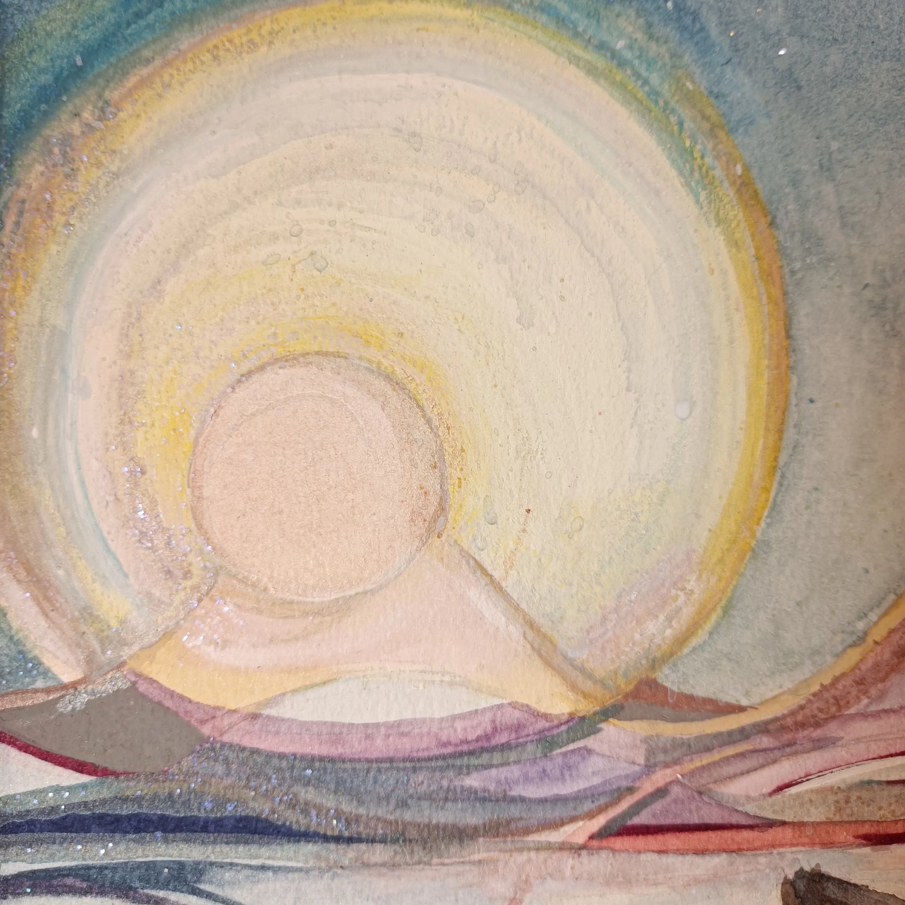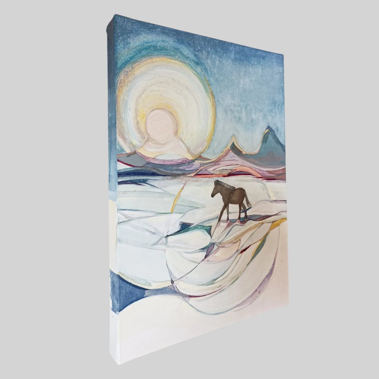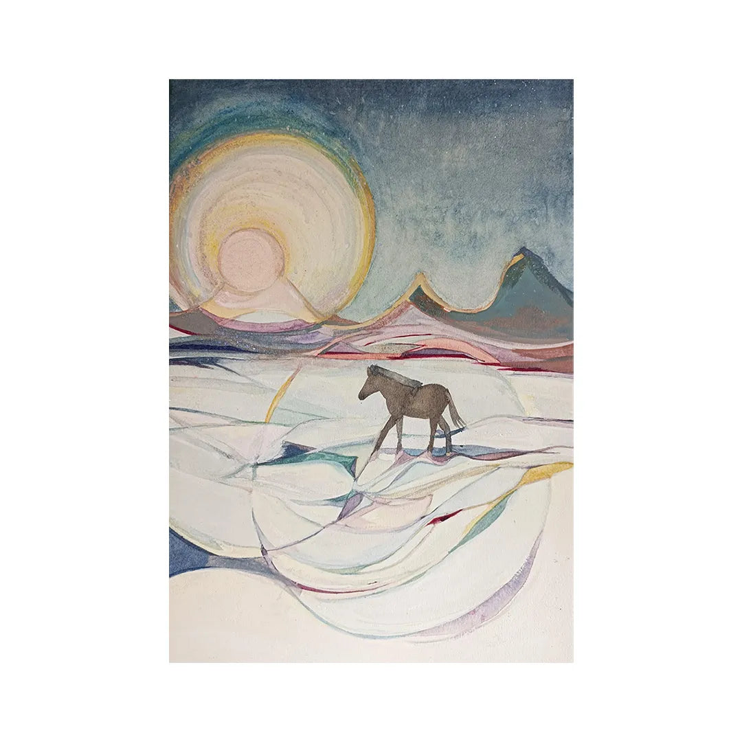 柔らかな光を放つ大きな太陽に見守られ、一頭の馬が広大な大地を静かに歩む、幻想的な物語を感じさせる一作です。水彩のような繊細な滲みと、山々を縁取る金のラインが響き合い、見る人の心に深い安らぎと未来への希望を届けてくれるでしょう。この作品を一点飾ることで、お部屋に穏やかな時間が流れ、住まう人を優しく包み込むような温かな空間へと変わります。寝室の枕元やリビングに、北欧風の明るい木製家具とも心地よく調和します。