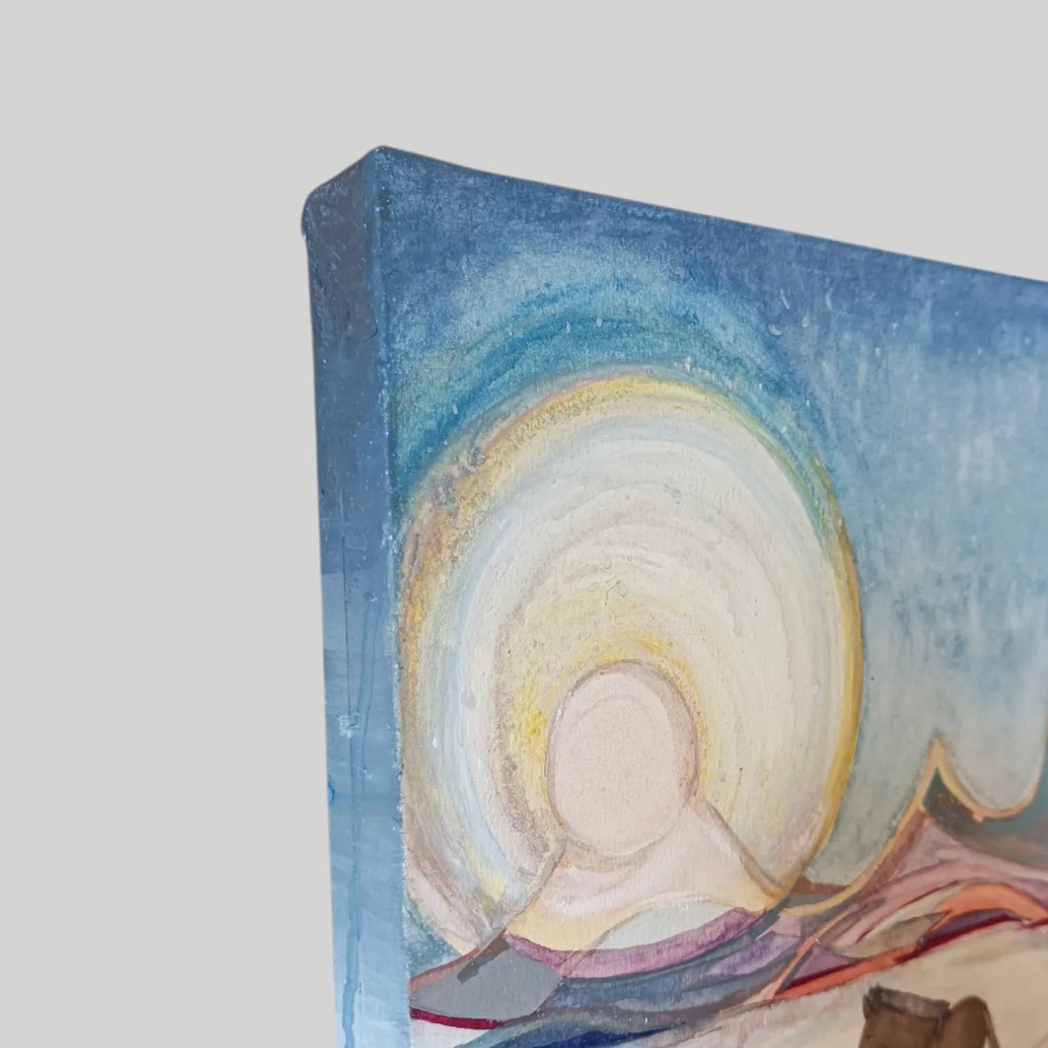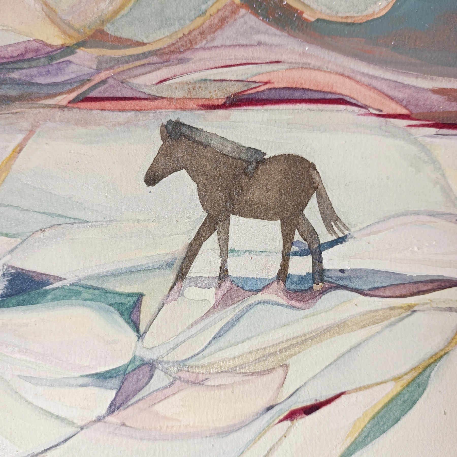 - 雪景色と馬を描きました。光を受けて白く輝く雪面の中に、鮮やかに浮かび上がる影と馬のシルエット、太陽を表現しました。白と青を基調にした抽象表現作品で、A4サイズのため空間になじみ、飾りやすいです。