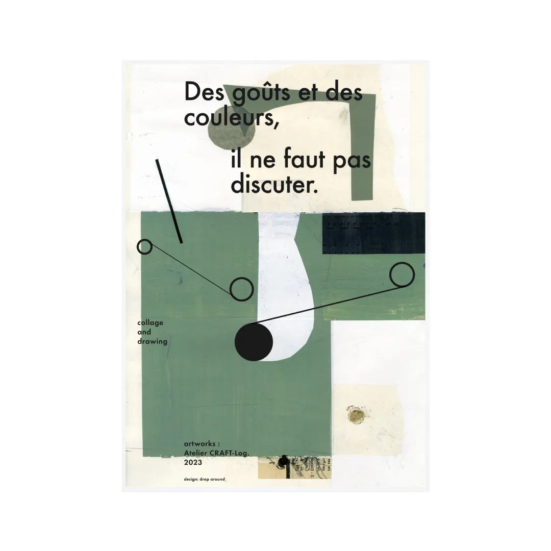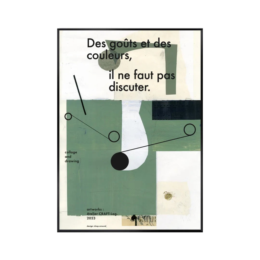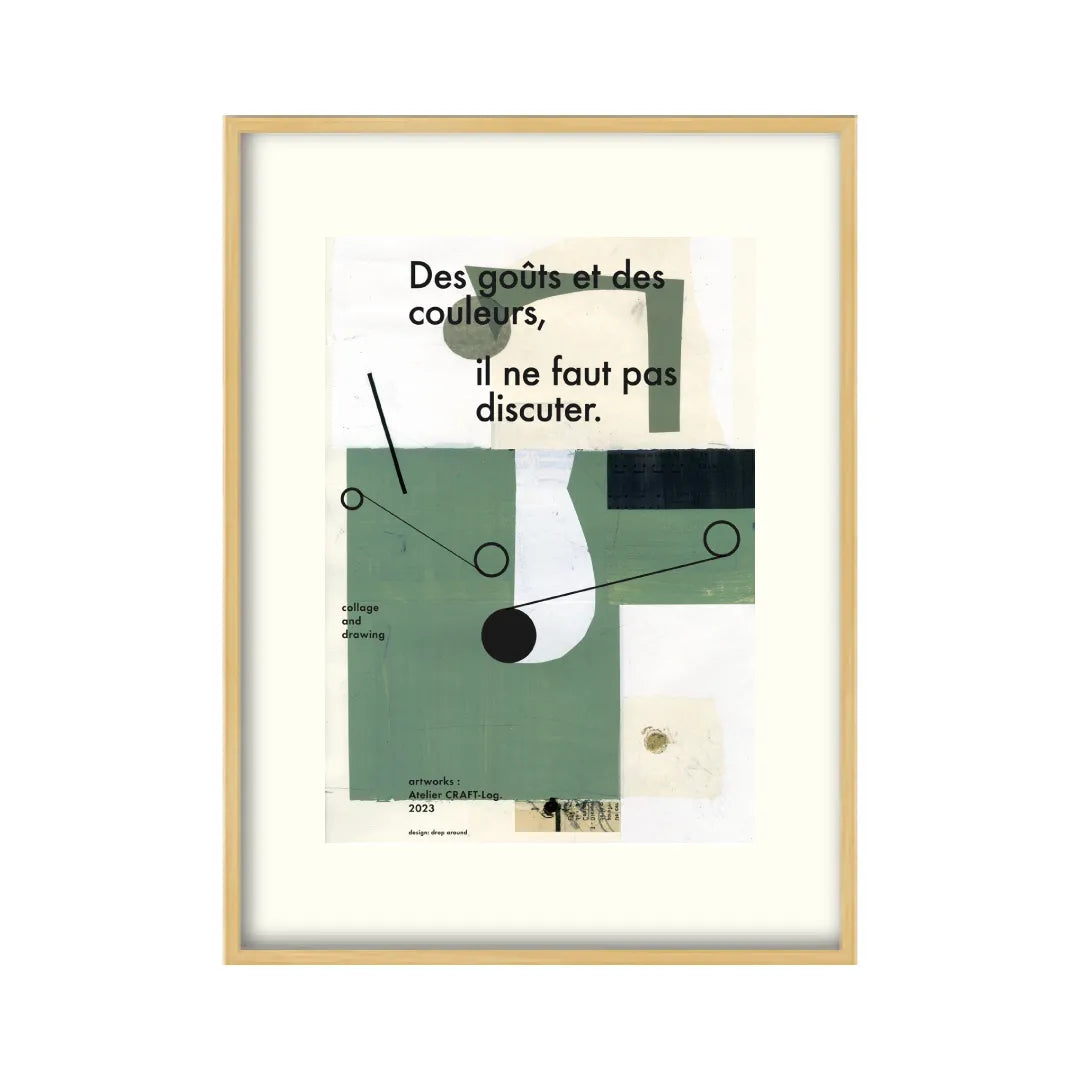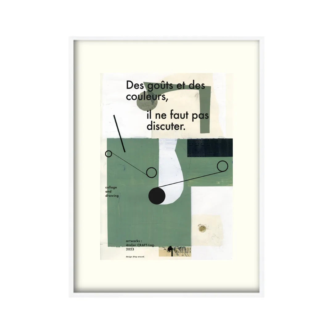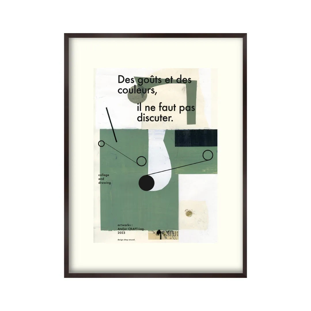 本作品は、幾何学的な形と落ち着いた緑や白の色合いを使った抽象的なコラージュアート。フランス語の「Des goûts et des couleurs, il ne faut pas discuter.」というフレーズが強調されており、「好みや色について議論すべきでない」という意味を表現しています。モダンでミニマルなデザインが特徴の作品なので、シンプルなお部屋にぴったりですね。