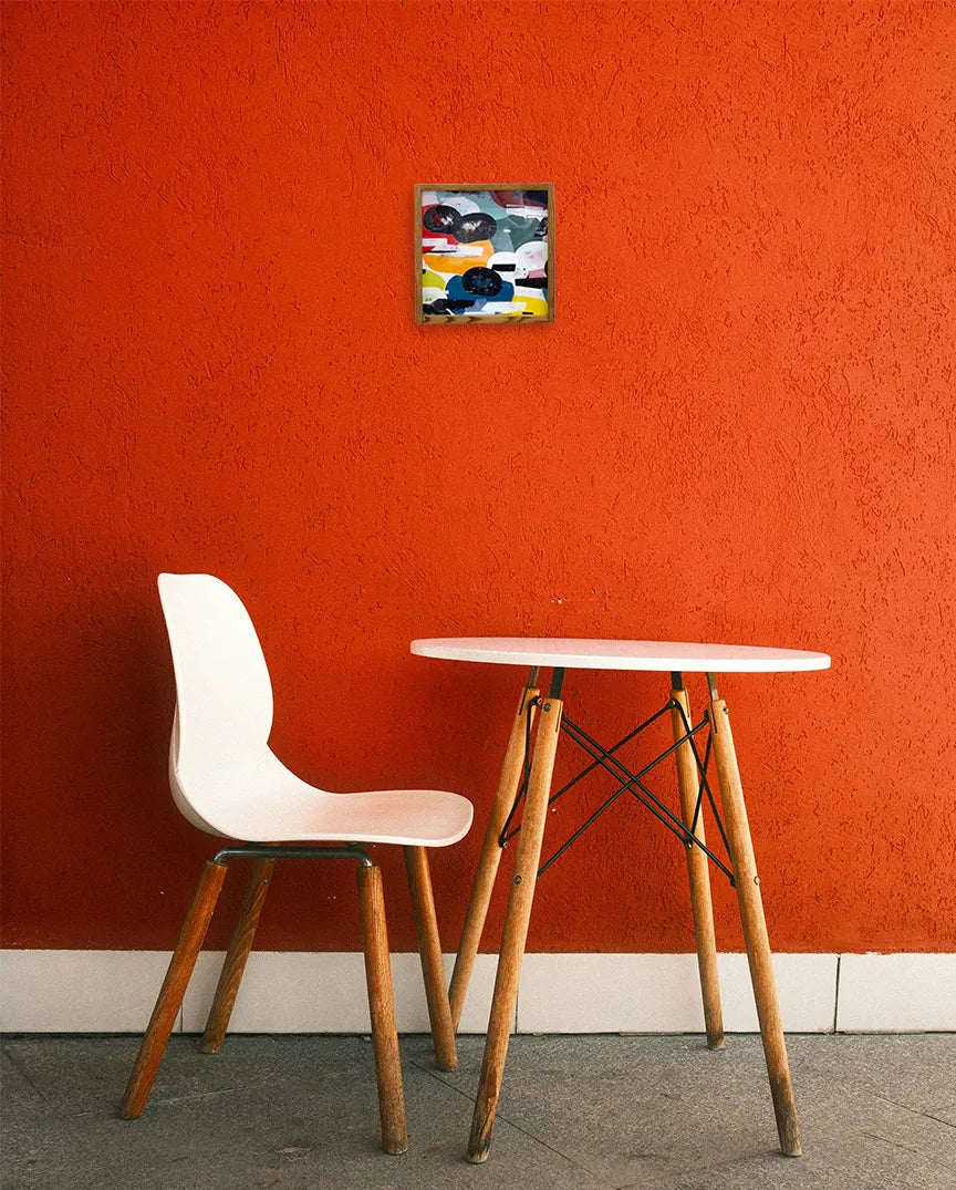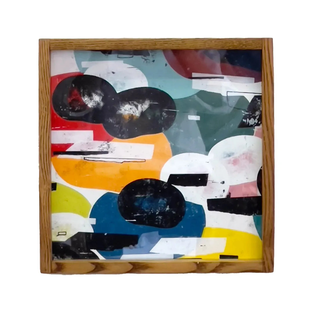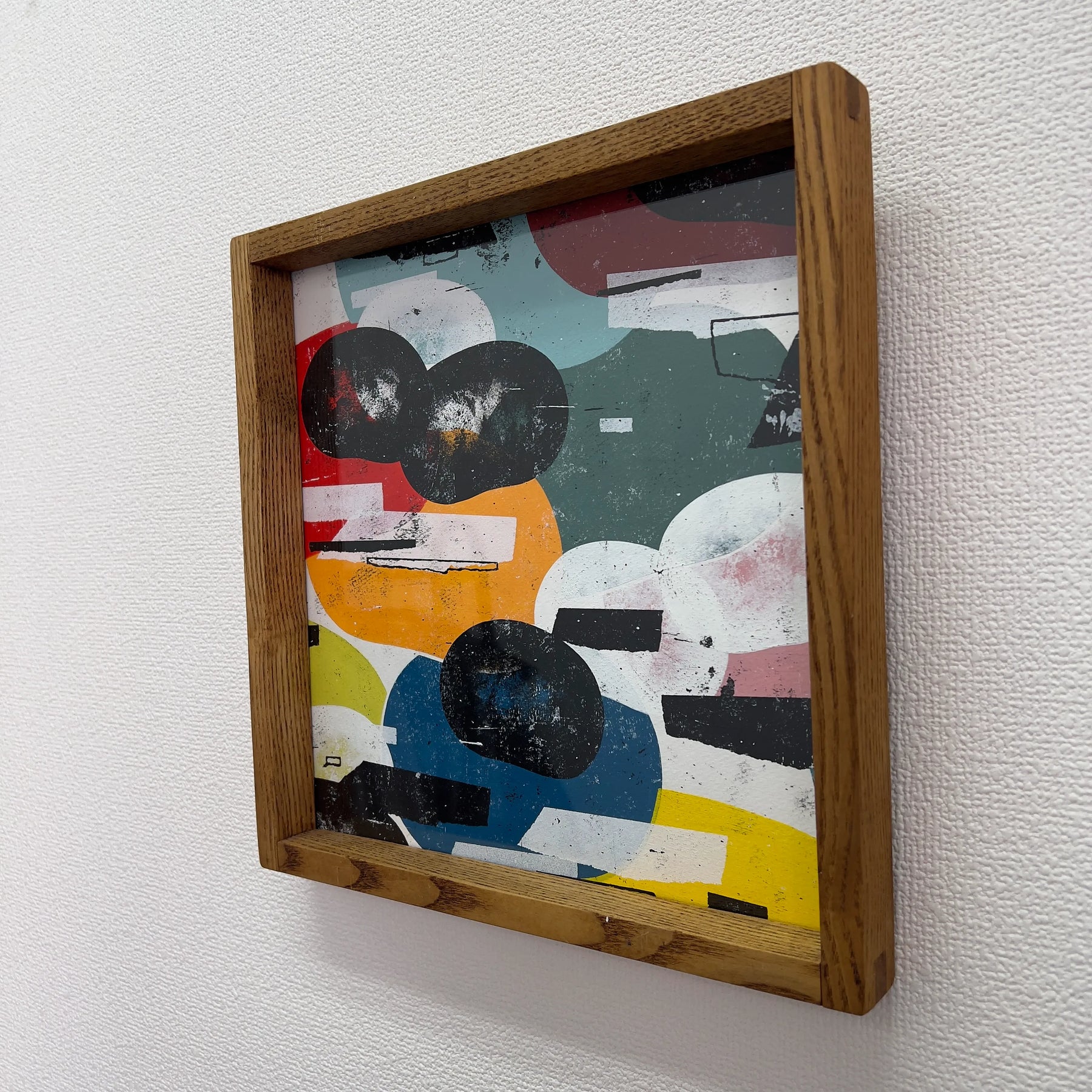 実体のある色面と黒い影が重なり、会話の途中を切り取ったような緊張が漂います。擦れや滲みが時間の揺れを残し、見るたびに配置が変わる感覚です。壁に掛けると空間に軽いズレが生まれ、思考の速度が少し緩みます。リビングの一角やワークスペースに置くと、木枠や無機質な照明と調和し、日常に新しい視点を招きます。