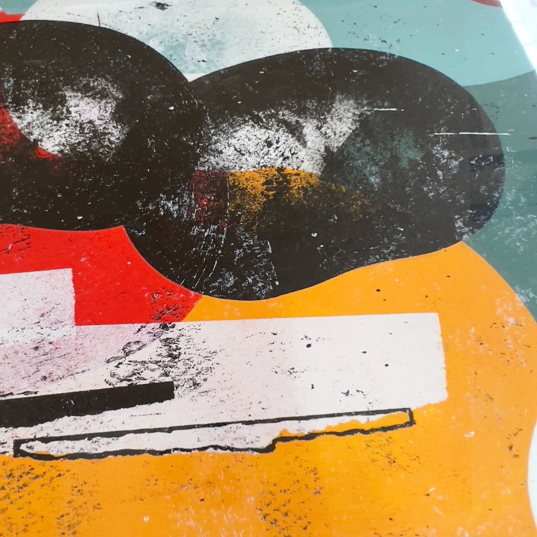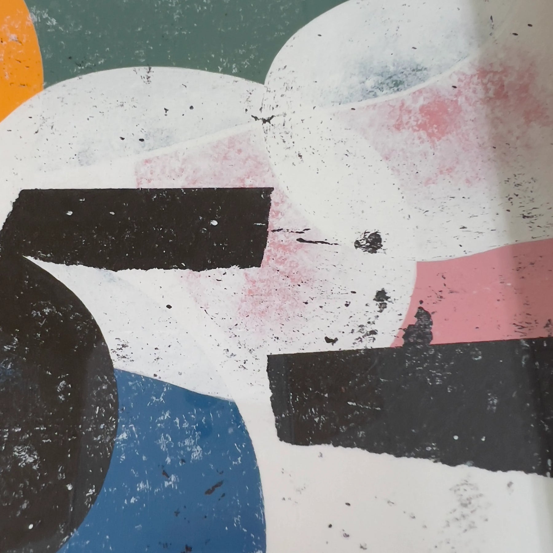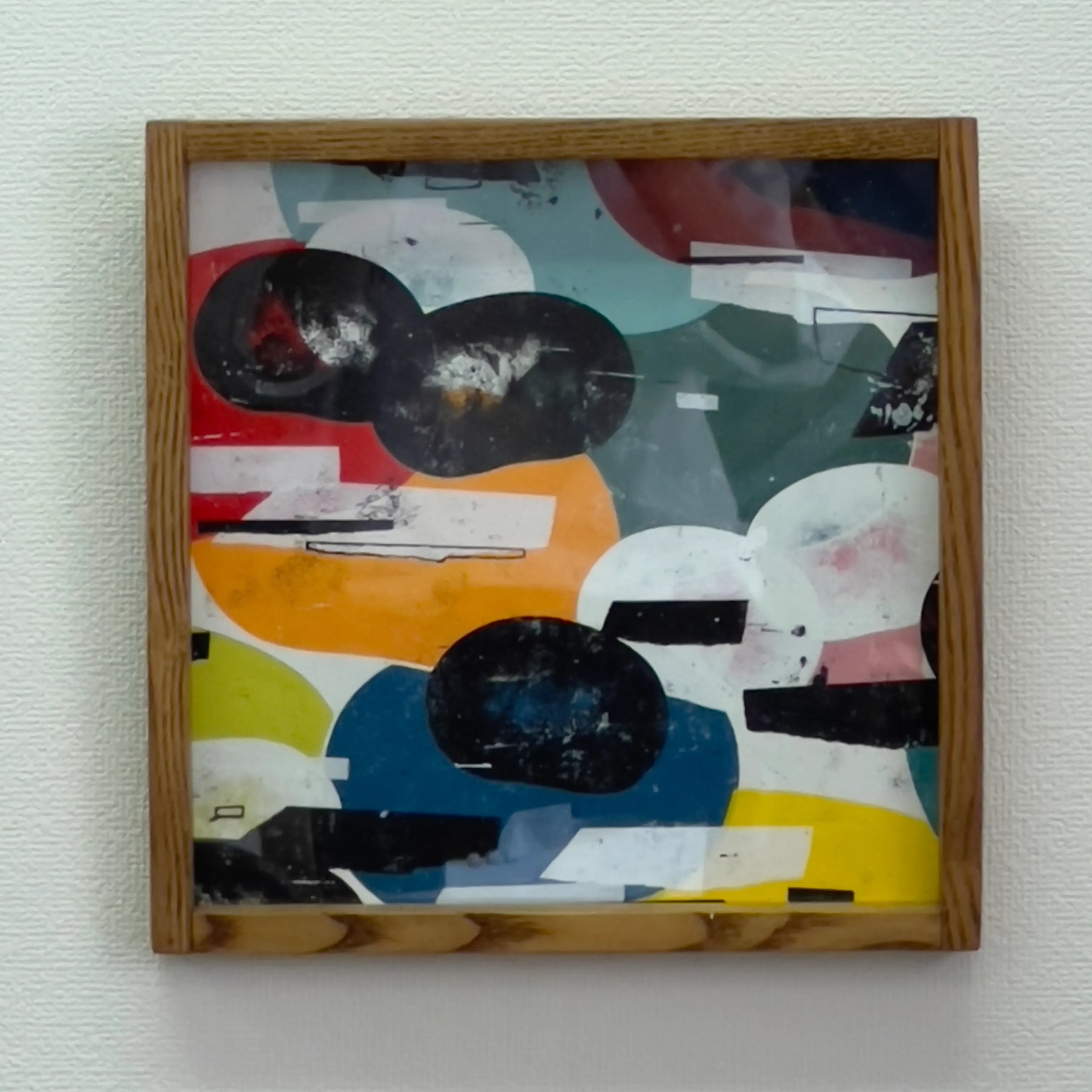 実体のある色面と黒い影が重なり、会話の途中を切り取ったような緊張が漂います。擦れや滲みが時間の揺れを残し、見るたびに配置が変わる感覚です。壁に掛けると空間に軽いズレが生まれ、思考の速度が少し緩みます。リビングの一角やワークスペースに置くと、木枠や無機質な照明と調和し、日常に新しい視点を招きます。