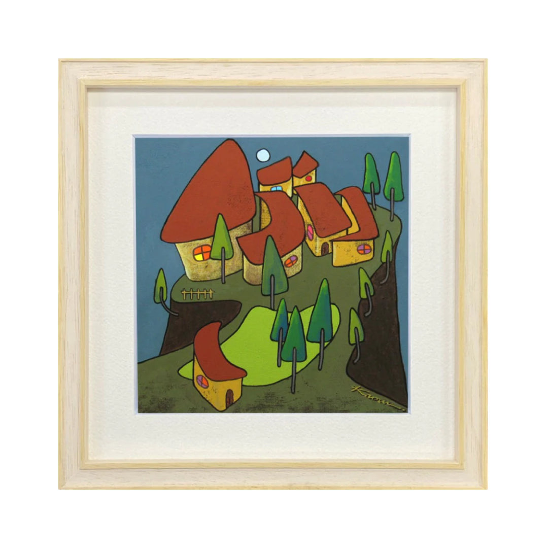 全体的に暗めの背景に赤い屋根の家が立ち並んでいます。独特な家の形が印象的です。