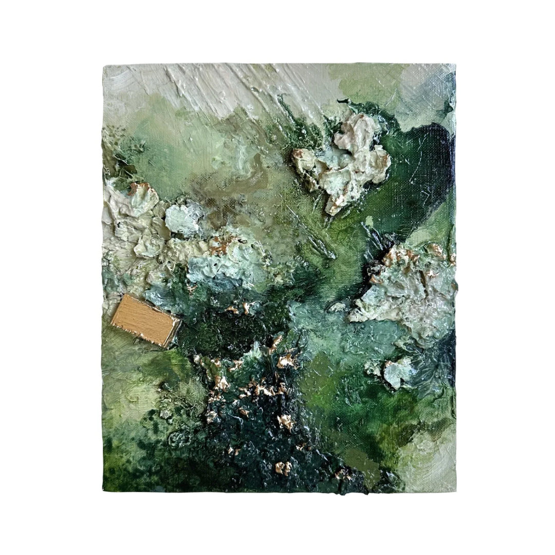 藻が絡んだ岩肌のような立体的なテクスチャーが、地中から湧き上がるエネルギーや自然の神秘を感じさせます。エメラルドグリーンの濃淡の中で、金色の結晶のような立方体がアクセントになっています。ナチュラルテイストのインテリアにおすすめです。