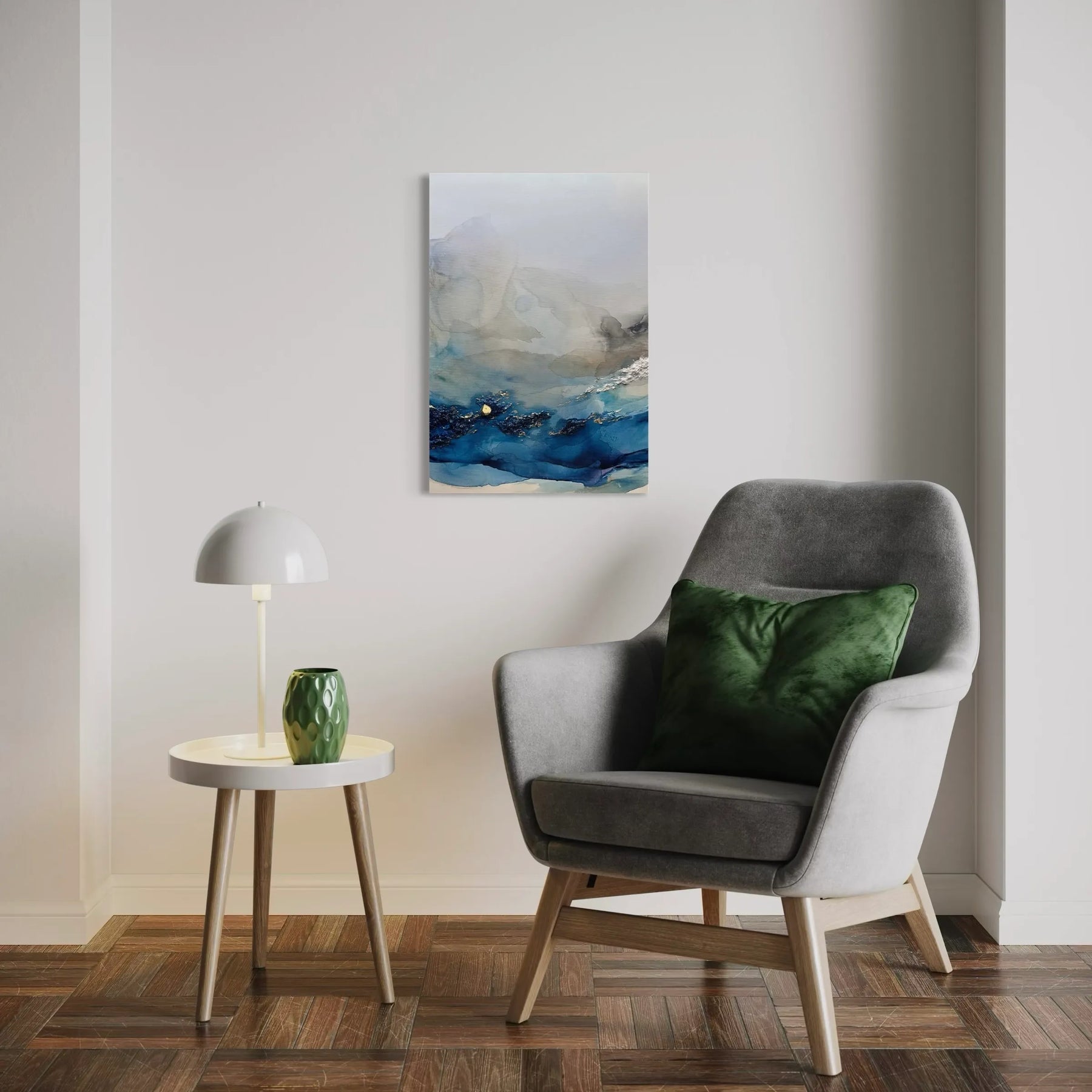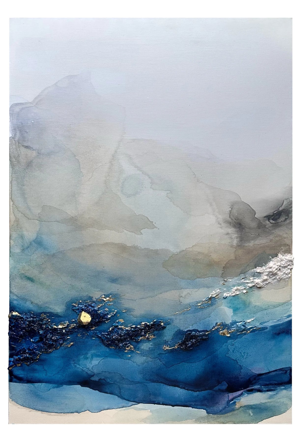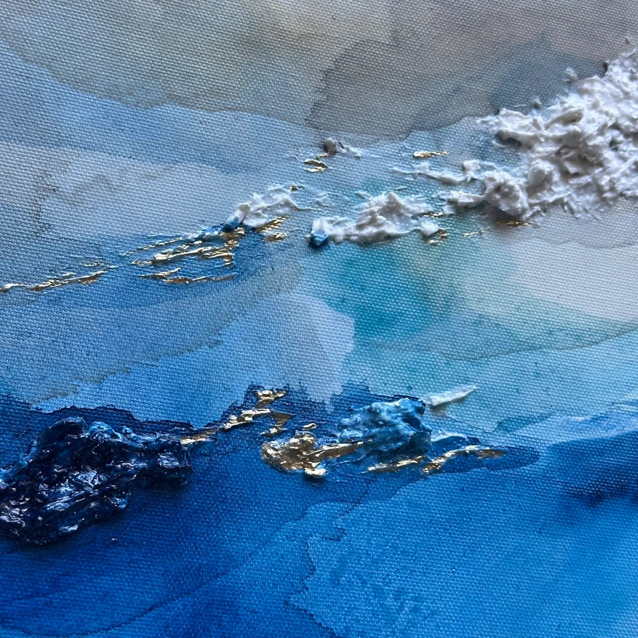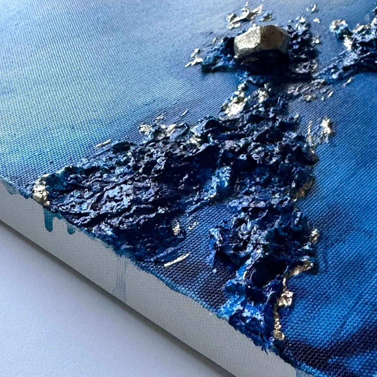 霧がほどけるような階調の青に、砂金のきらめきが静かに走り、波間の時間がゆっくりと滲みます。重なり合う色は呼吸の間をつくり、眺めるほどに心拍が整っていきます。壁に掛けることで光の反射が変わり、室内に深さと落ち着きが生まれます。リビングのソファ背面や書斎、木や石の質感を生かした空間にも自然に溶け込みます。
