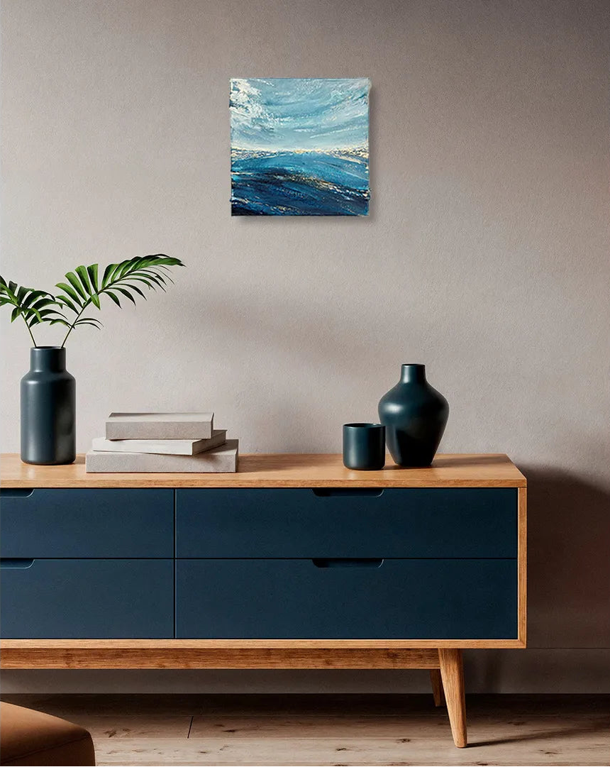 荒々しくも美しい波の情景を、青の濃淡と金色の煌めきで表現した作品です。力強い筆致が、海の鼓動や風の流れを伝え、空間に壮大な開放感とエネルギーをもたらします。リビングや書斎に飾れば、自然の息吹を感じ、心が洗われるような感動が広がるでしょう。