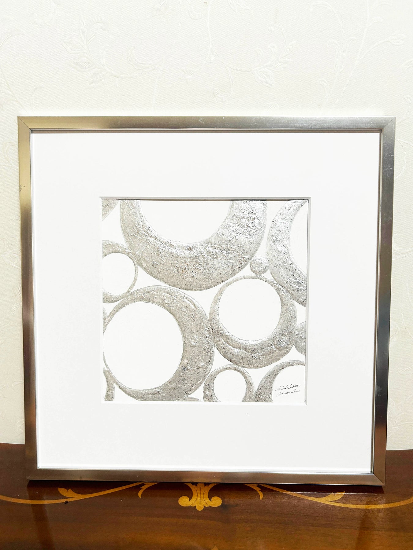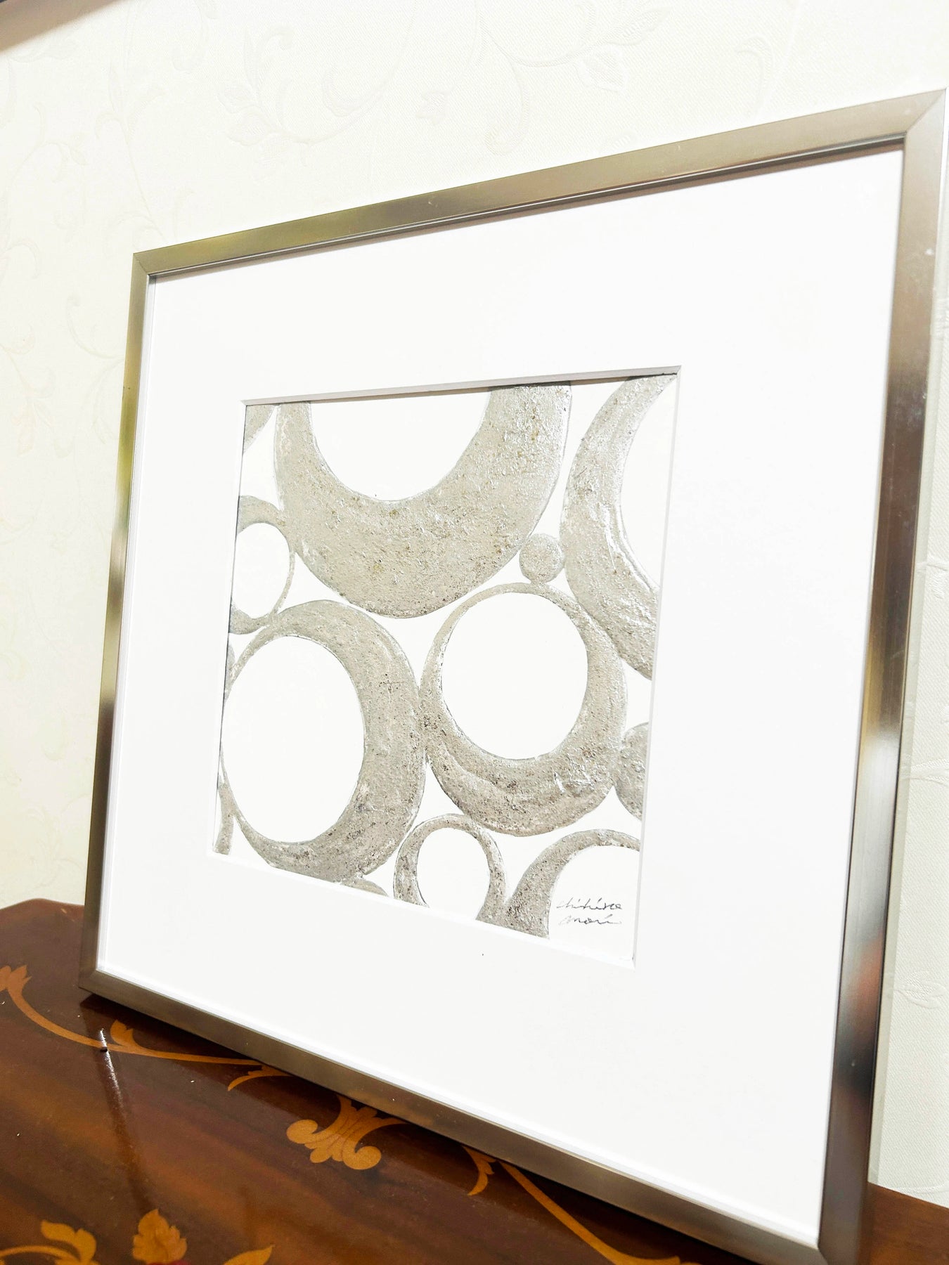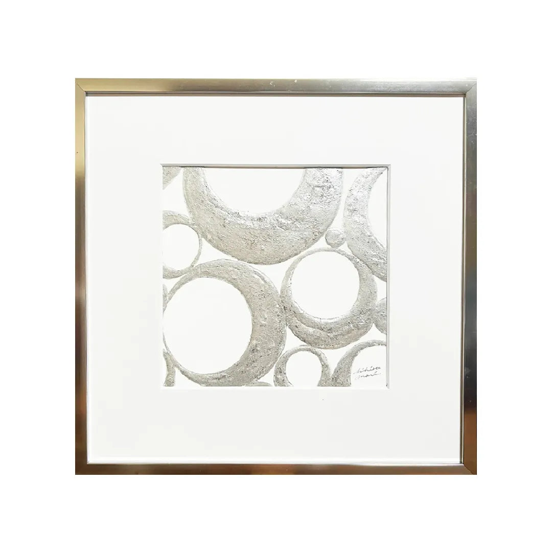 シルバーの円が重なり合い、静かなハーモニーを奏でるような作品。マットな質感と金属的な輝きが絶妙に共存し、光の当たり方によって印象を変えます。無駄のない構成の中に流れるリズムは、心を落ち着かせるような安らぎを与えてくれます。洗練されたモノトーンの美しさが際立ち、モダンな空間やホテルライクなインテリアにもぴったり。日常に静けさと上質な余白をもたらす一枚です。