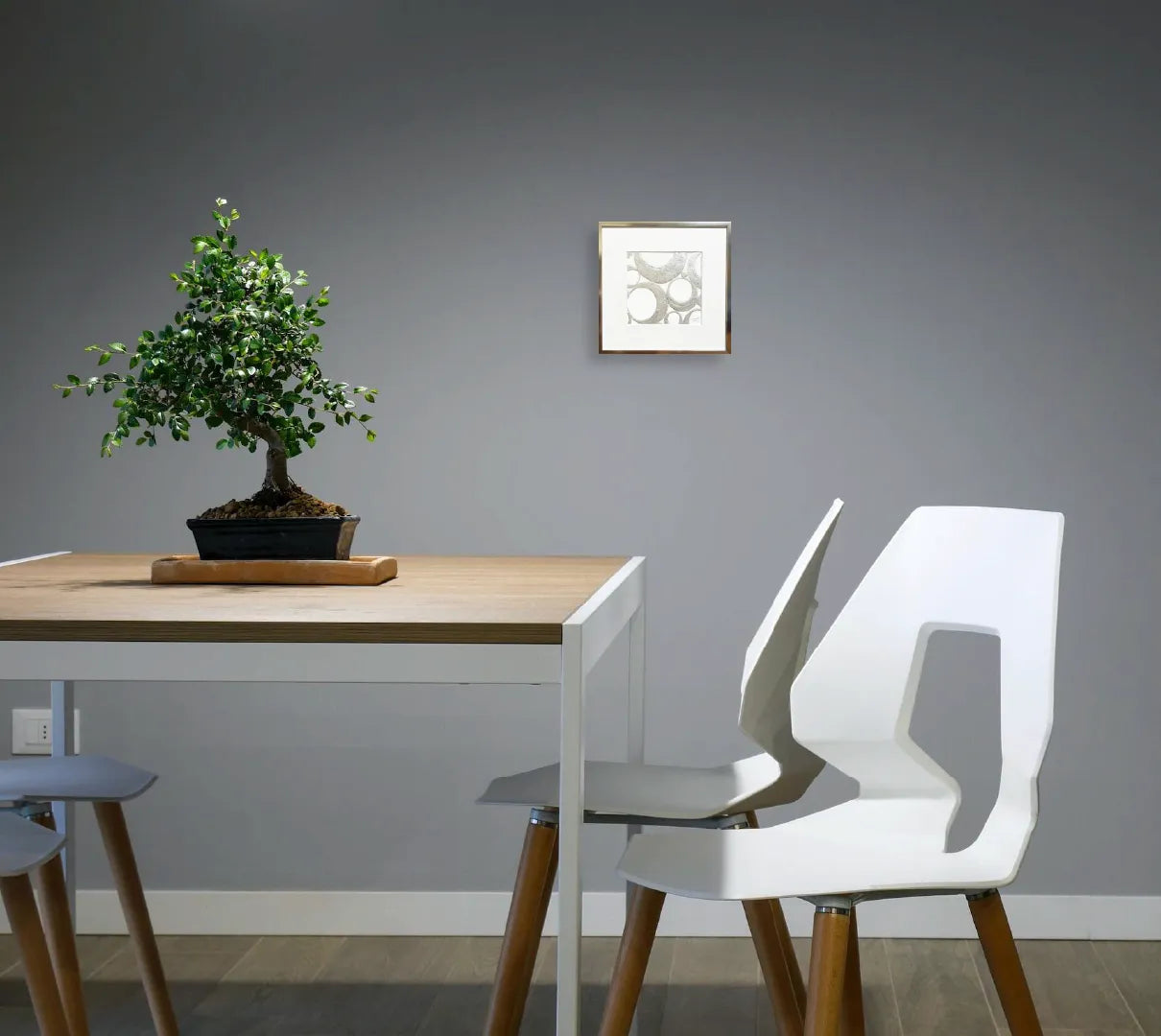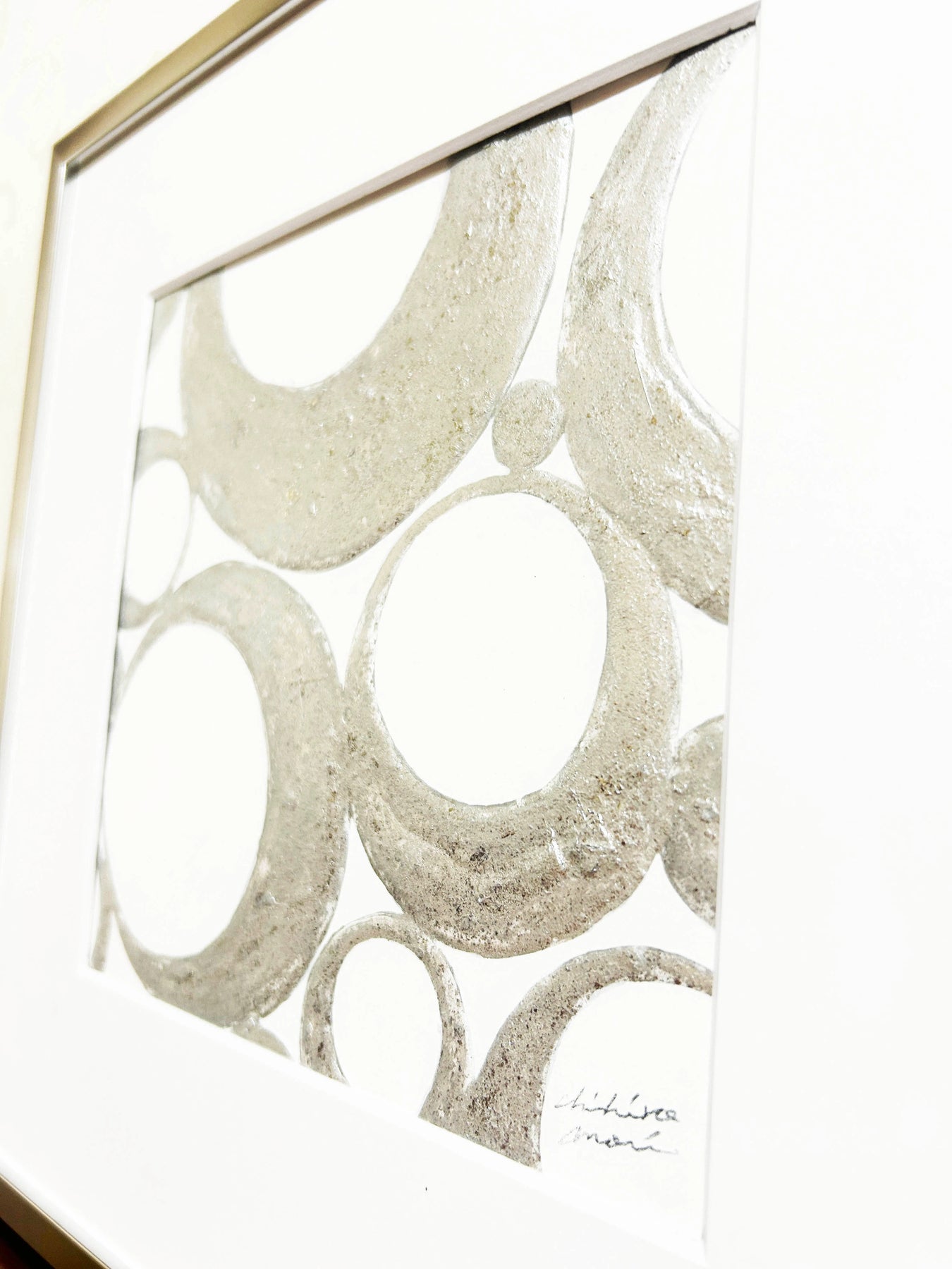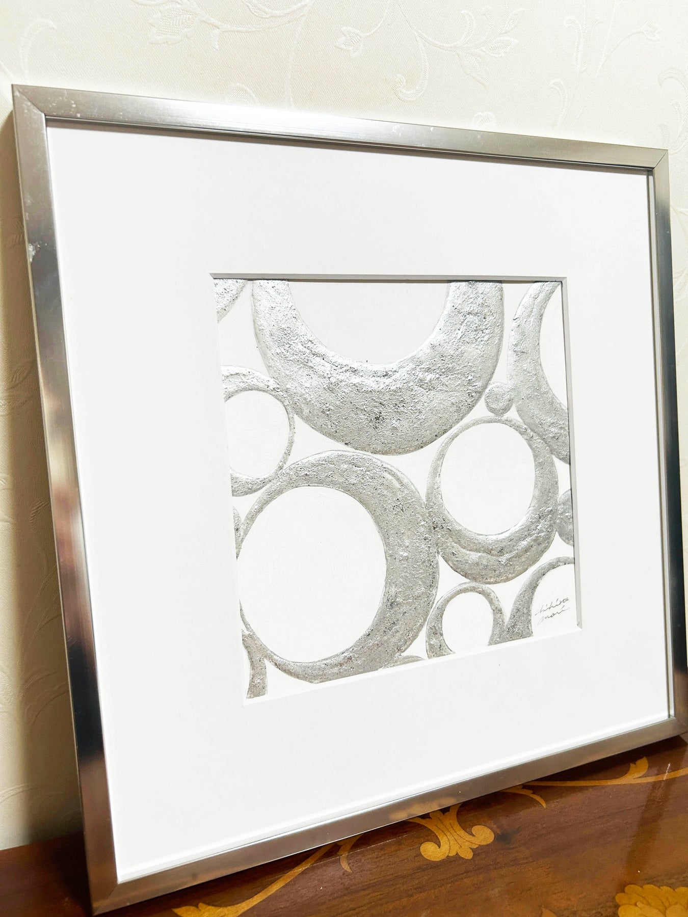 シルバーの円が重なり合い、静かなハーモニーを奏でるような作品。マットな質感と金属的な輝きが絶妙に共存し、光の当たり方によって印象を変えます。無駄のない構成の中に流れるリズムは、心を落ち着かせるような安らぎを与えてくれます。洗練されたモノトーンの美しさが際立ち、モダンな空間やホテルライクなインテリアにもぴったり。日常に静けさと上質な余白をもたらす一枚です。