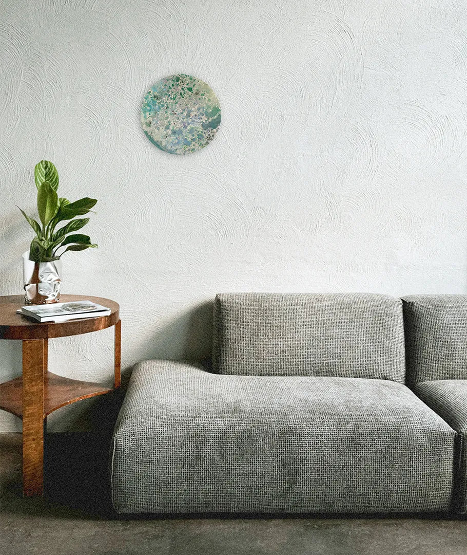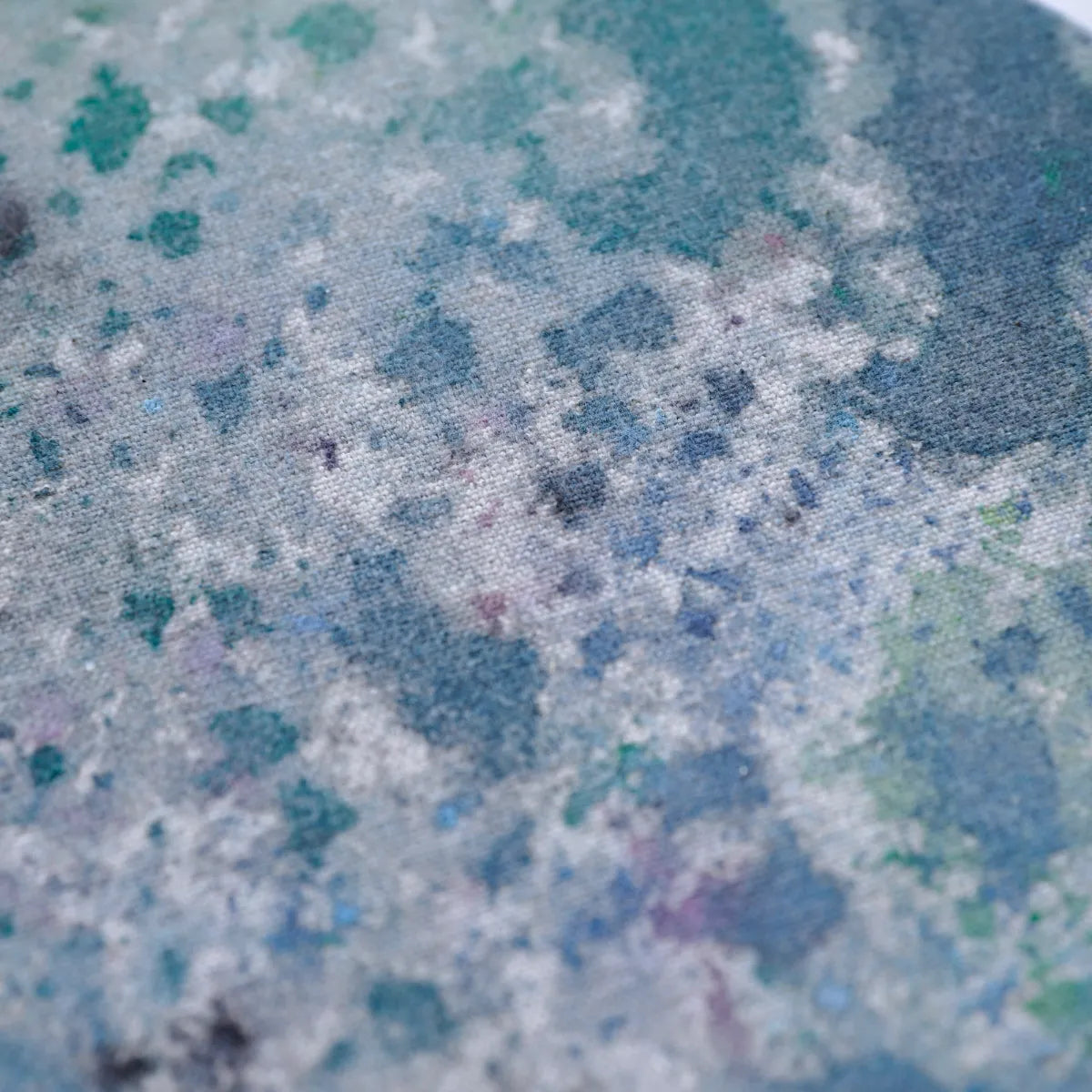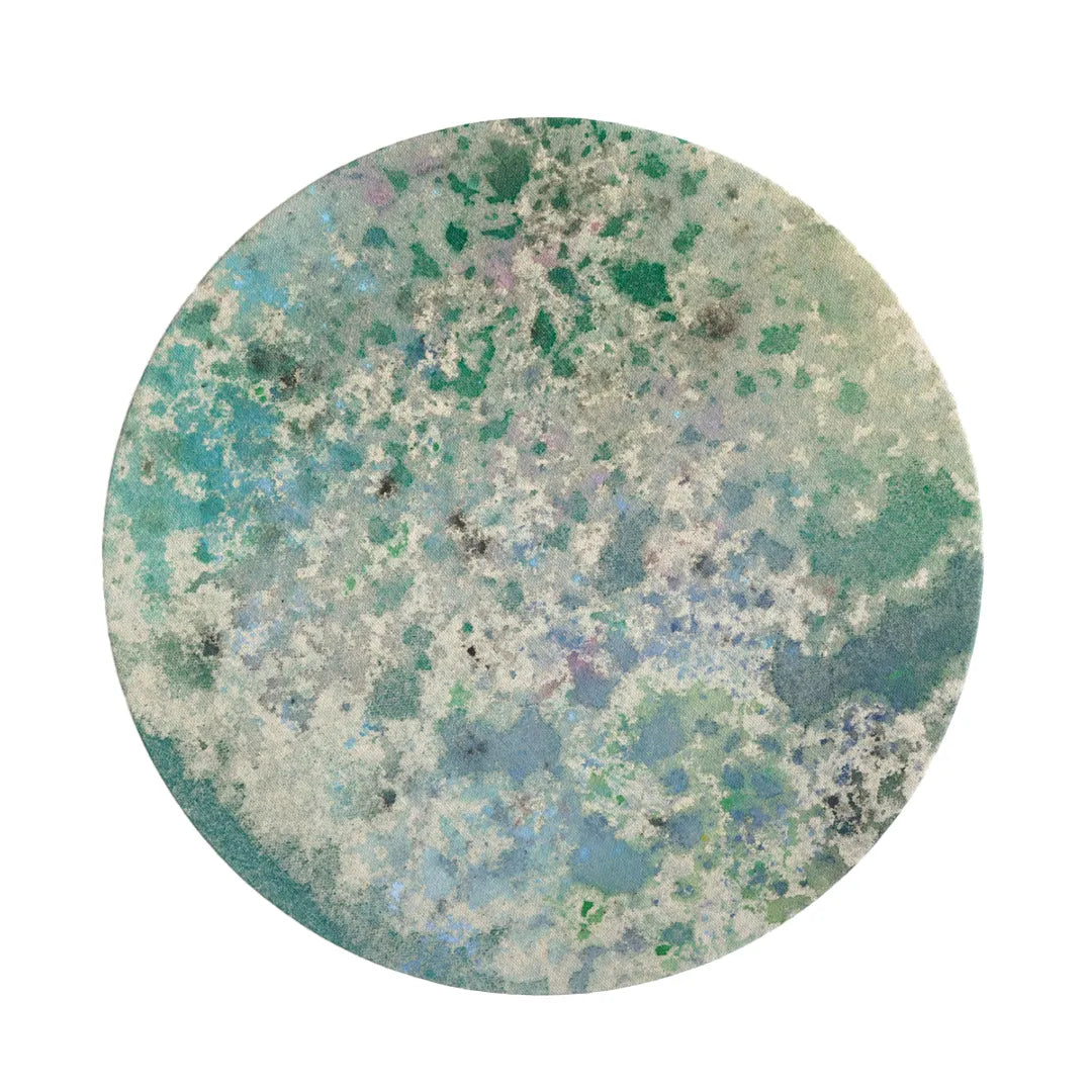 青や緑が溶け合う抽象的な模様が広がり、静かな自然の息吹を感じさせます。色の重なりが織り成す深遠な空間は、時間と共に微細な変化を見せ、飾ることで部屋の雰囲気を穏やかに包み込みます。シンプルなインテリアや自然光が差し込む空間に馴染み、心地よい静けさを与えます。
