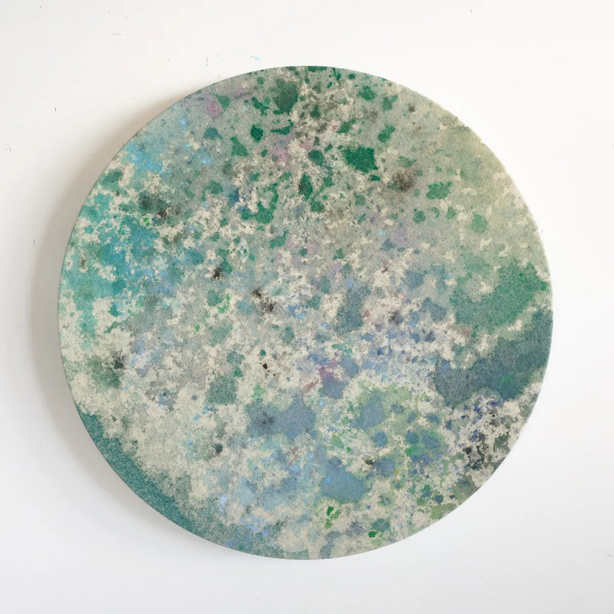 この作品群は、2025年2月5日から2月9日までのおよそ96時間、キャンバスを雪に晒し制作しました。まずは雪が降り積もり、日が登ると気温の上昇に合わせてゆっくりと融解し、気化していきます。そして日が落ちると乾燥しきれなかった雪解け水は凝固しキャンバス上に氷を張ります。全ての水分が無くなると、そこには状態変化と時間が刻んだ跡をみることができます。積もった雪はもしかしたら海の向こうの国で流れていた川から来たかもしれない。蒸発した雪はもしかしたら自分が息を吸った時に身体に入り込んだかもしれない。雪が降り、溶けて消えていく。ここに地球の循環と自分の接点を垣間見た気がしました。