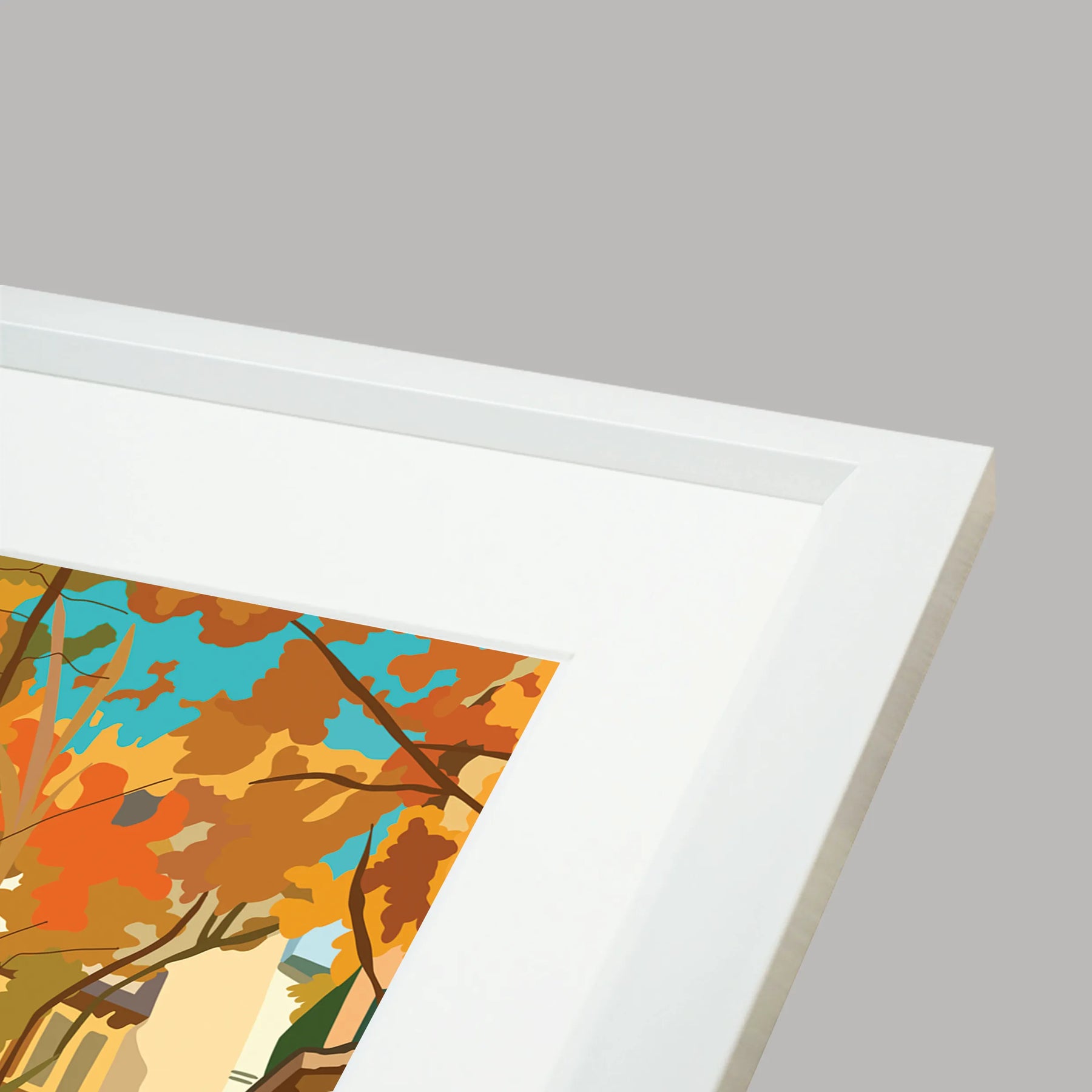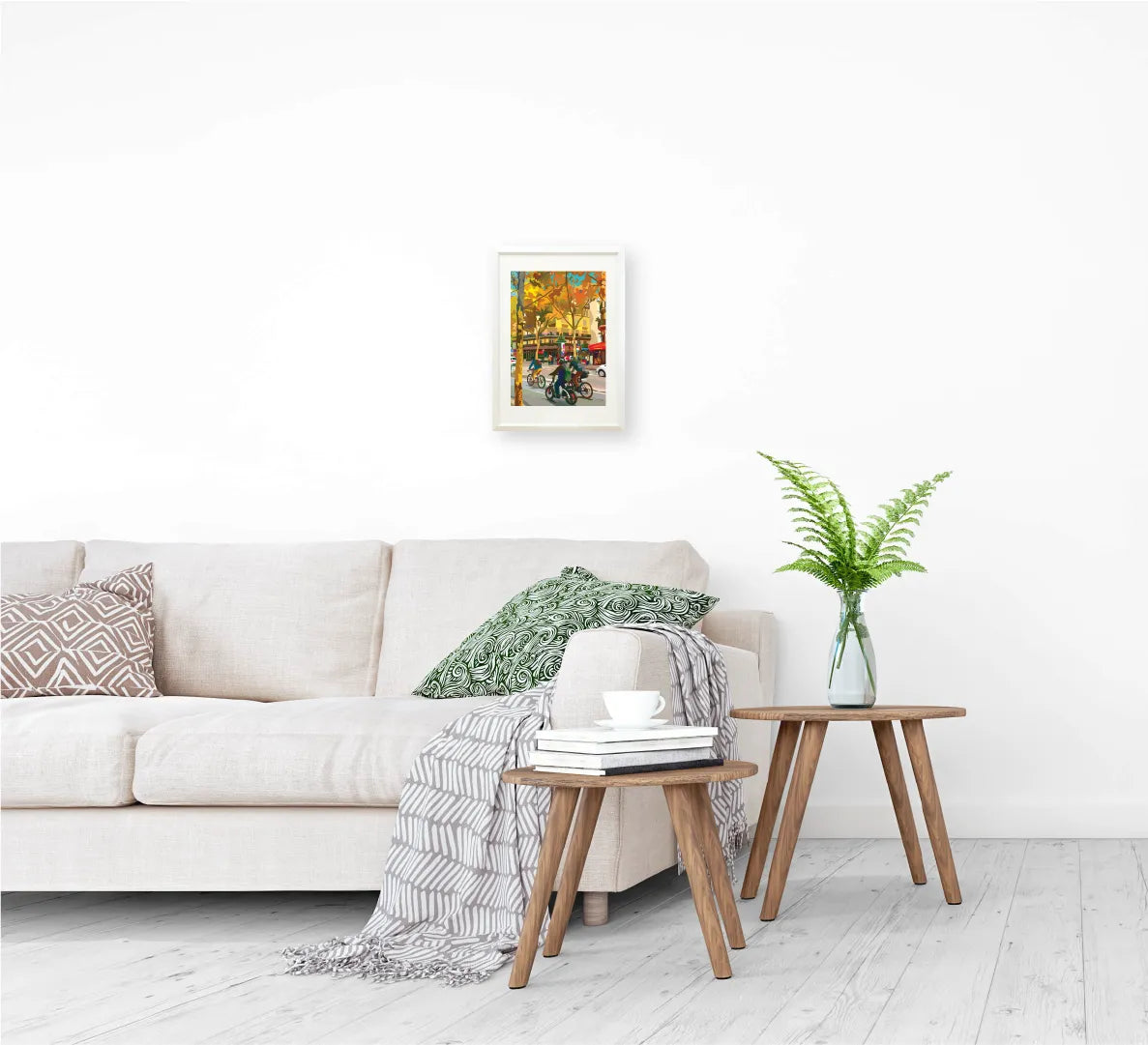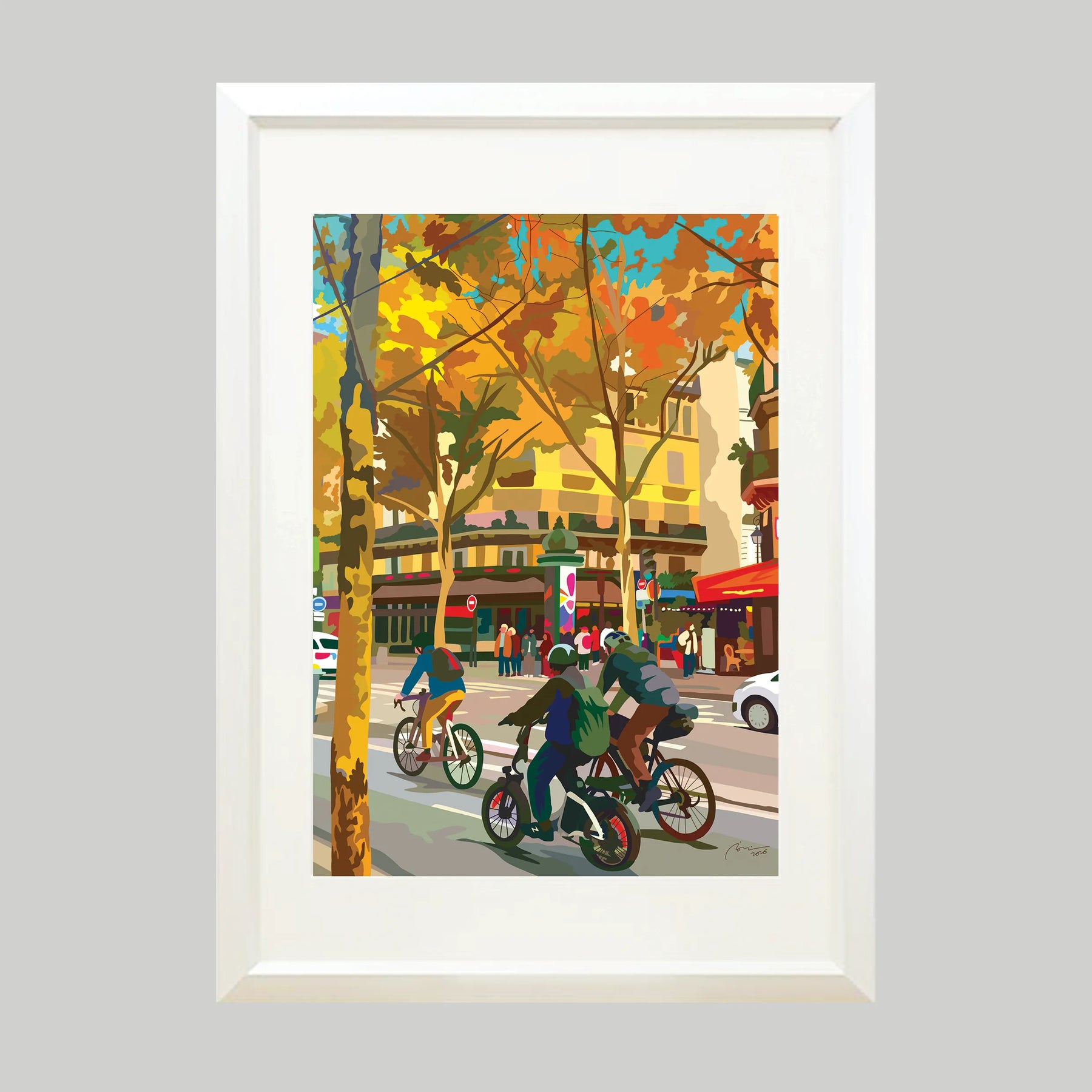 黄金色に染まった並木道と街角のにぎわいを、温かな色彩で描いた都市風景の作品です。自転車で走り抜ける人々の動きが、空間に軽やかなリズムと季節の空気を運びます。リビングやダイニング、玄関に飾ると空間に明るい奥行きが生まれ、ナチュラルモダンや北欧インテリアの空間に心地よく調和します。