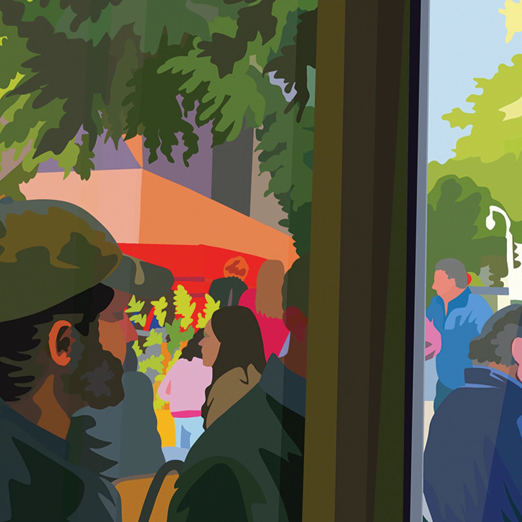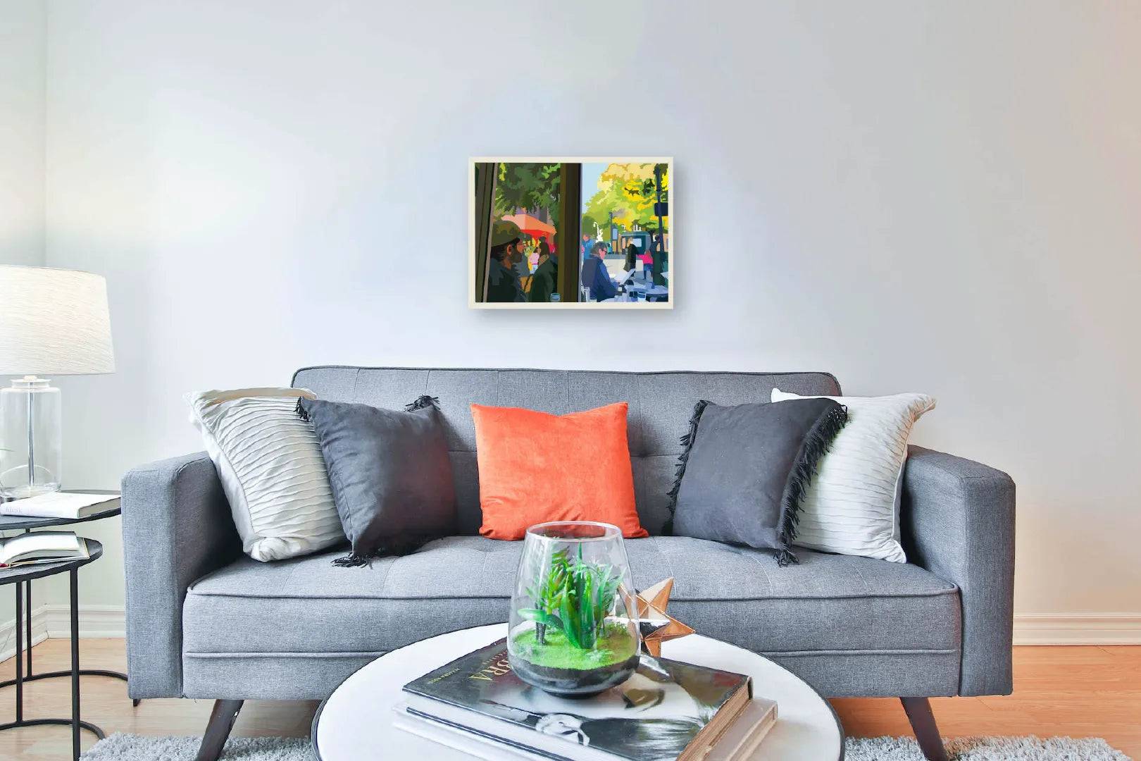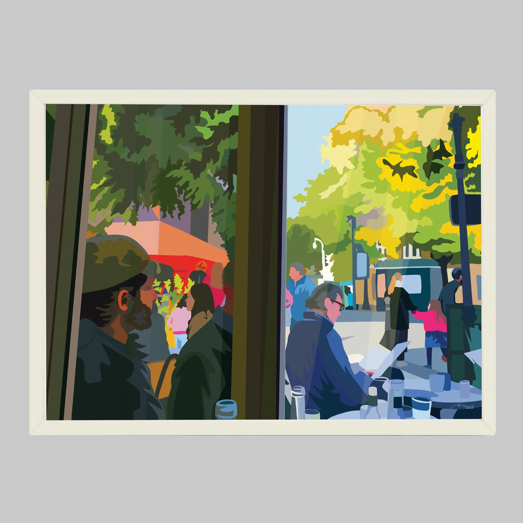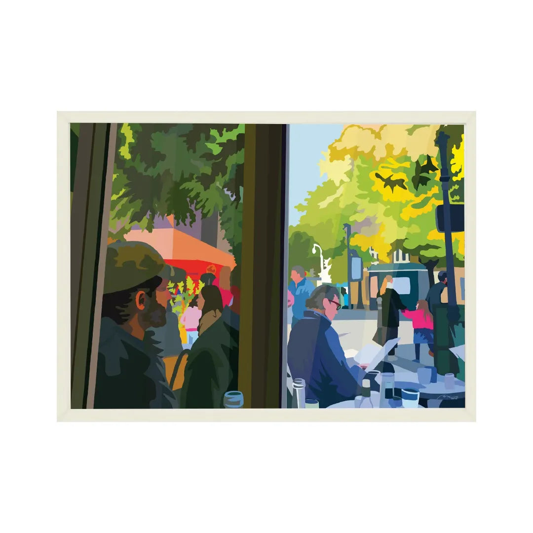 窓越しに広がる街のカフェ風景を、やわらかな光と緑の色彩で描いた作品です。人々の気配や穏やかな時間の流れが感じられ、空間に軽やかな奥行きとストーリーを生み出します。リビングやダイニング、ワークスペースなど、モダンインテリアや北欧インテリアの空間に飾ると心地よい都会の空気感を添えてくれます。