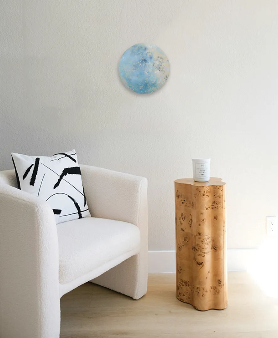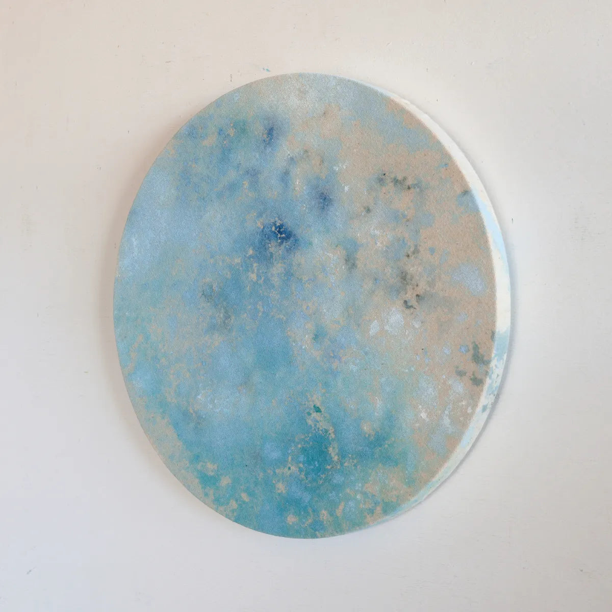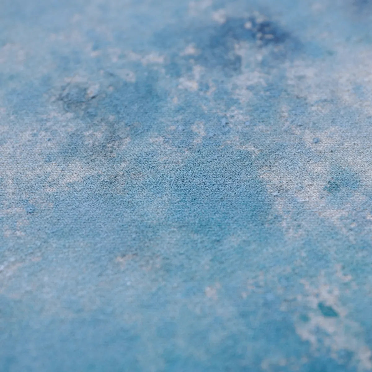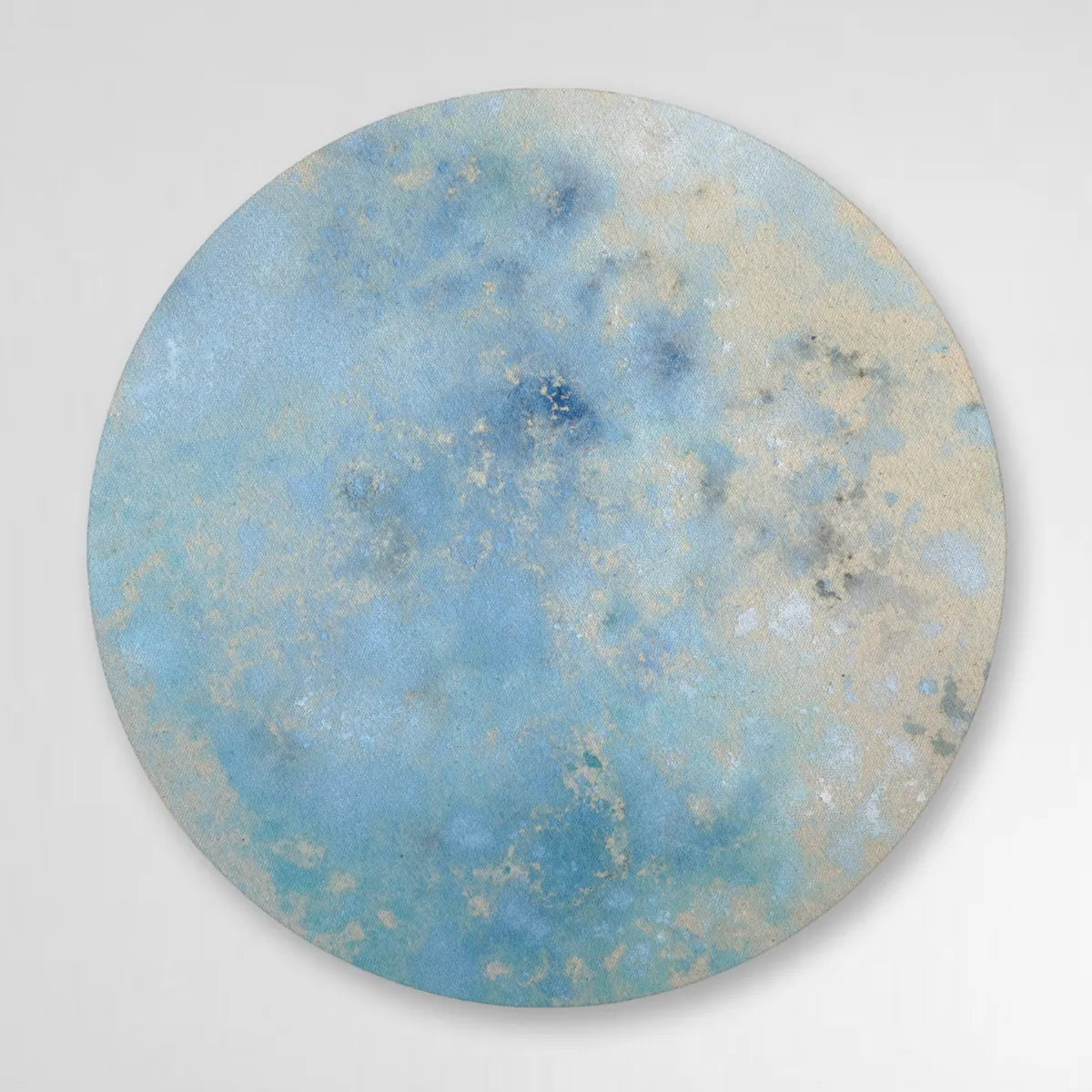 静けさと広がりを感じさせる柔らかなブルーのグラデーションが広がり、まるで水面に漂う雲のような印象を与えます。淡い色調の中に、微細な金属的な輝きが混じり、時間の流れを感じさせるような温かみがあります。部屋に飾ることで、空間に軽やかな安らぎが広がり、視覚的にリフレッシュされることでしょう。リビングや書斎に自然と溶け込み、シンプルでありながらも奥行きのある雰囲気を作り出します。