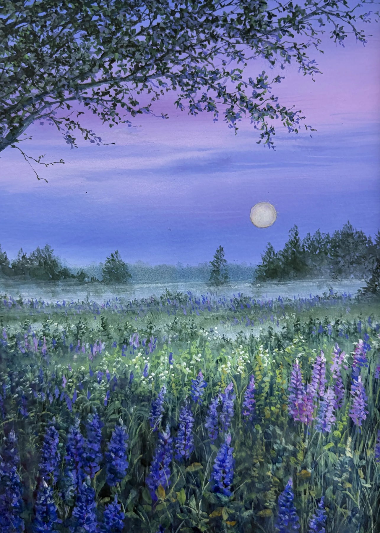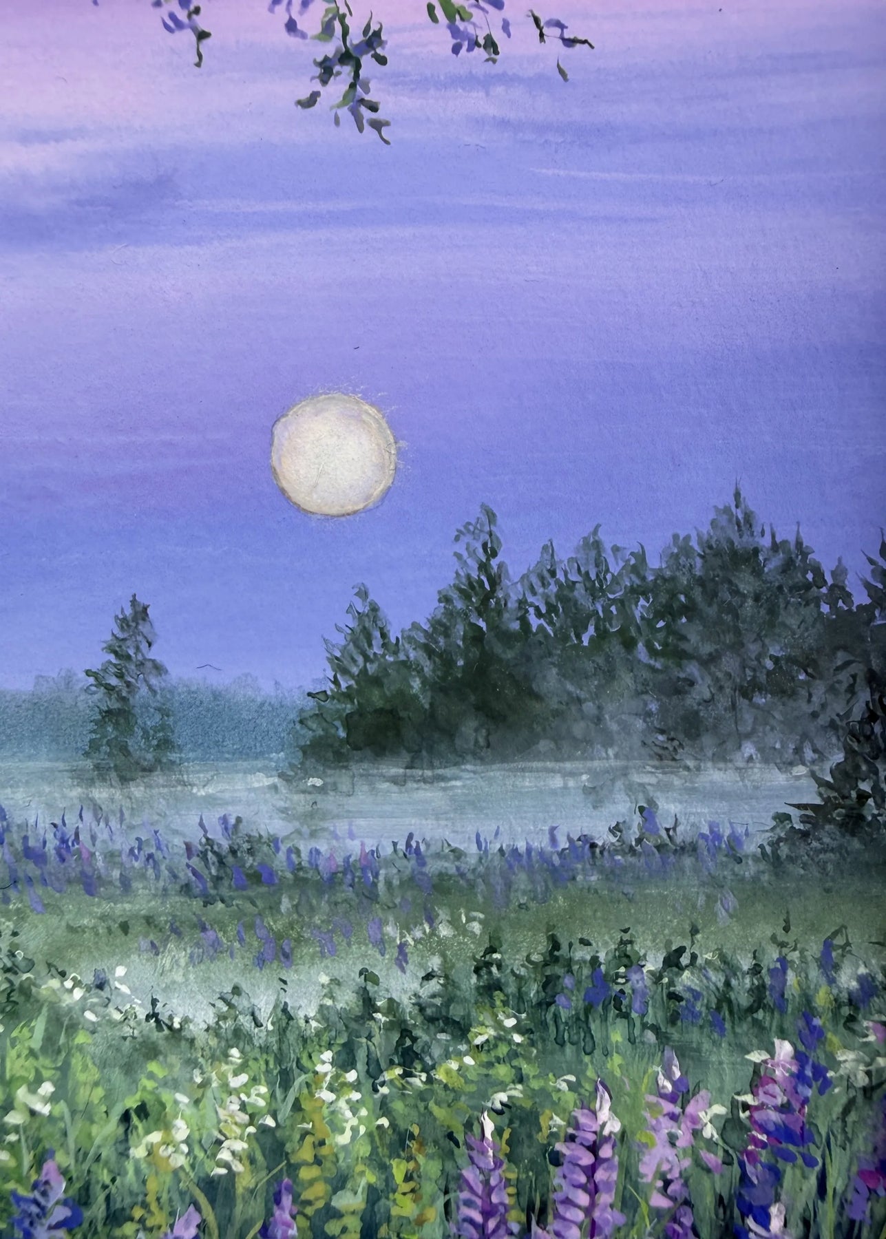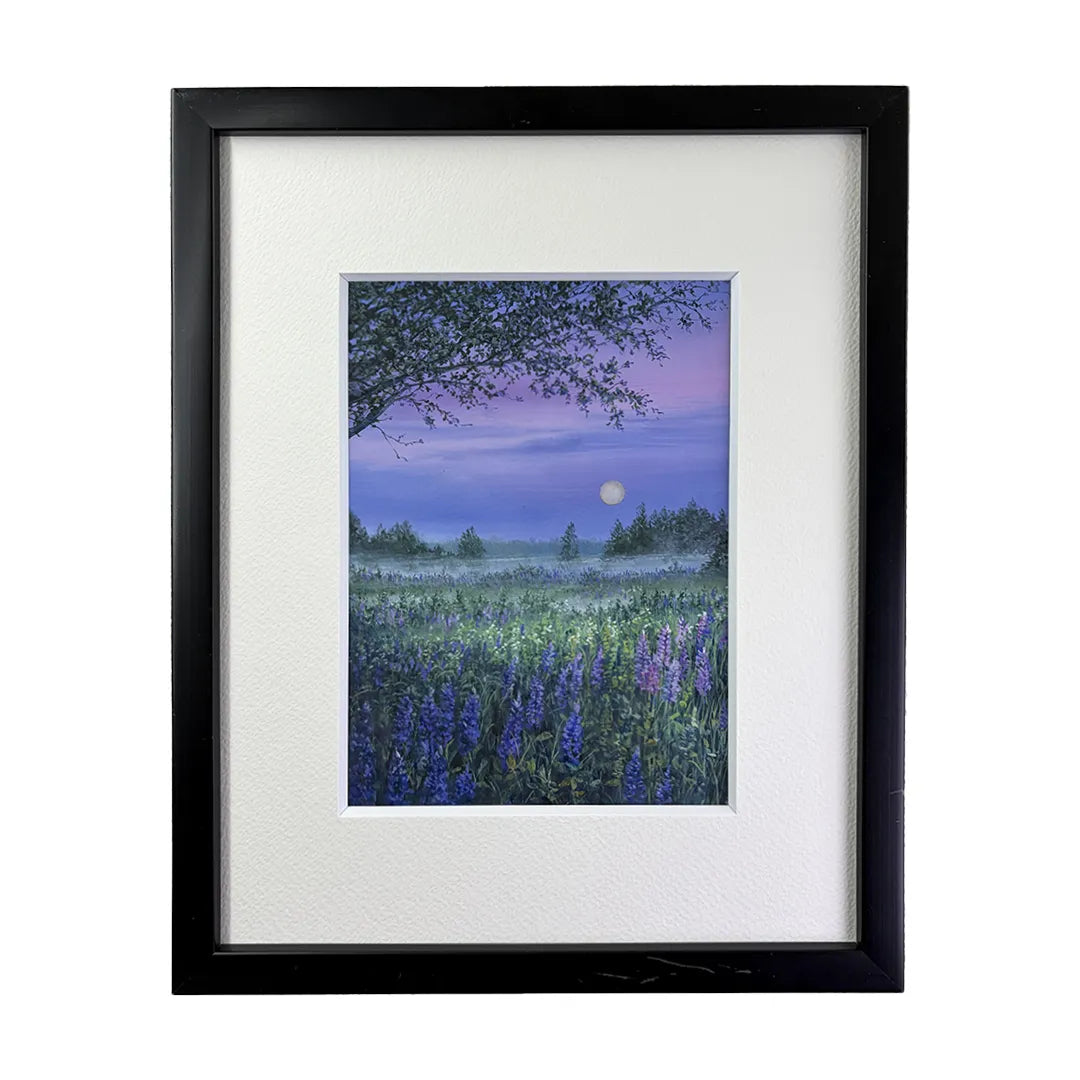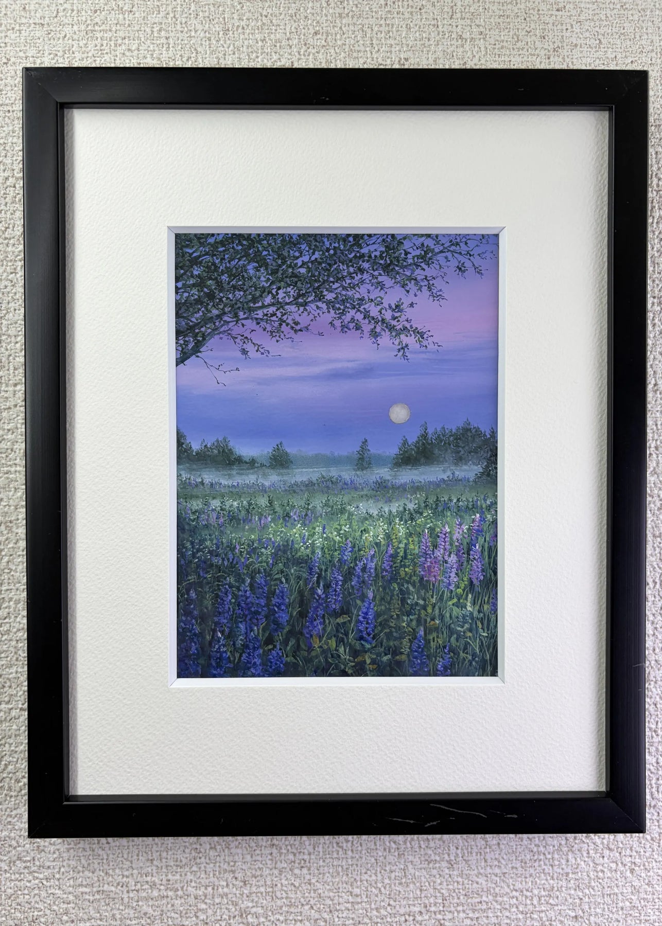 月光がふんわりと降り注ぎ、花々はその輝きに包まれています。優しい紫と青が広がる空と草原に、夜の静けさがただよう中、柔らかな風が草を揺らし、心を穏やかにするひとときです。飾ることで、部屋に夜の風景が流れ込み、空間が穏やかな安らぎを迎えます。寝室やリビングに置くと、落ち着いた雰囲気を演出し、木製の家具やシンプルなテクスチャーとの相性がよく、穏やかな時間を感じさせてくれます。