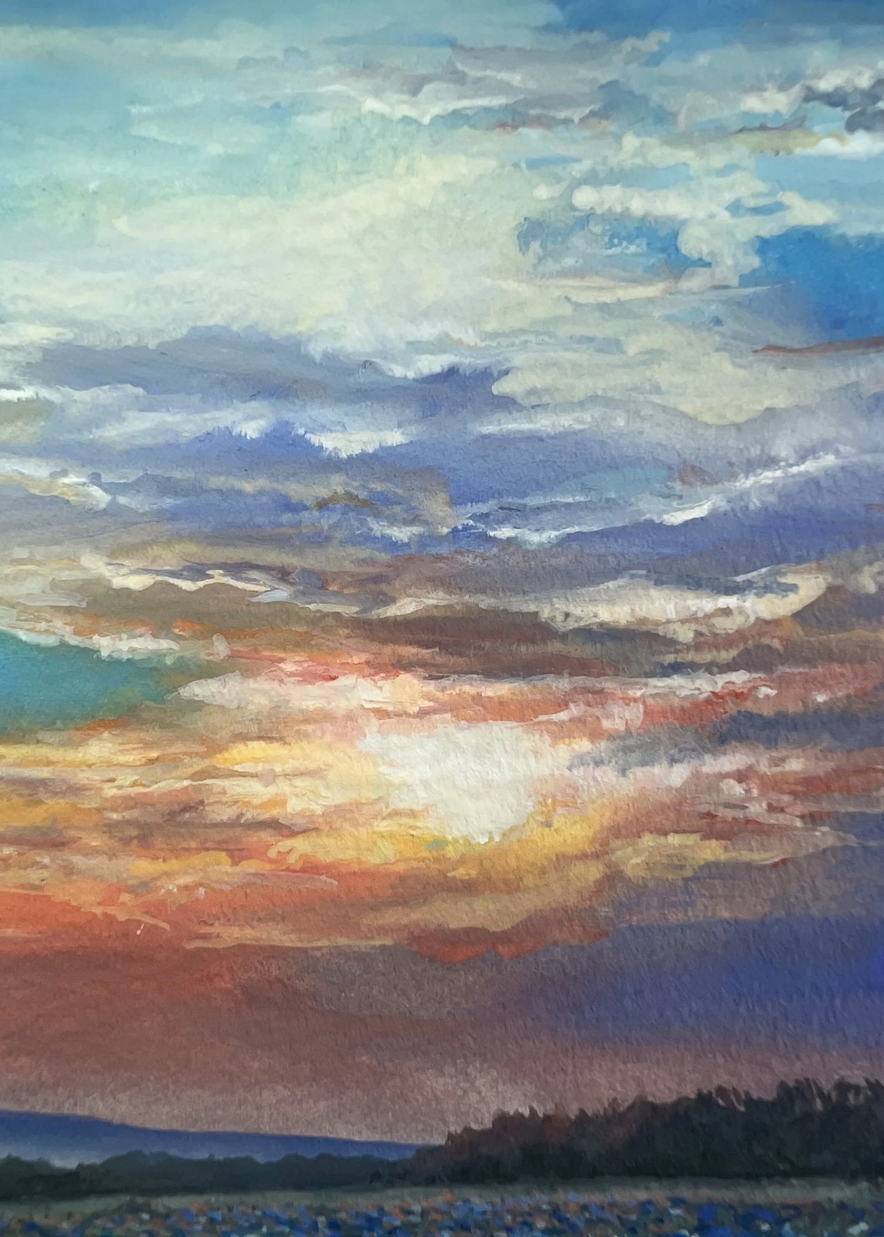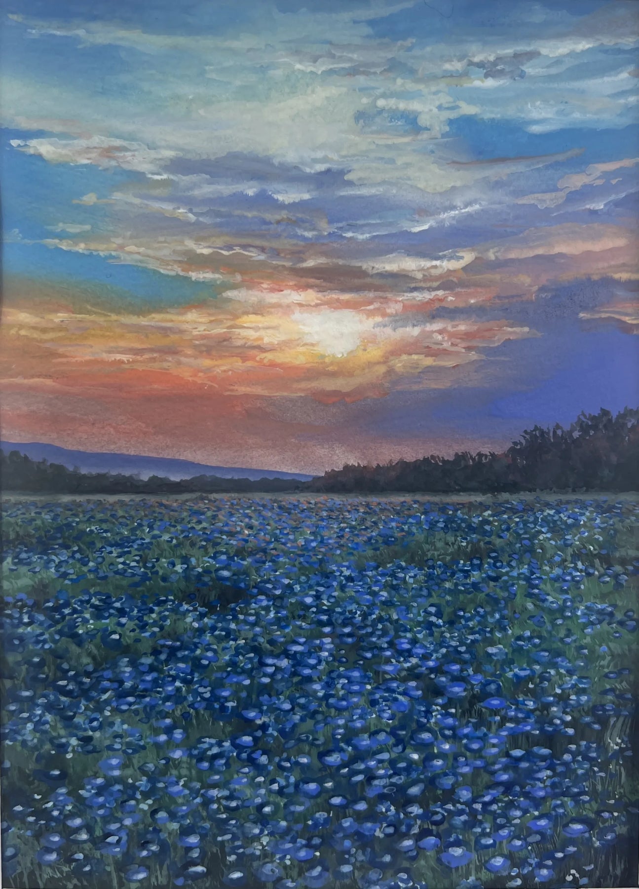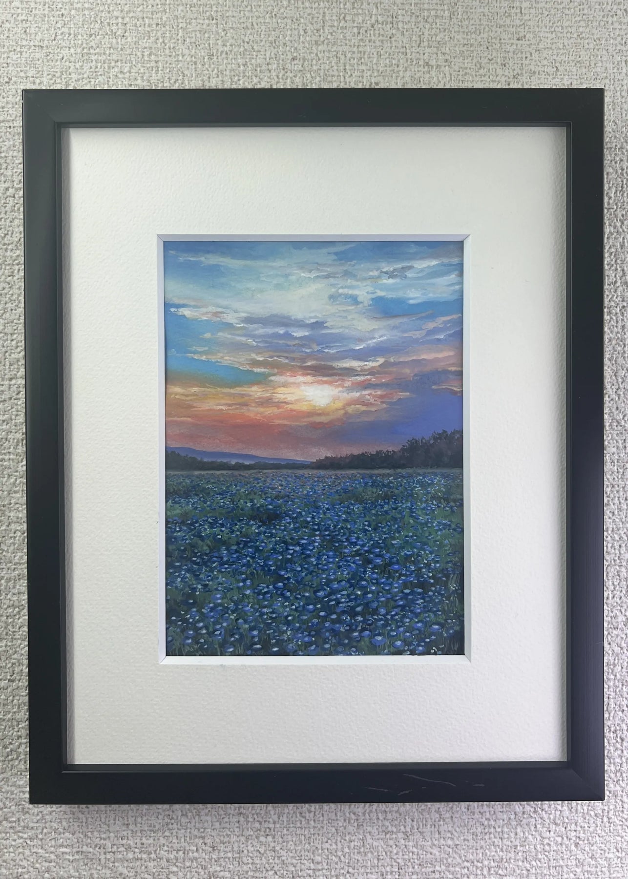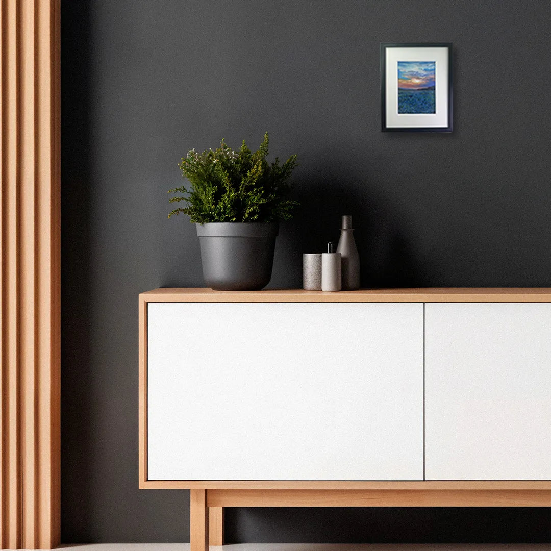 空は重なり合う雲に夕光を宿し、野に広がる青い花々が、静かな波のように揺れています。昼と夜の境で交わる色彩が、胸の奥に温度を残します。壁に掛けることで、時間の移ろいが室内に溶け込み、呼吸が整う感覚をもたらします。ダイニングや書斎に置くと、無垢材の家具や落ち着いた布地と調和し、穏やかな景色が日常に寄り添います。