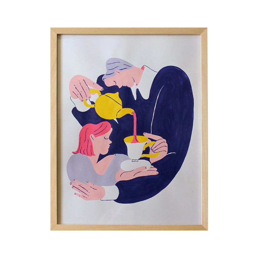 ティーポットを傾けてお茶を注ぐ姿は、日常の一コマが切り取られたようで親しみやすさがあります。全体的に曲線で描かれた丸いフォルムからは優しさや、あたたかさが感じられますね。