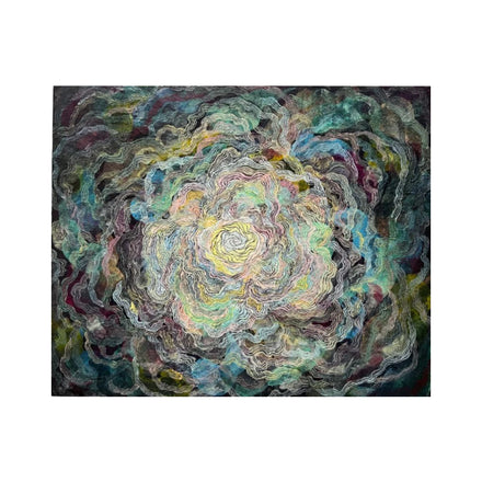 音楽との親和性も高く、CDジャケット制作など多方面で活躍。画面を埋め尽くす無数の線が織りなす繊細なリズムは、観る者の視覚を静かに研ぎ澄ます。静謐さと圧倒的な密度が共存する、現代の写経にも似た精神性を宿す抽象画である。