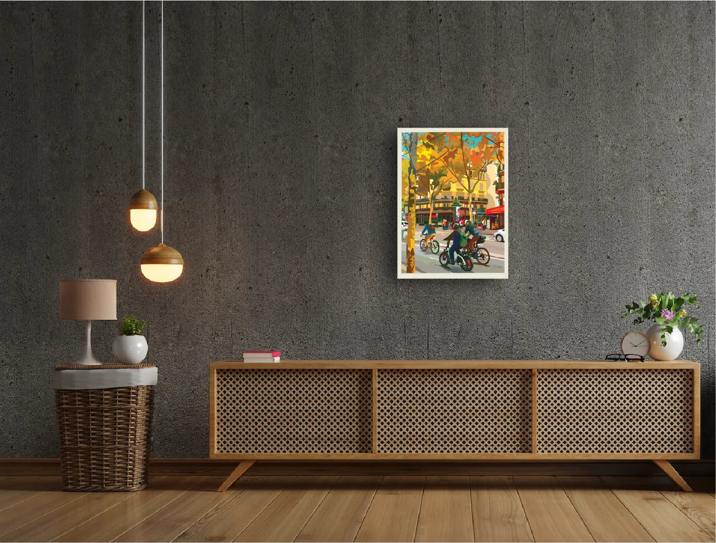 色づいた並木と街角の風景を、あたたかな色彩で描いた都市風景の作品です。自転車で行き交う人々や穏やかな街の空気が、空間に季節の奥行きと軽やかな動きを生み出します。リビングやダイニング、玄関に飾ると空間に温もりと開放感が生まれ、ナチュラルモダンや北欧インテリアの空間に心地よく馴染みます。
