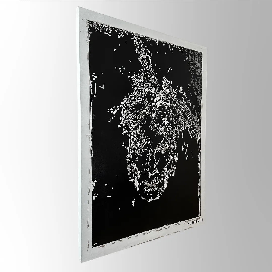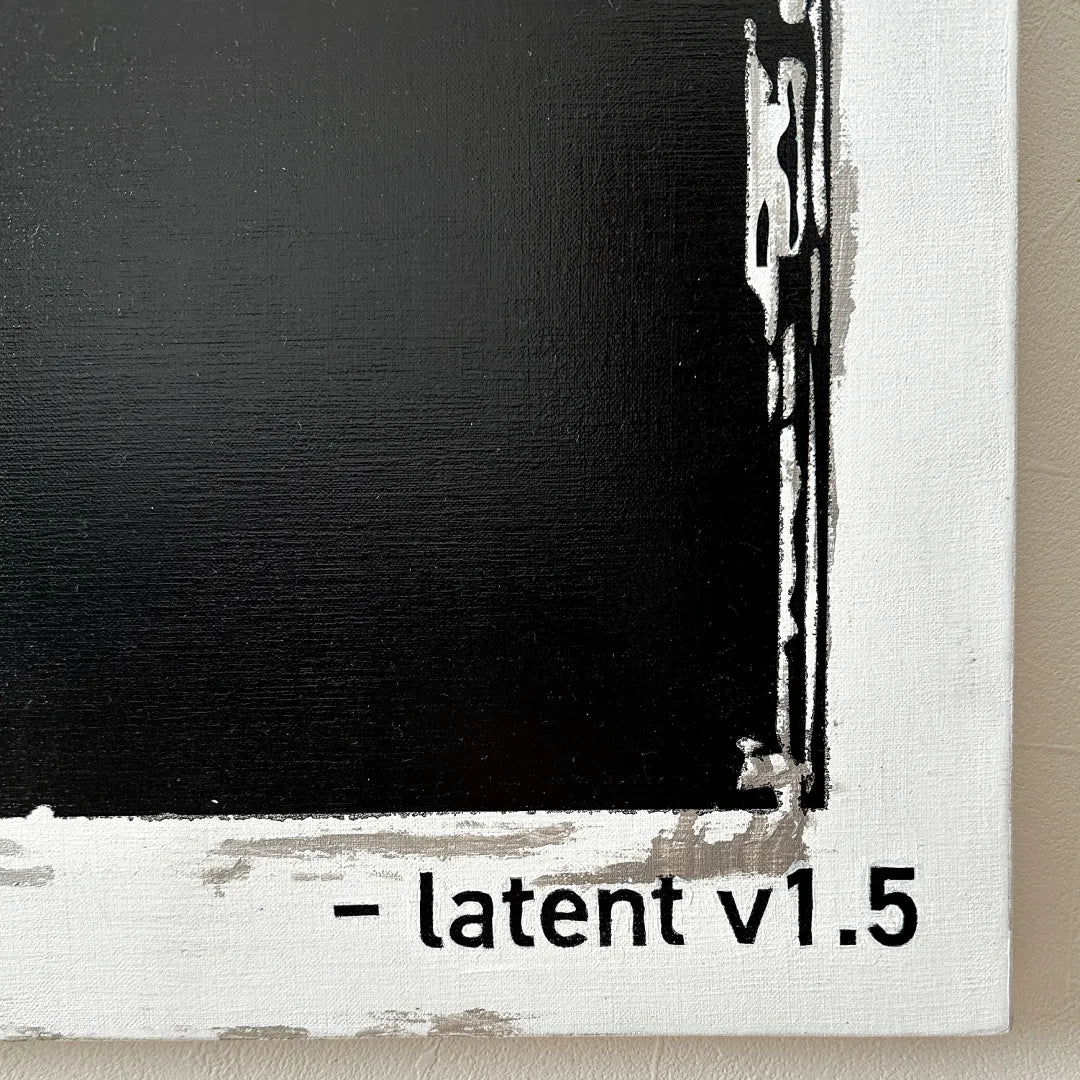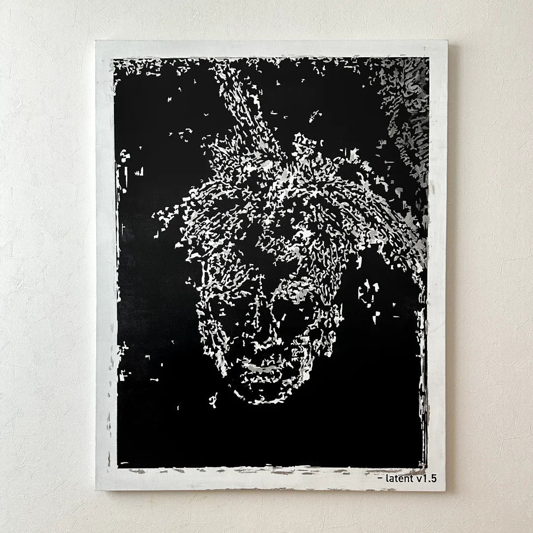 - アンディ・ウォーホルのポートレートから、AIが認識した特徴量(latent)を差し引き、再構成したペインティング。生成AIが画像を潜在空間(latent space)へ圧縮し、確率的に再構成した過程で生じた差異―AIが“重要ではない”と判断した情報のみを抽出。これらは、AIにとっては誤差やノイズですが、私たちは、この断片からでも、顔の気配や人間らしさを感じ取ります。 ウォーホルは芸術を表層へと還元しました。現在、AIもまた、膨大な計算によって世界を表層的に処理しています。ウォーホルの肖像から、AIによる表層を引いたとき、そこに残るものは何でしょうか。 ※ 「-latent v1.5」のv1.5は、Stable Diffusionのバージョンを示しています。
