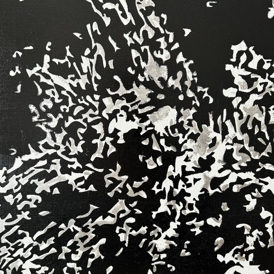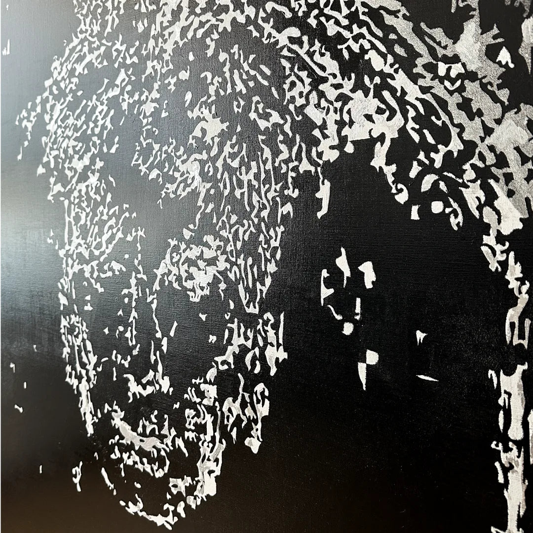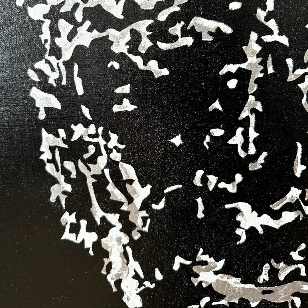 漆黒の闇から無数の白い飛沫が立ち上がり、思索に耽る人物の輪郭を星々の瞬きのように描き出しています。静寂の中に宿る激しい熱量を封じ込めたようなマチエールは、眺めるほどに内なる可能性を呼び覚ましてくれるでしょう。この力強い一作を飾ることで、室内には知的な重厚さが加わり、空間に凛とした風格を授けます。書斎や応接間に、モノトーンのモダンな設えと合わせるのが最適です。