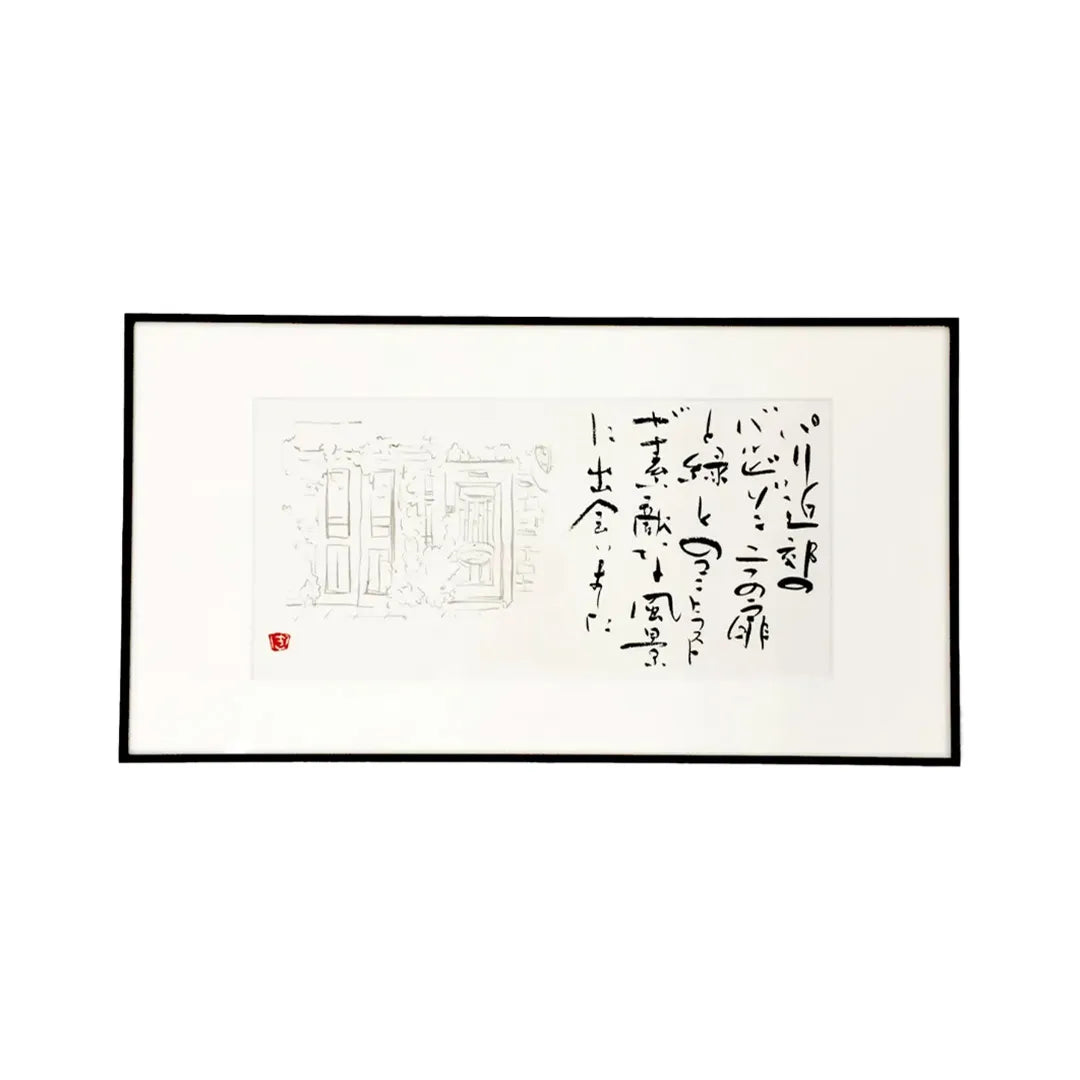 ⬛︎About the Work Created with the image of an airmail letter from the French artists' village of Barbizon. The soft expression of the painting rendered in pale ink and the powerful presence of the brush-written characters in dark ink create a pleasing contrast on the page. The signature uses hiragana in a picture-letter style, lending a gentle, unified feel to the whole. This piece cherishes a nostalgic yet distinctly contemporary atmosphere.