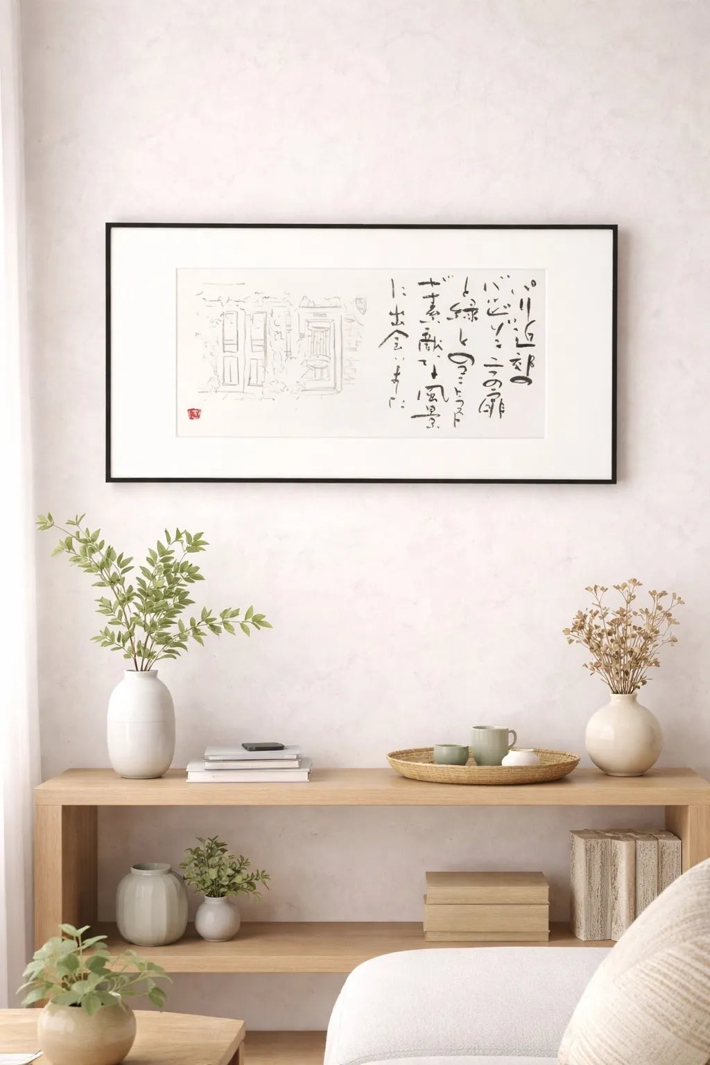 ⬛︎As Interior Decor The black steel frame allows it to blend naturally into Western-style rooms or modern spaces. Displayed in a study, living room, or any space for quiet reflection, it becomes an accent evoking travel, letters, and the margins of time. While a calligraphy piece, it can be casually enjoyed as an art piece.