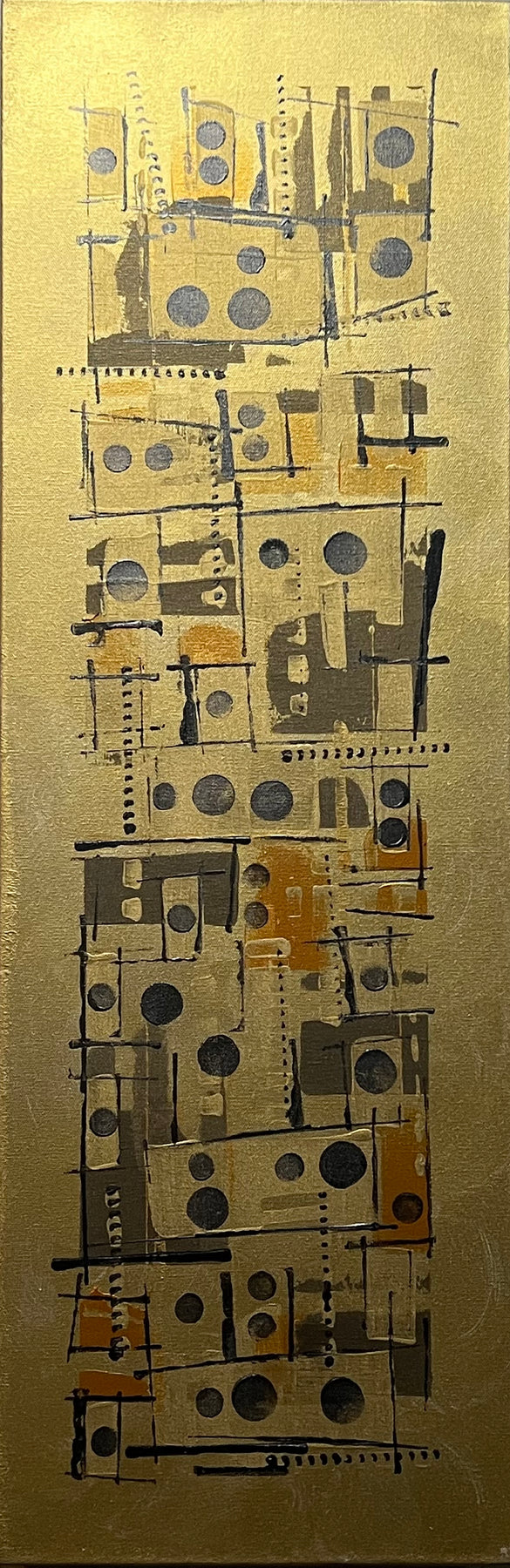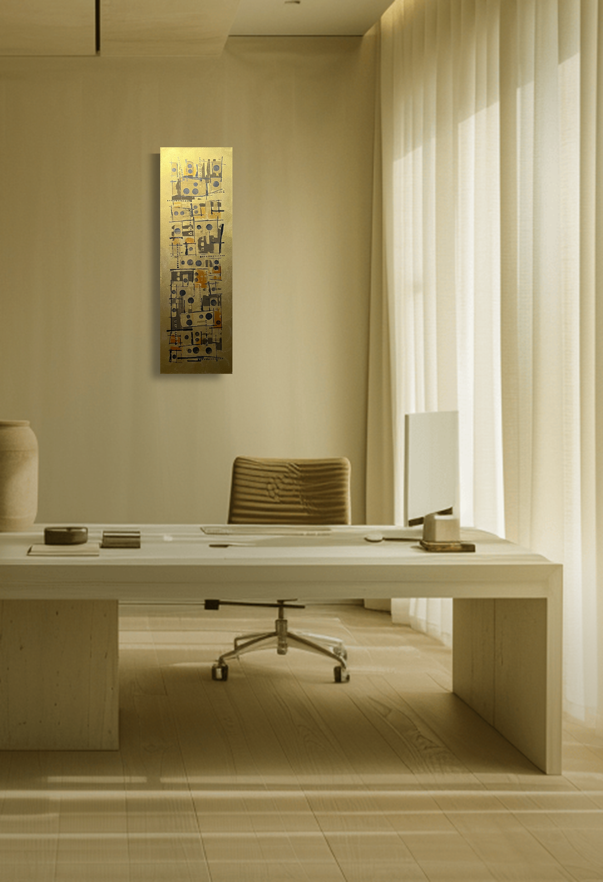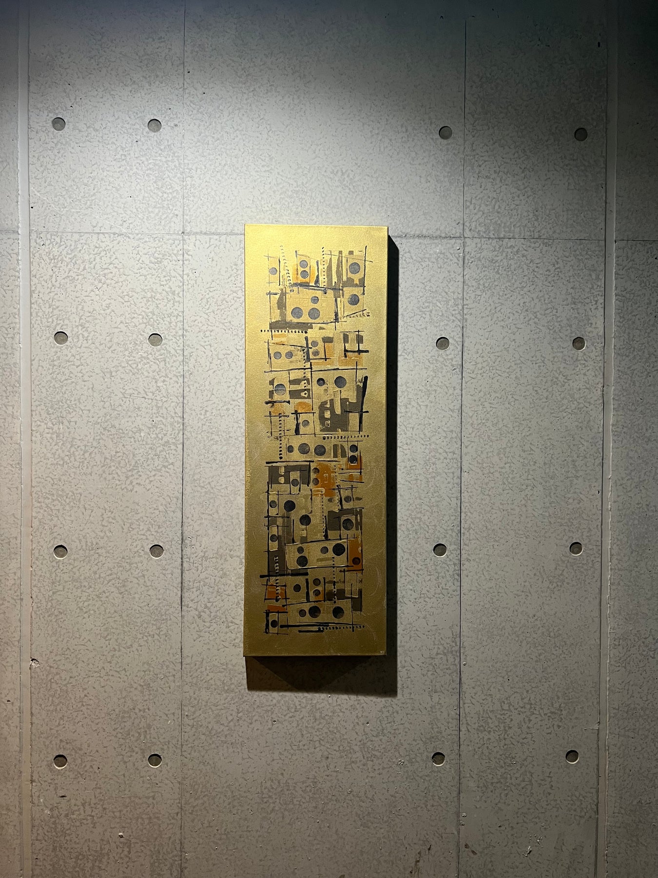 眩い金箔を背景に、緻密なドットと直線が織りなす構成が、まるで未来を予見する基盤や古の古文書のような神秘性を放っています。深みのあるテラコッタやグレーの色彩が、秩序の中に情緒的な温もりを添え、眺めるほどに思考が研ぎ澄まされるような知的な時間をもたらしてくれるでしょう。この一作を飾ることで、空間に心地よい緊張感と風格が宿り、日常の景色を一段と高潔なものへと昇華させてくれます。オフィスやリビングに、ミッドセンチュリー調の家具と設えるのが最適です。