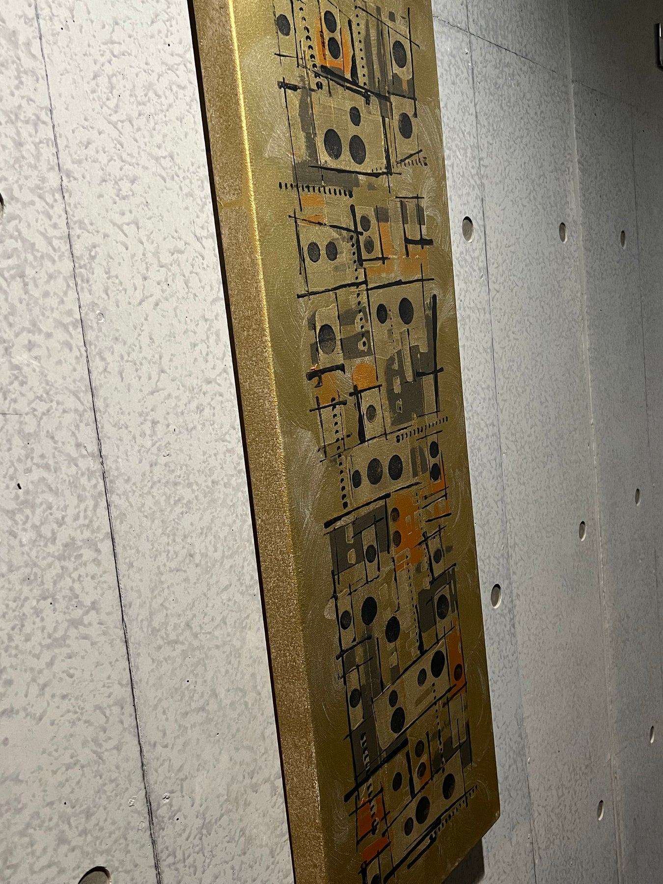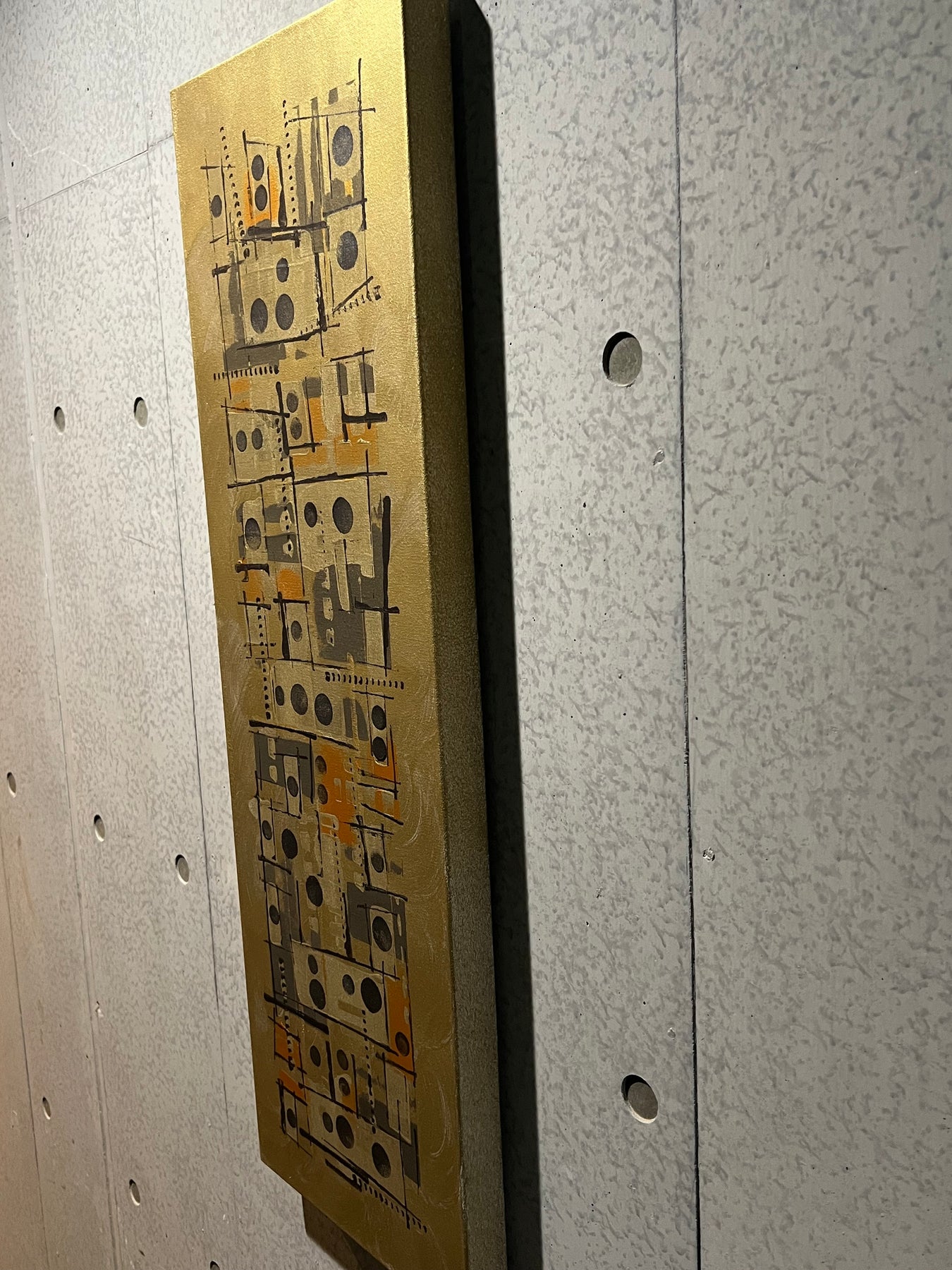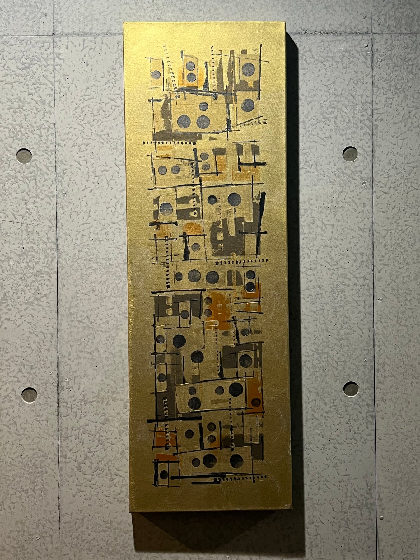 眩い金箔を背景に、緻密なドットと直線が織りなす構成が、まるで未来を予見する基盤や古の古文書のような神秘性を放っています。深みのあるテラコッタやグレーの色彩が、秩序の中に情緒的な温もりを添え、眺めるほどに思考が研ぎ澄まされるような知的な時間をもたらしてくれるでしょう。この一作を飾ることで、空間に心地よい緊張感と風格が宿り、日常の景色を一段と高潔なものへと昇華させてくれます。オフィスやリビングに、ミッドセンチュリー調の家具と設えるのが最適です。