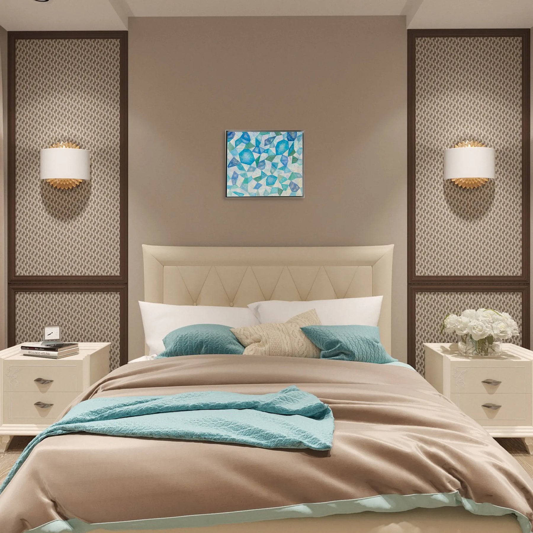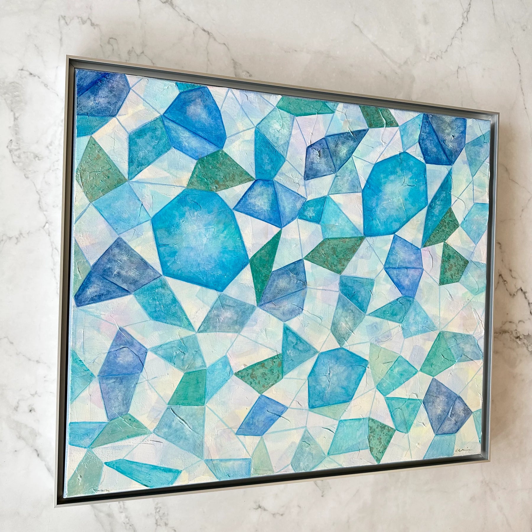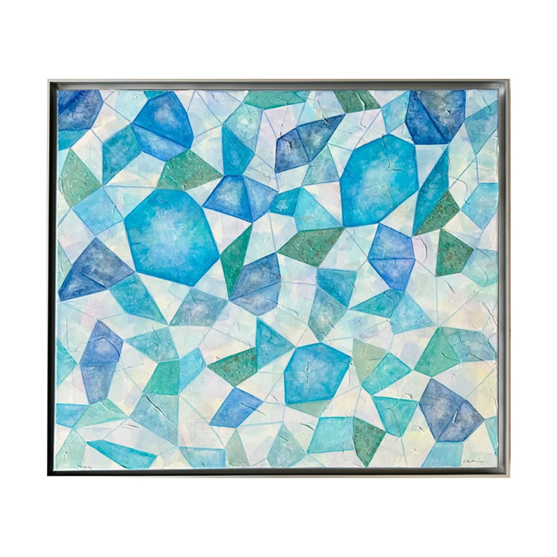 結晶を連想する不揃いな粒が画面全体に描かれた本作品。ブルーやパープルで淡く色付けられたシェイプの数々は、柔らかな光を受け、輝いているようにみえます。グリーンやブルーなどのインテリアに合わせることで、お部屋の雰囲気を一段と洗練した雰囲気に。初めてのアート購入にもおすすめの一枚です。