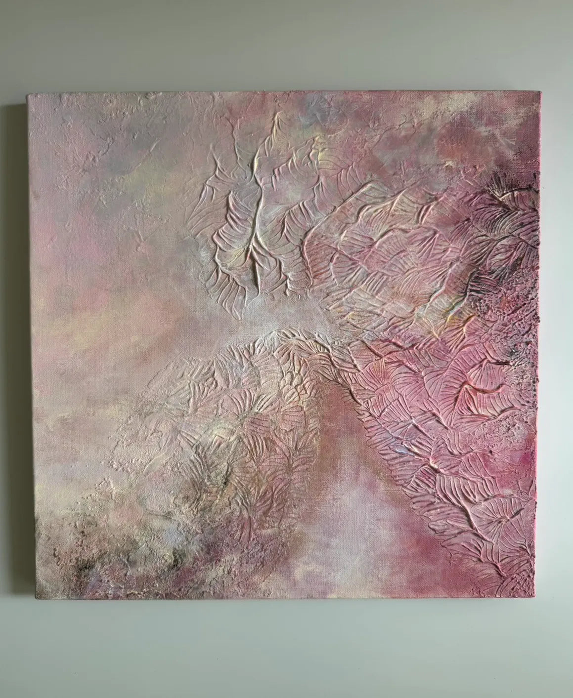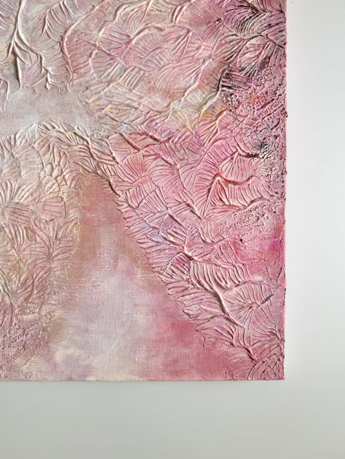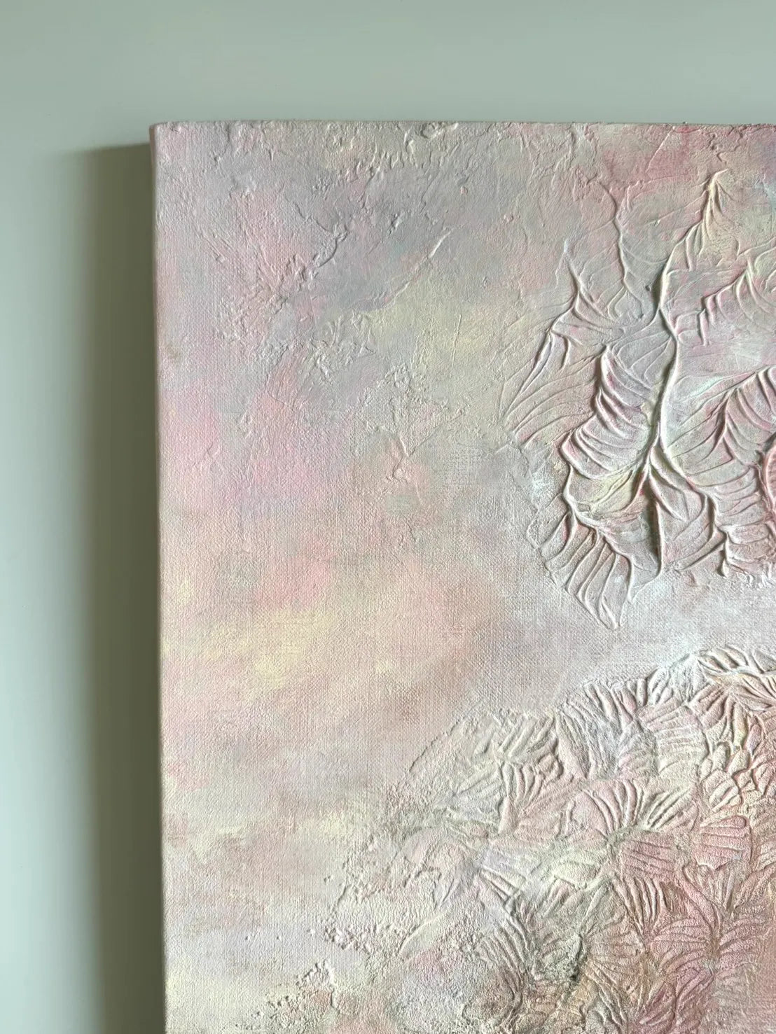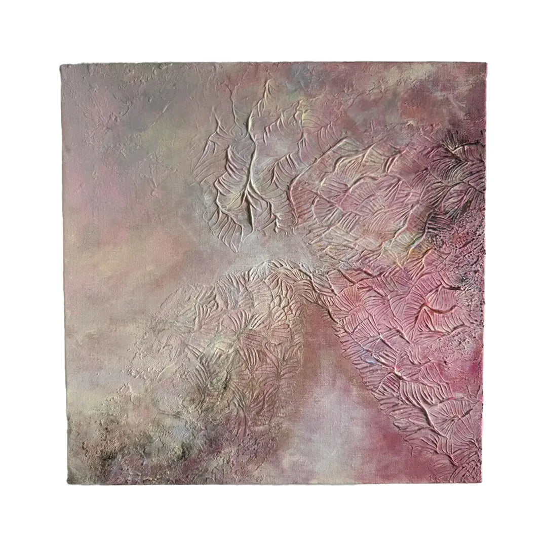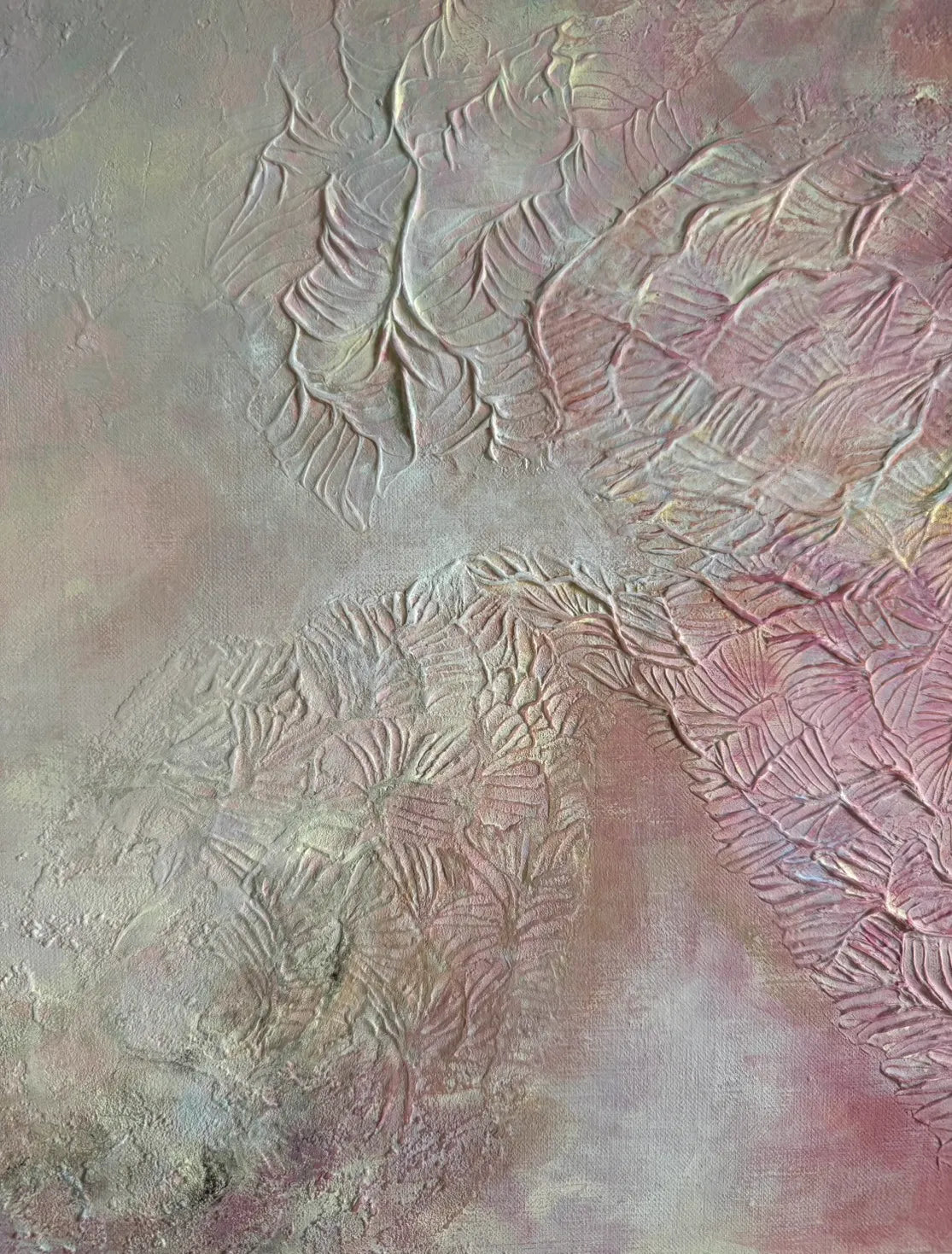 柔らかな薄紅色が画面全体に広がり、繊細な羽や花びらを思わせる立体的なテクスチャーが、光の粒子のように躍動しています。重なり合う絵具の陰影は、春の陽だまりの中でまどろむような幸福感を映し出し、眺めるほどに心が穏やかに満たされていくでしょう。この一作を壁面に迎えることで、室内には優美な華やぎが生まれ、日々の暮らしに明るい調和をもたらします。リビングや寝室に、ベージュ系のリネン素材と合わせるのが最適です。