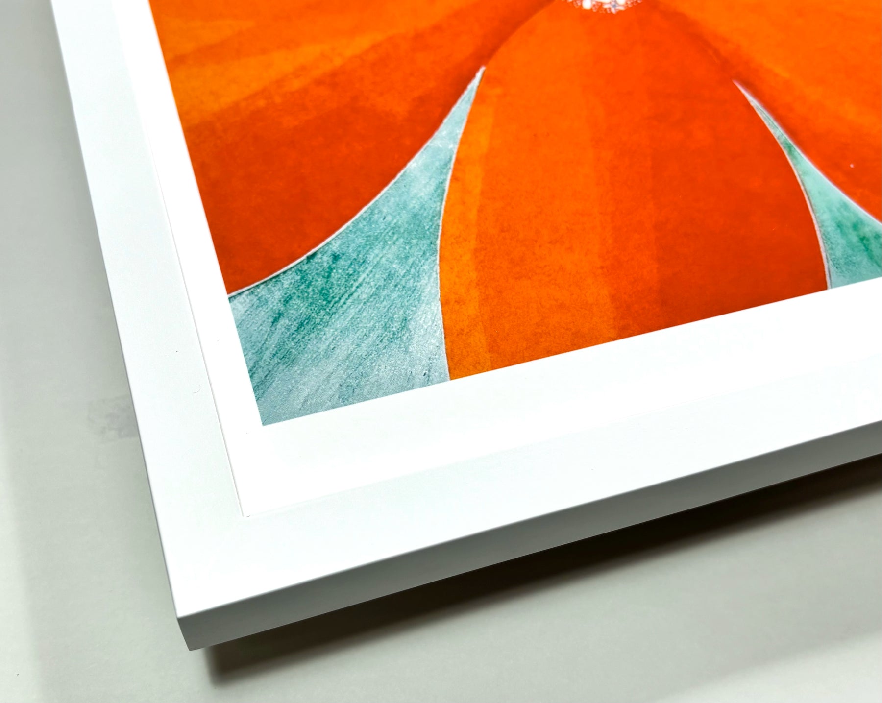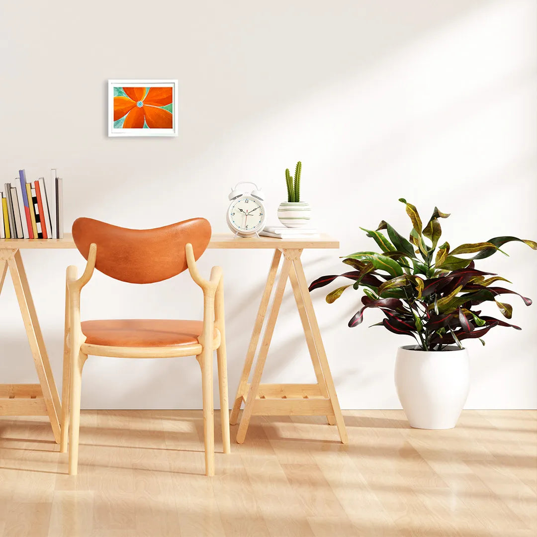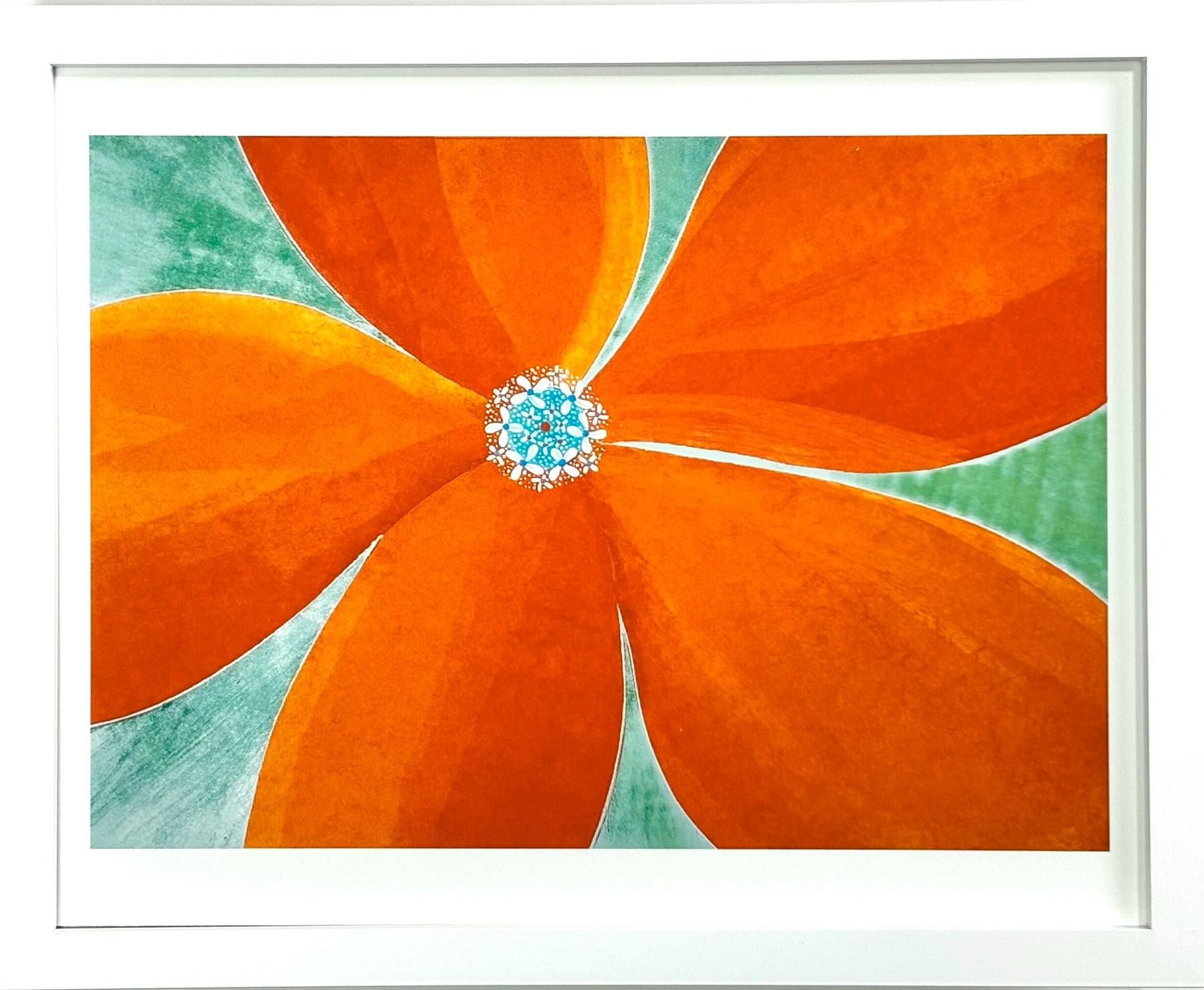 画面いっぱいに広がる鮮やかな橙色の花びらが、陽光を浴びて呼吸しているような生命の煌めきを感じさせ、中心の繊細な青と白の対比が心を清々しく澄み渡らせてくれます。眺めるほどに晴れやかな充足を届けるこの一作を飾ることで、壁面に瑞々しい活気が宿り、空間を洗練された旅情で彩ります。