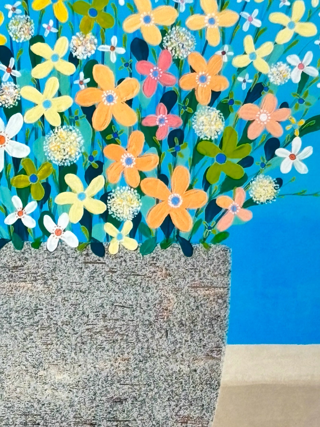 鮮やかな碧色を背に、溢れんばかりの小花が丸く寄り添い、弾けるような生命の喜びを奏でています。一輪ごとに異なる色彩が調和する様子は、幸福な対話のようで、眺めるほどに晴れやかな心地に包まれるでしょう。この一作を飾ることで、室内には瑞々しい活気が満ち、日常を明るい高揚感で彩ります。キッチンやリビングに、白木の北欧家具と設えるのが最適です。