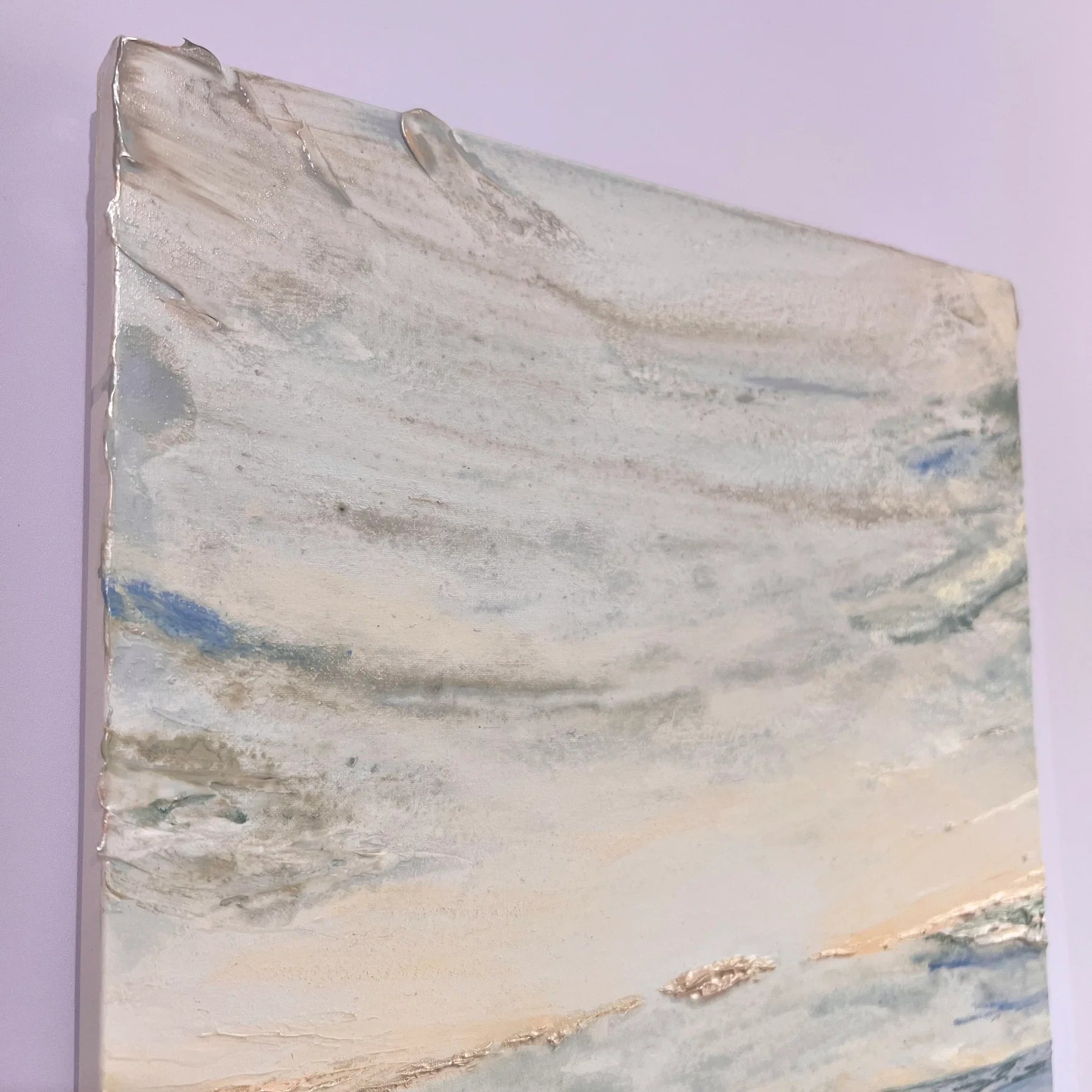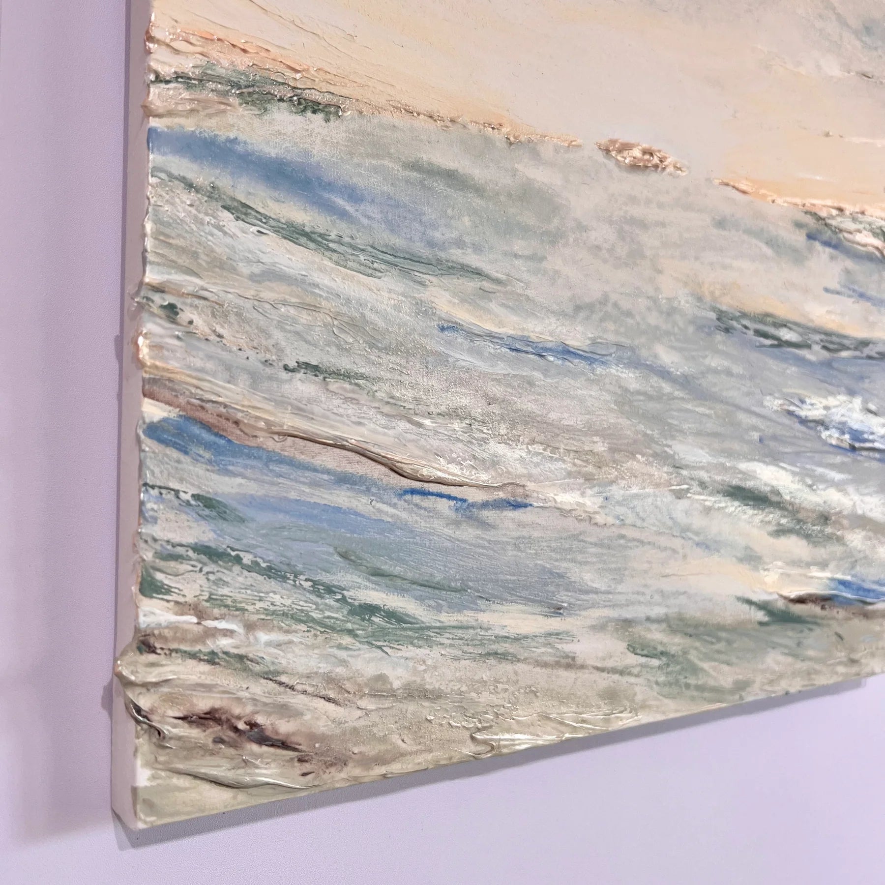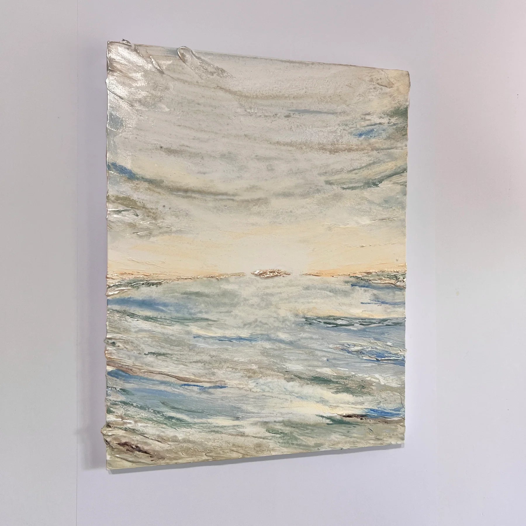 淡いブルーとベージュのグラデーションが溶け合い、水平線の向こうに柔らかな光が浮かぶ作品。静かに満ちていく海の気配が、心を穏やかに包み込みます。立体的な質感と繊細な筆致が、光の反射によって刻々と表情を変え、まるで自然の呼吸を感じるよう。リビングや寝室など、落ち着いた空間に飾ることで、穏やかな時間の流れをもたらしてくれる一枚です。