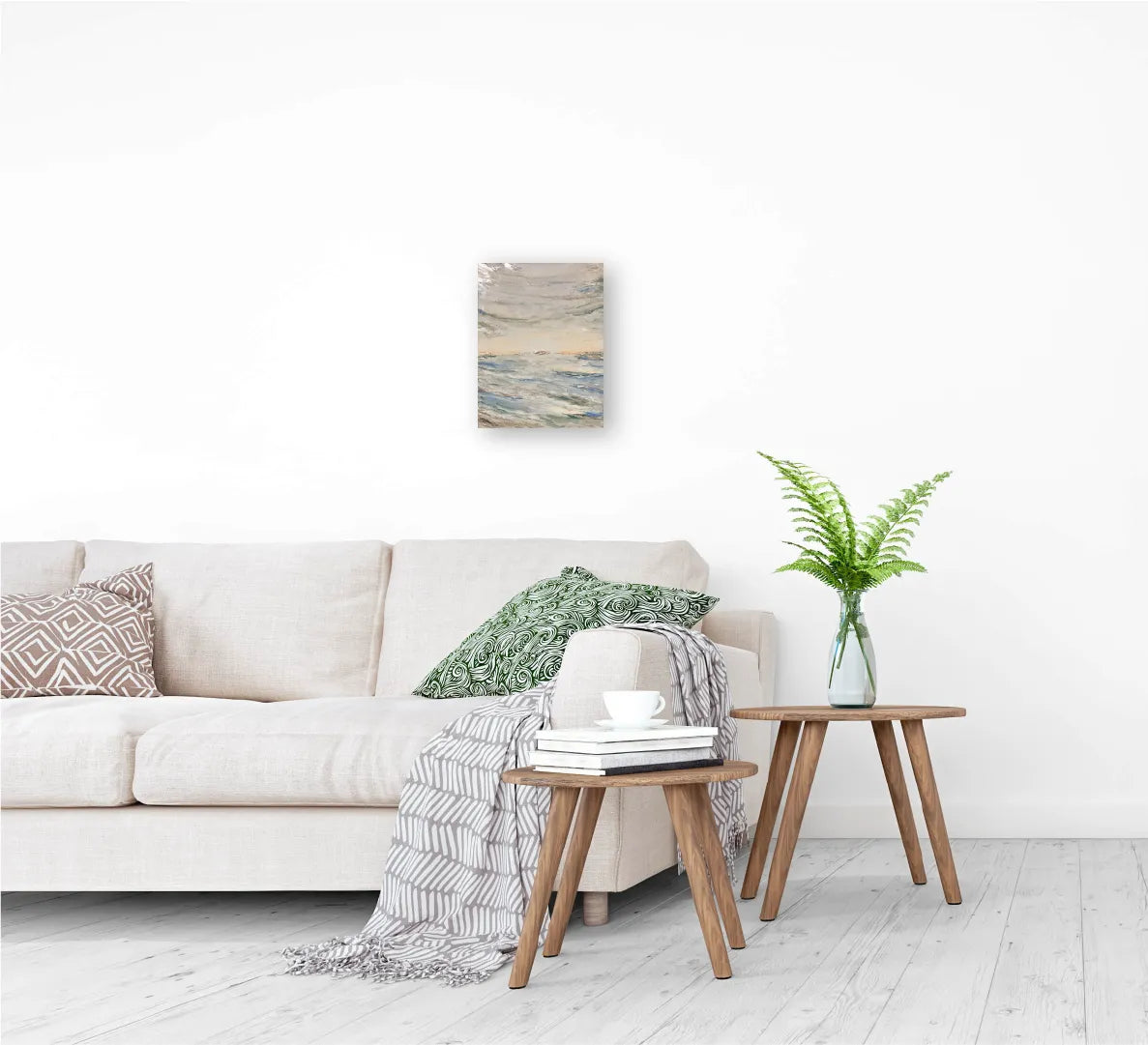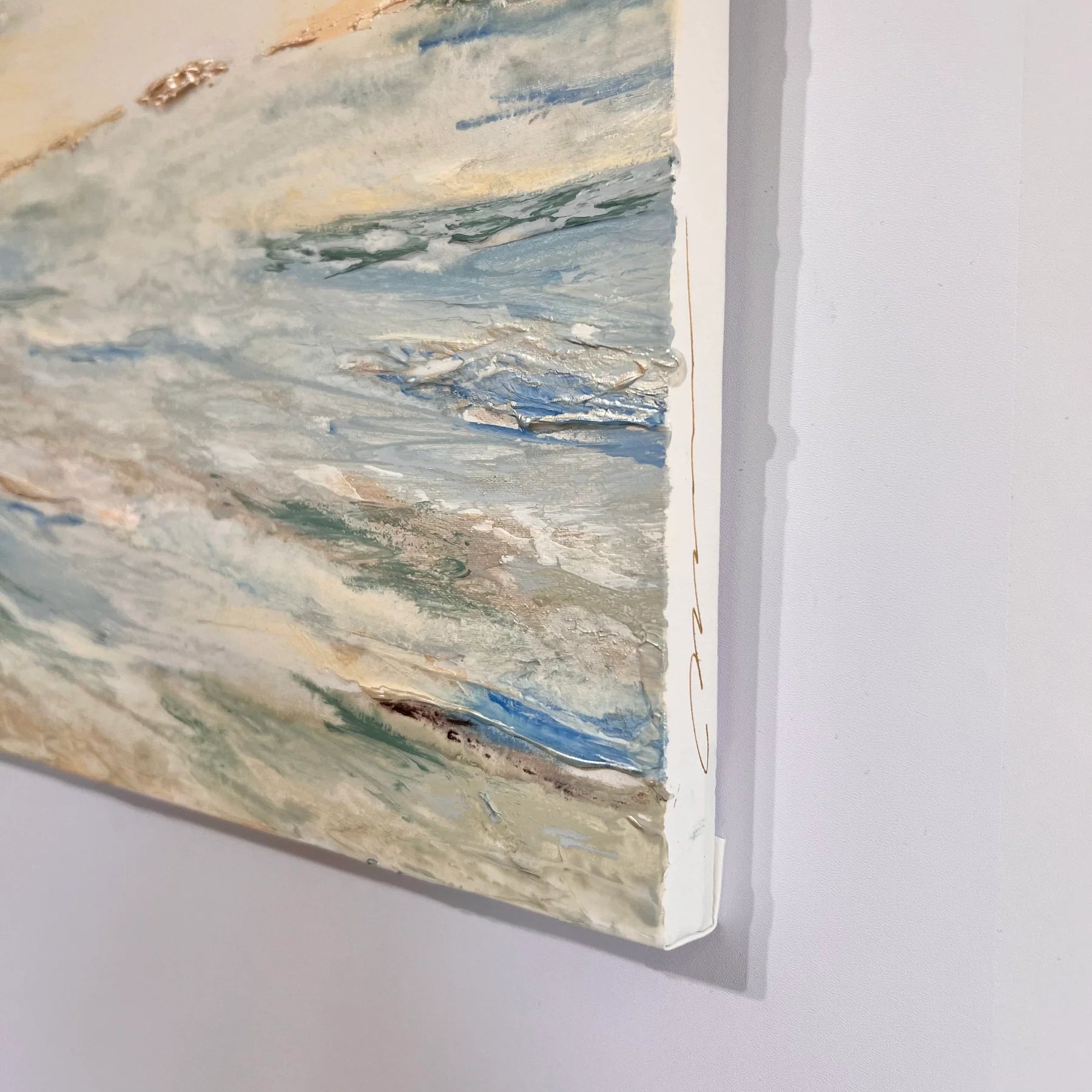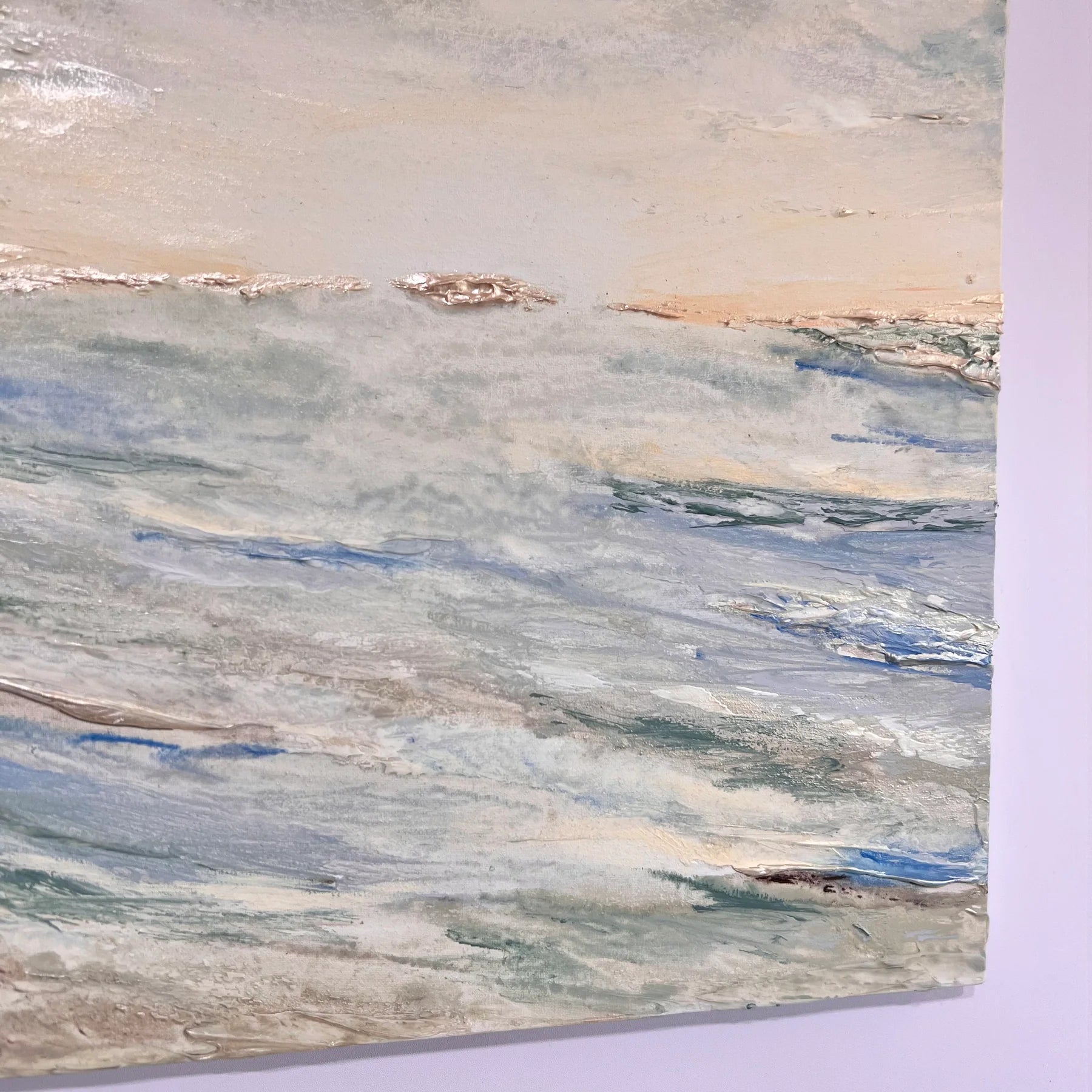 淡いブルーとベージュのグラデーションが溶け合い、水平線の向こうに柔らかな光が浮かぶ作品。静かに満ちていく海の気配が、心を穏やかに包み込みます。立体的な質感と繊細な筆致が、光の反射によって刻々と表情を変え、まるで自然の呼吸を感じるよう。リビングや寝室など、落ち着いた空間に飾ることで、穏やかな時間の流れをもたらしてくれる一枚です。