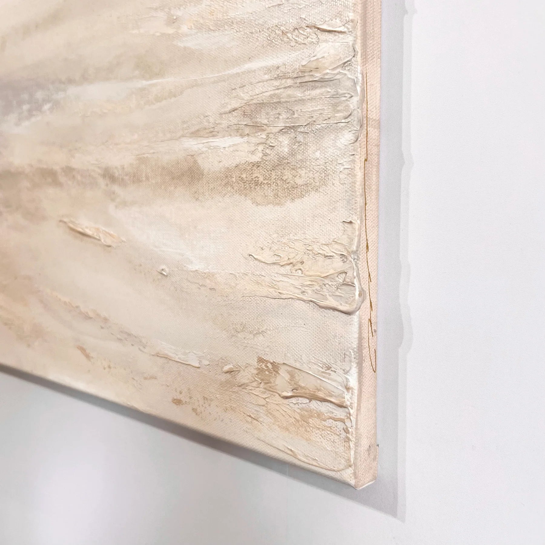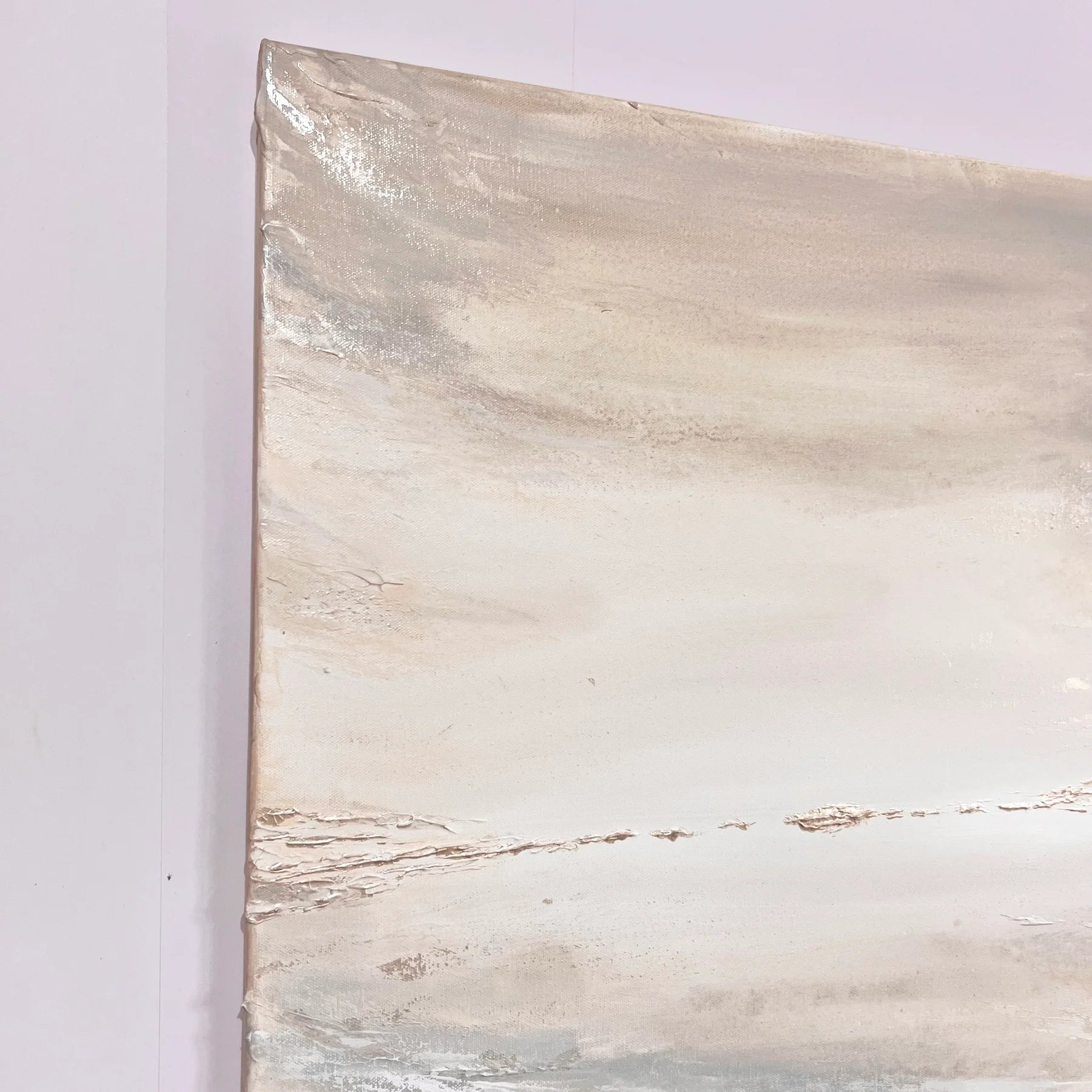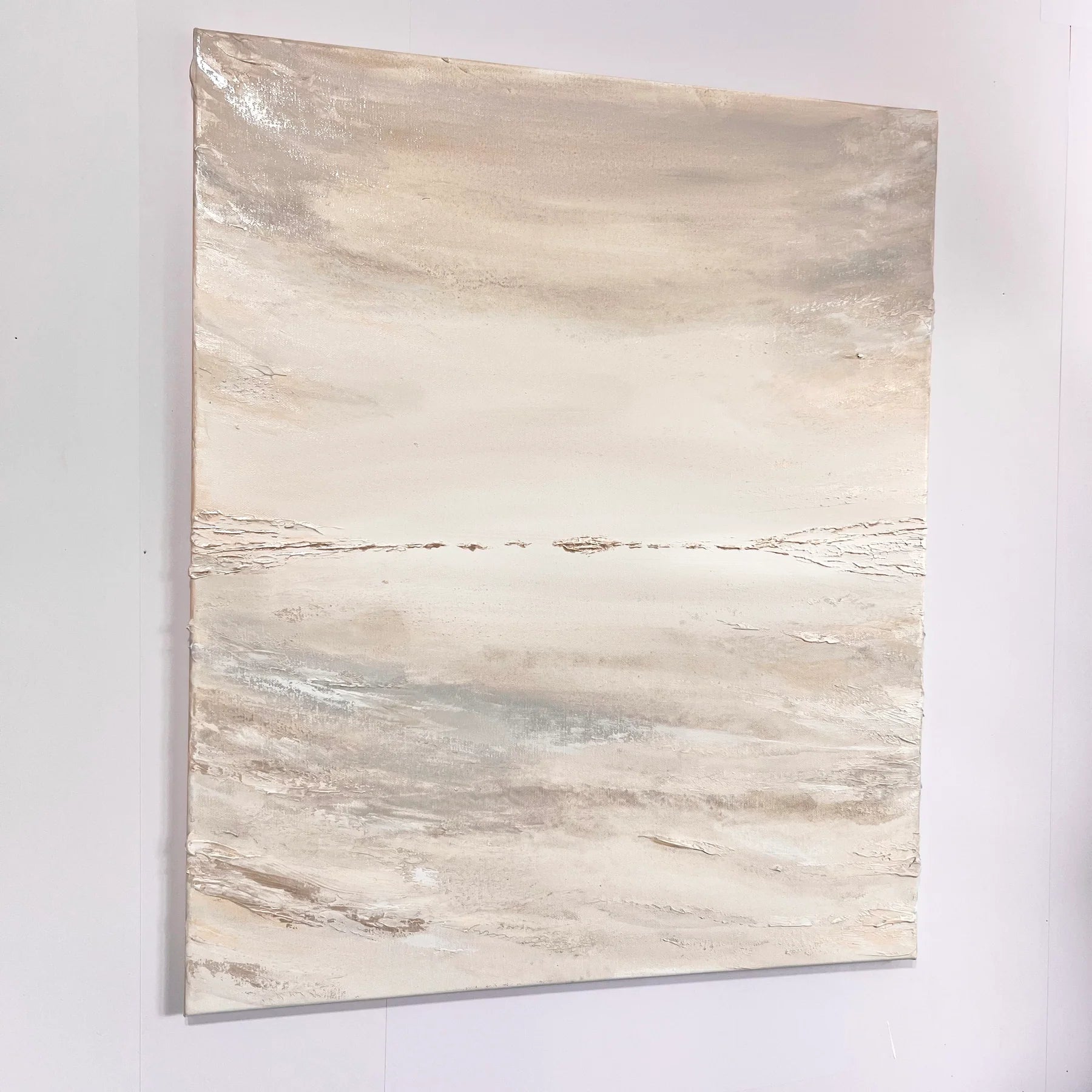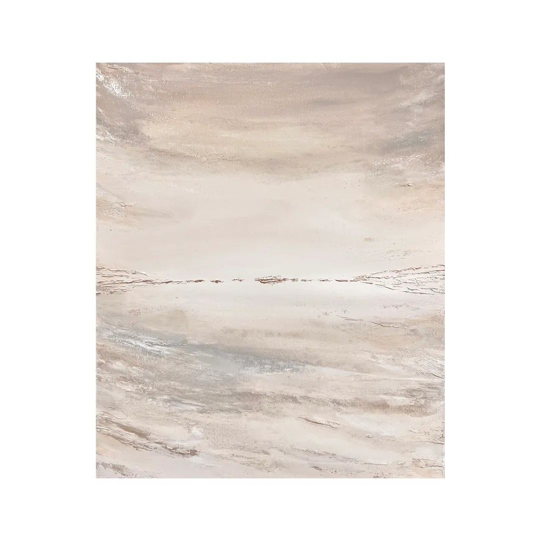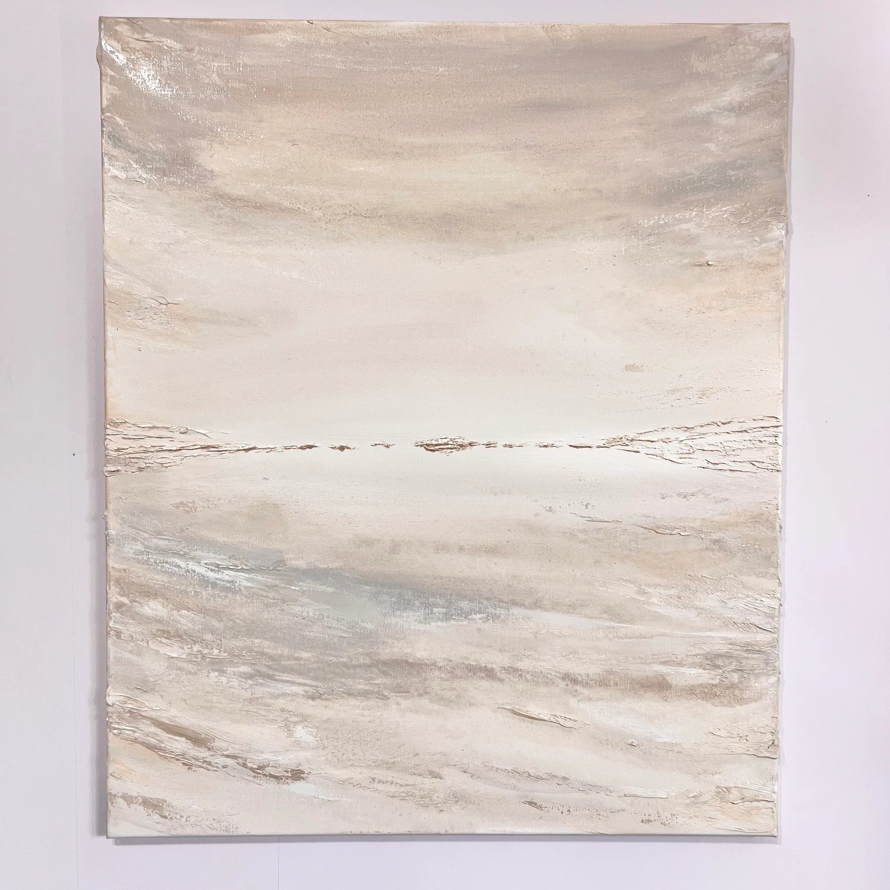 淡いベージュとグレーの繊細な階調で構成された、穏やかな風景画。静かな水平線の向こうに漂う光が、柔らかな時間の流れを感じさせます。絵肌に残る質感が、風や砂の軌跡のように空間に動きをもたらし、光の加減によって異なる表情を見せるのも魅力です。リビングや寝室など、落ち着いたトーンの空間に飾ることで、心を整え、日常に静かな美しさを添えてくれる一枚です。
