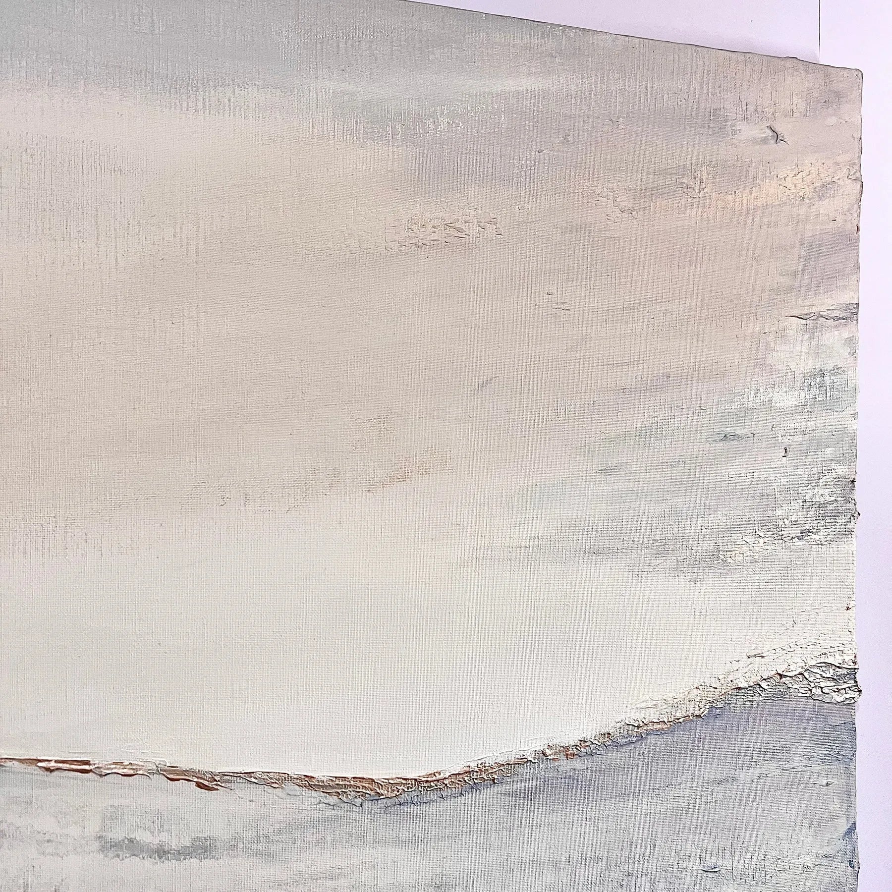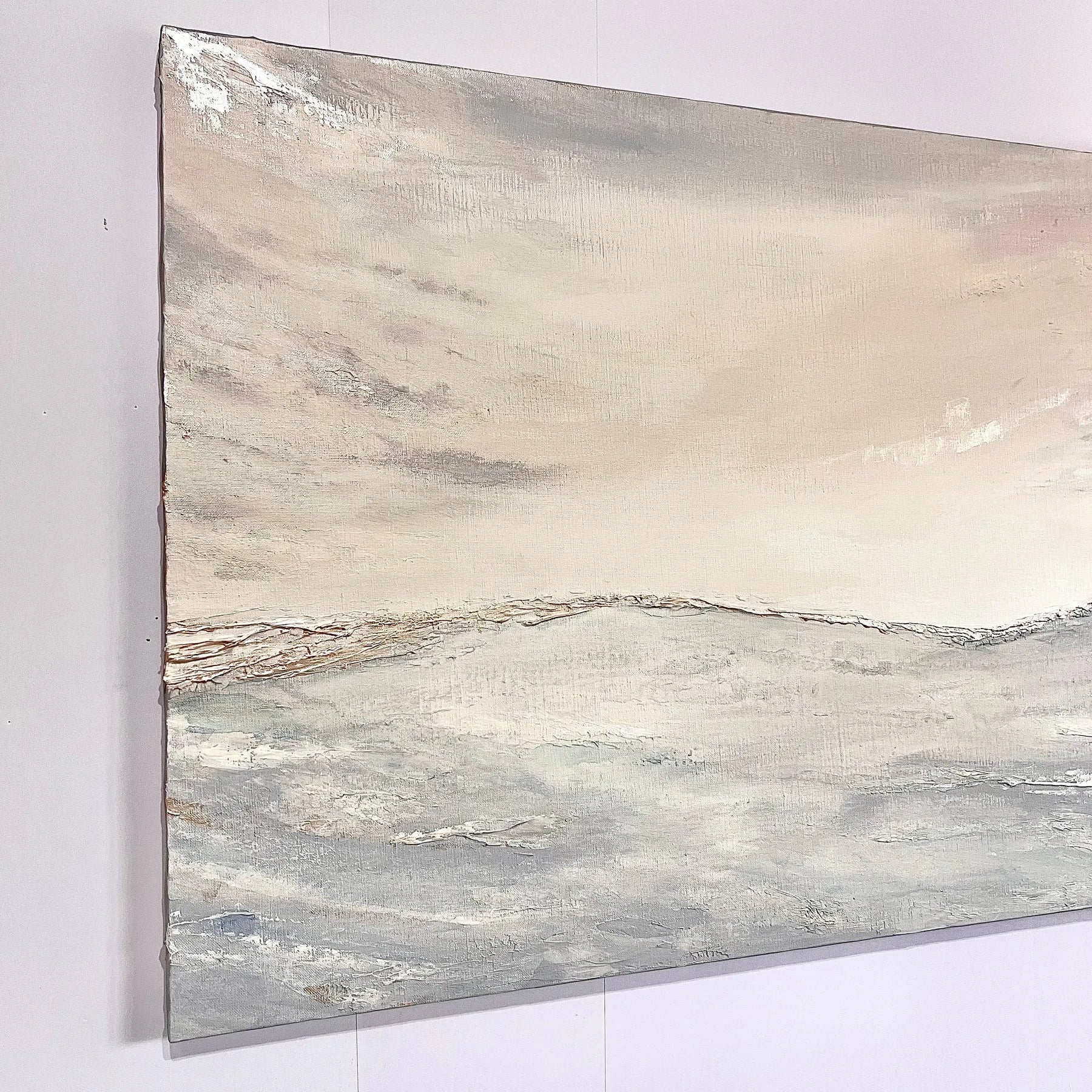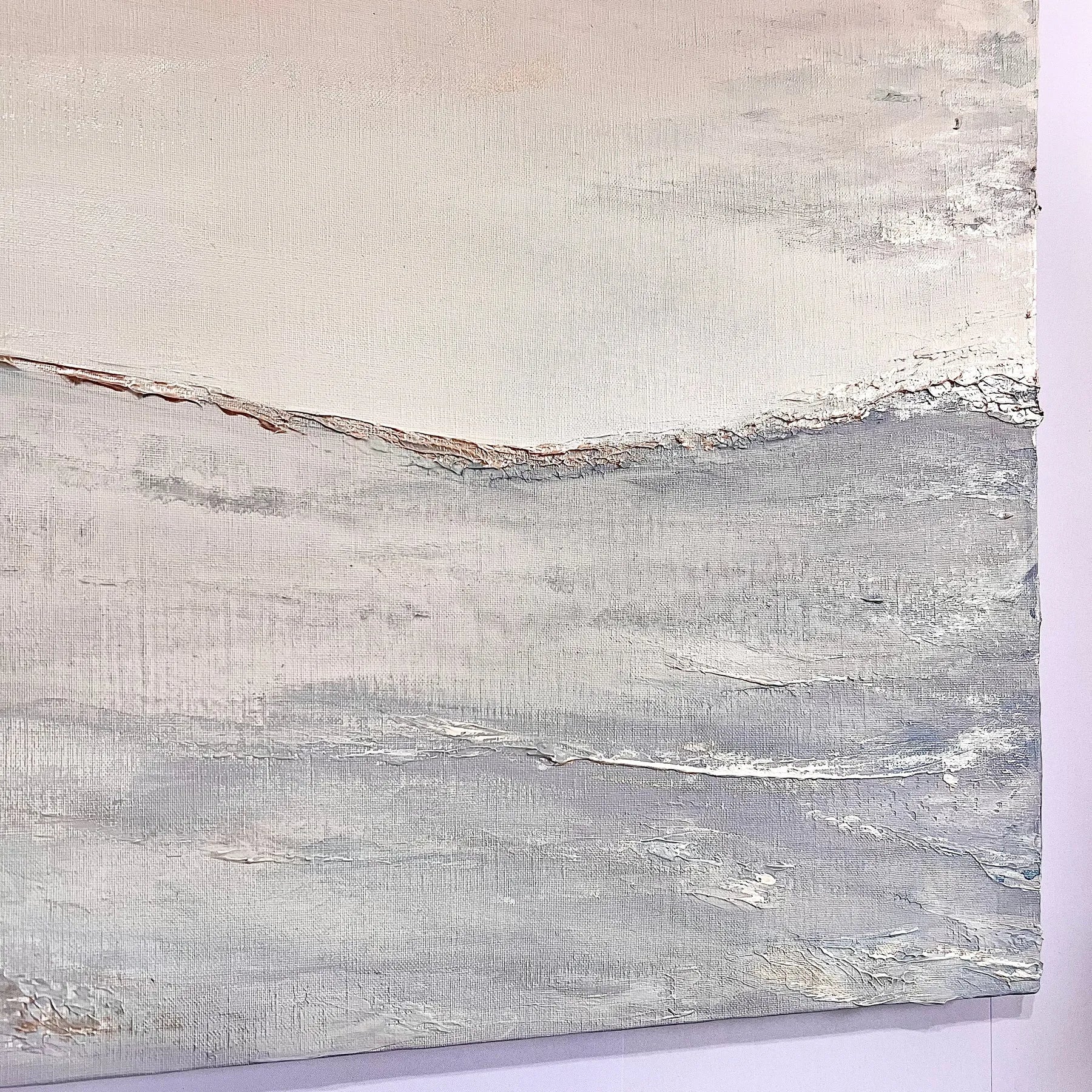 曇り空の下、穏やかに広がる海原を思わせる作品。ベージュとグレーを基調とした柔らかな色彩が、心を静めるように優しく広がります。繊細なマチエール(質感)が風や波の痕跡を映し出し、見る角度によって異なる光の表情を楽しめます。空間に飾ることで、忙しない日常にゆるやかな時間の流れを取り戻してくれる一枚。ミニマルなインテリアやナチュラルな家具との相性も抜群です。