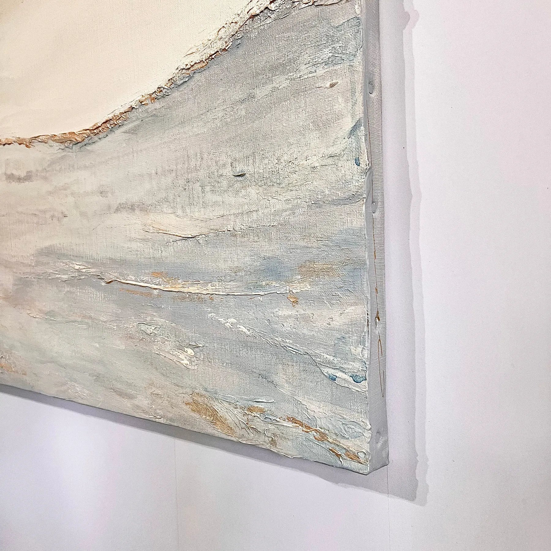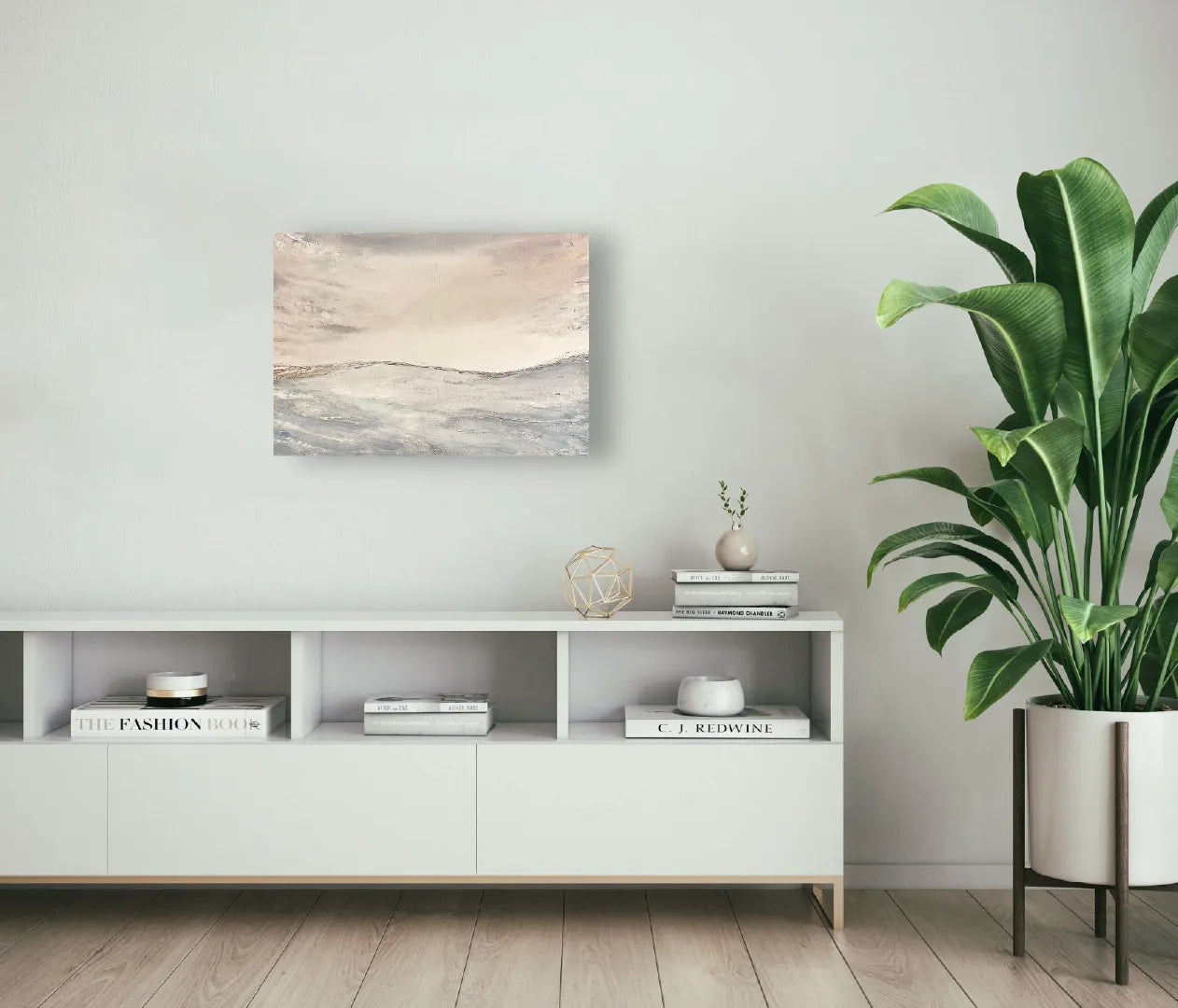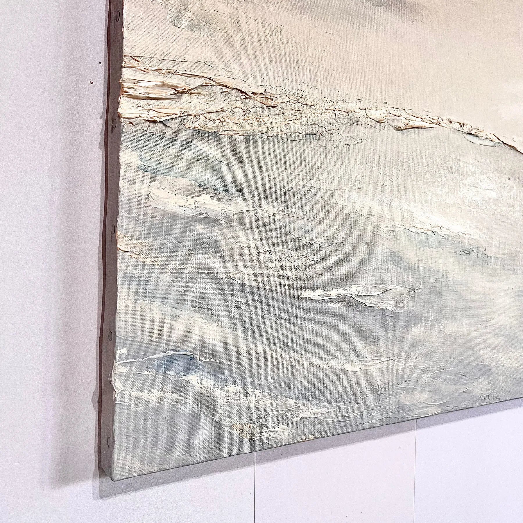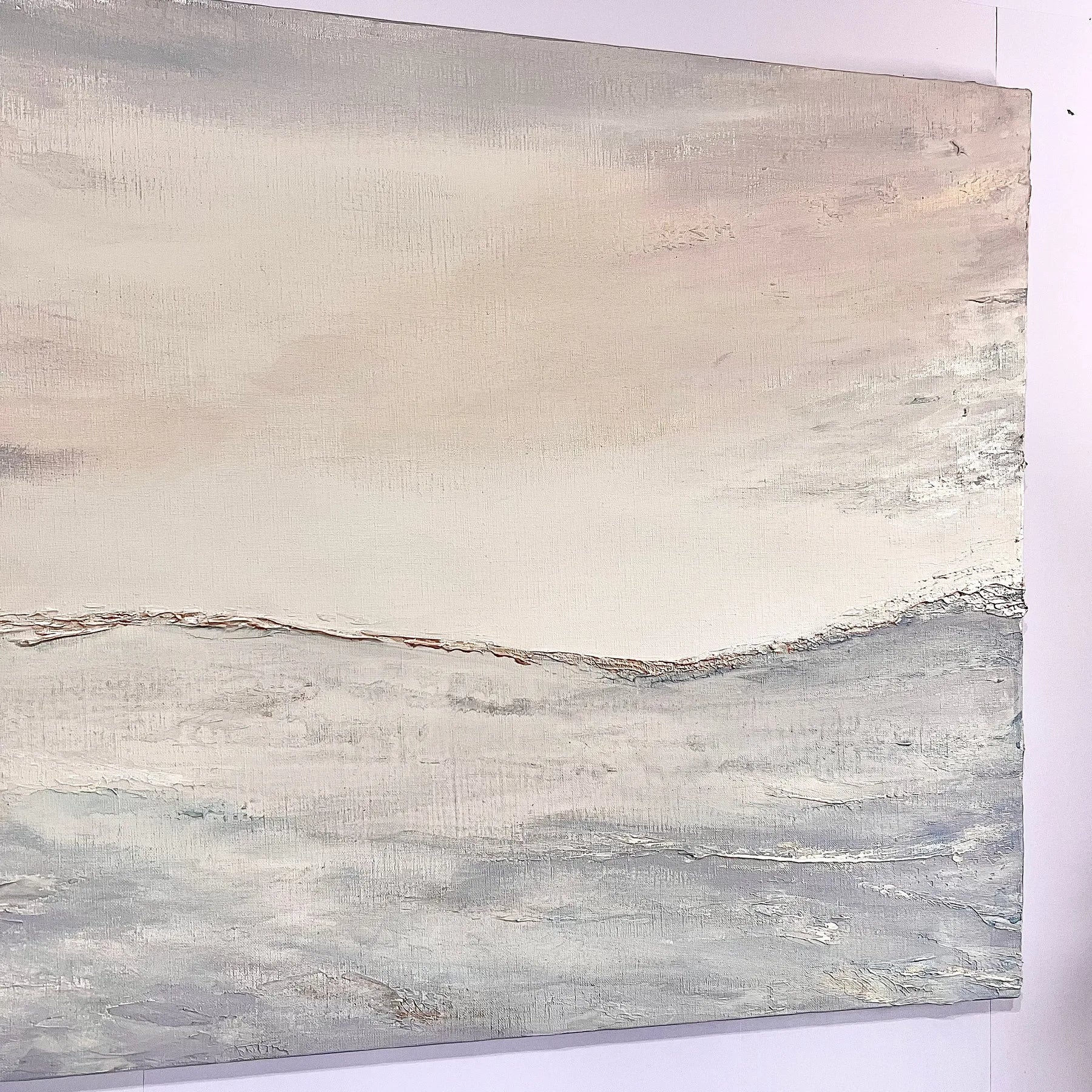 曇り空の下、穏やかに広がる海原を思わせる作品。ベージュとグレーを基調とした柔らかな色彩が、心を静めるように優しく広がります。繊細なマチエール(質感)が風や波の痕跡を映し出し、見る角度によって異なる光の表情を楽しめます。空間に飾ることで、忙しない日常にゆるやかな時間の流れを取り戻してくれる一枚。ミニマルなインテリアやナチュラルな家具との相性も抜群です。