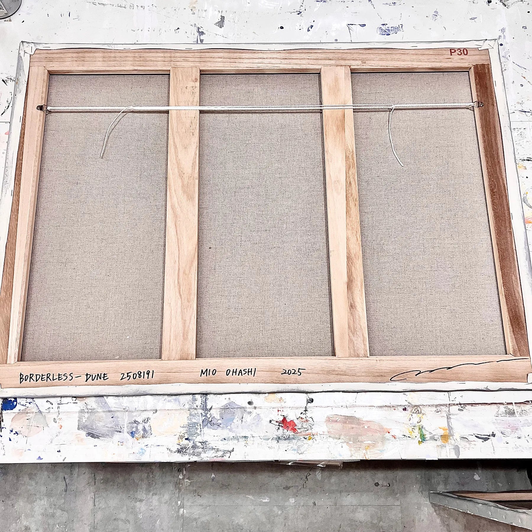 BORDERLESS - 境界を超える旅 どこまでも広がる、無限の空。はるか彼方にのびる地平線や水平線。 そこに太陽の光が差す瞬間、境界線は輝いてやさしく溶け合い、上と下の世界を隔てていた境目がなくなり、ひとつの世界になる。 そんな瞬間を表現した作品シリーズです。 抽象画のため、環境や心境などによって「どう見えるか」が変化します。 朝陽や夕陽に見えたり、海や湖に見えたり、 大地や砂丘に見えたり、空と雲に見えたりと、 光の当たり方や時間帯、飾っていただく方の心情に寄り添い、見え方が変わるのが特徴です。