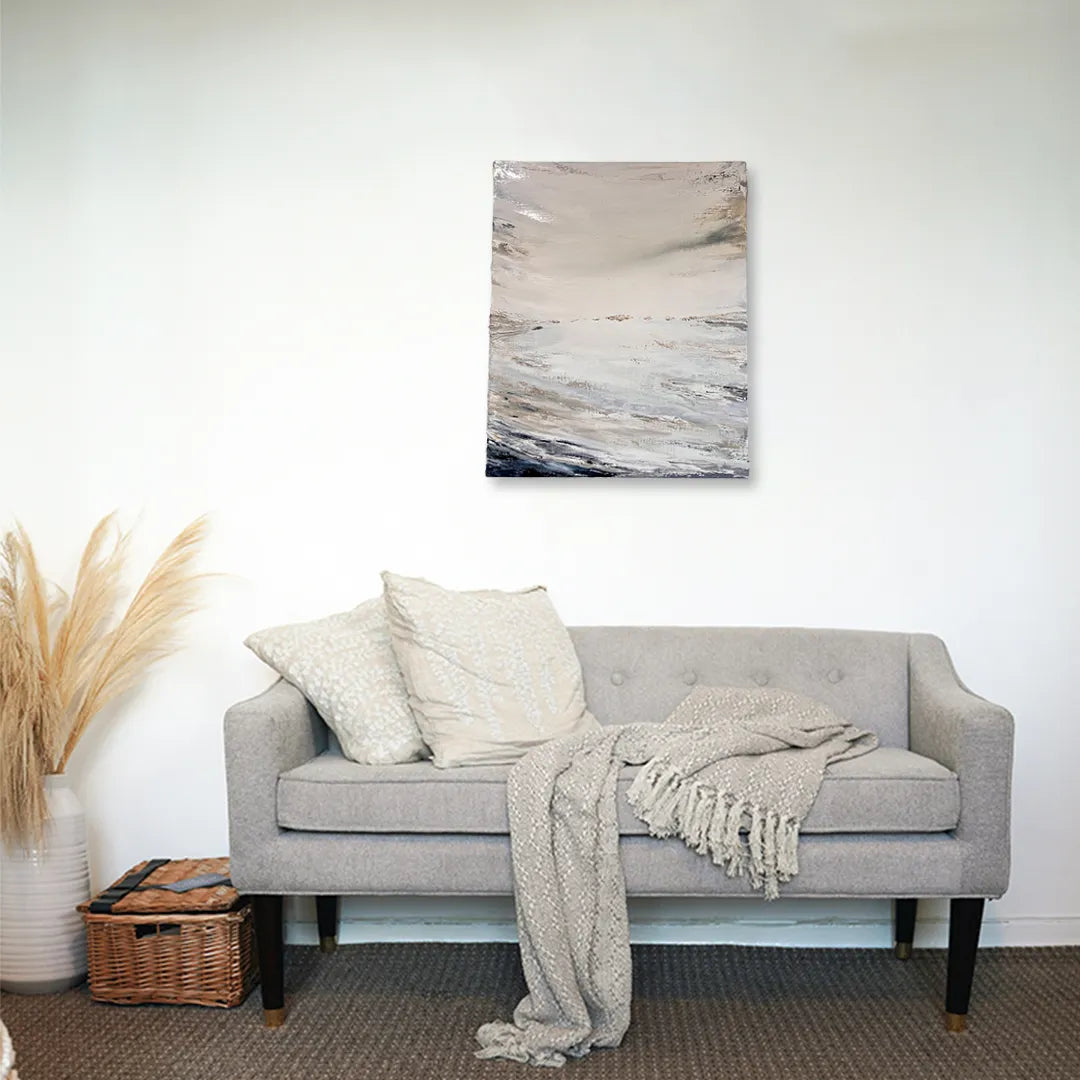 薄い光を湛えた海面が、遠く霞む地平と溶け合うように広がっています。白と灰の狭間に潜むわずかな温度が、心の奥に静かな呼吸を残すようです。壁に掛けると、空間の空気が柔らかく整い、思考の流れがゆるやかに澄んでいきます。無垢材の家具やリネンの質感と響き合い、リビングや寝室にも穏やかな調和をもたらします。