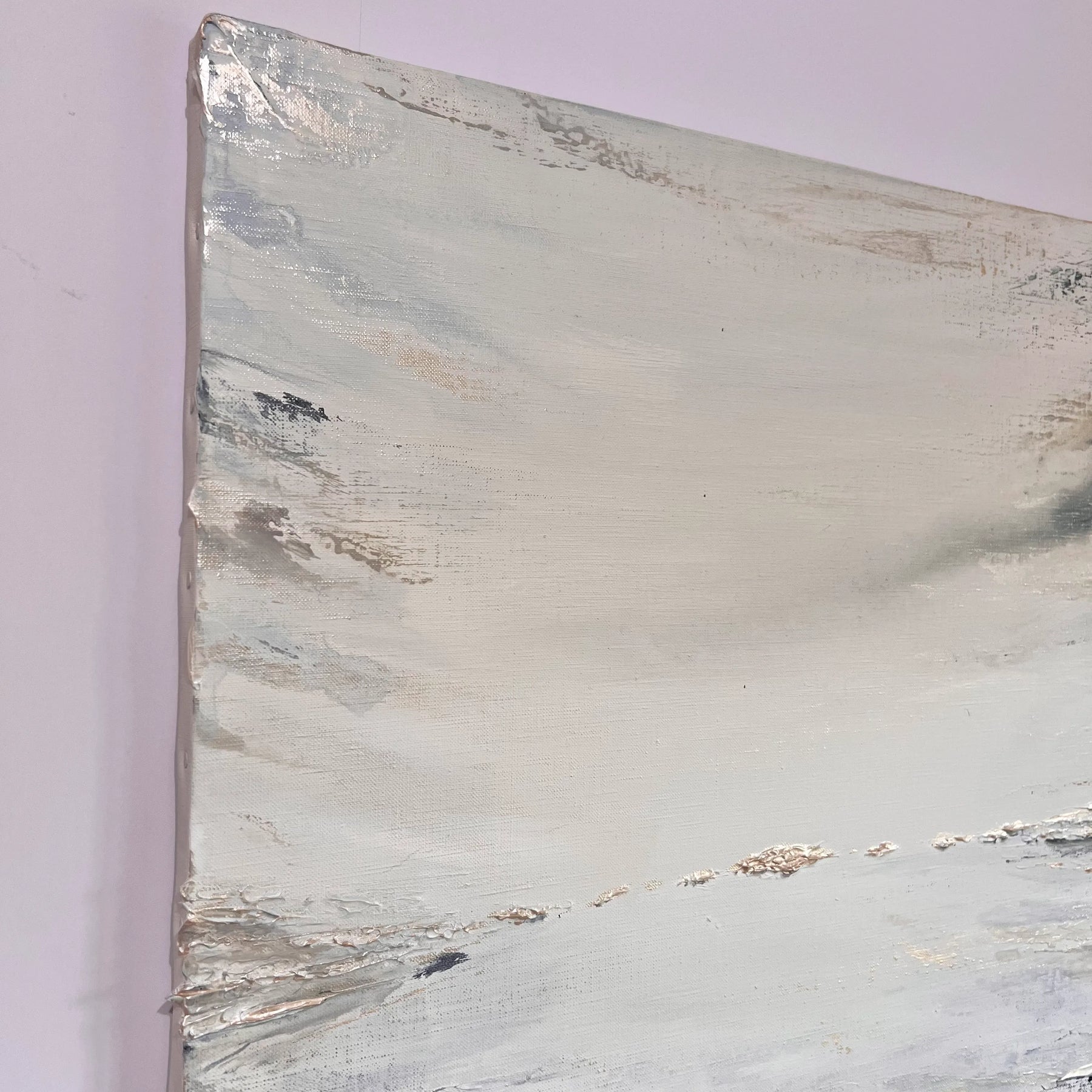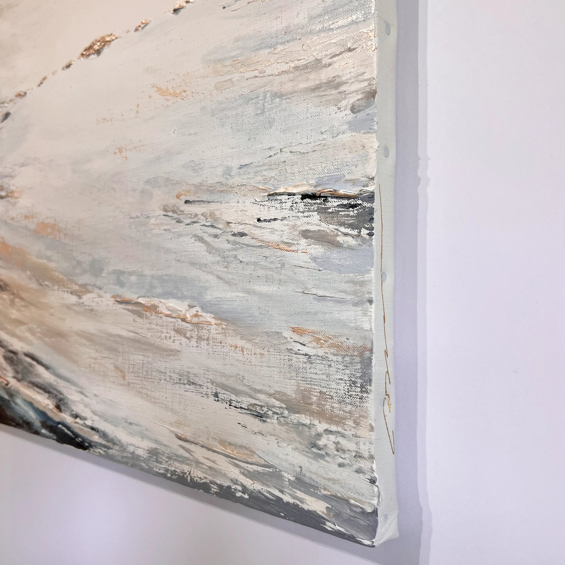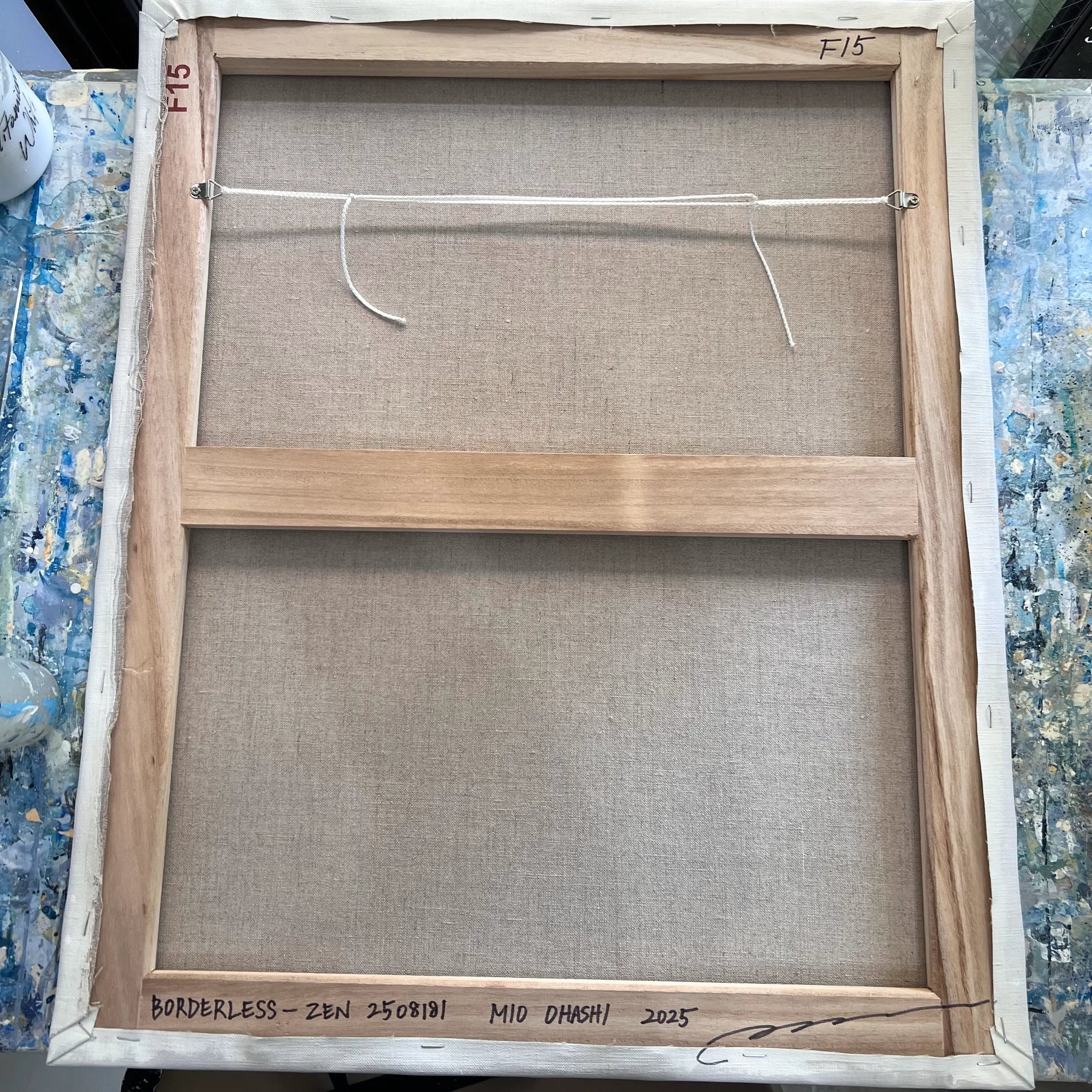BORDERLESS - 境界を超える旅 どこまでも広がる、無限の空。はるか彼方にのびる地平線や水平線。 そこに太陽の光が差す瞬間、境界線は輝いてやさしく溶け合い、上と下の世界を隔てていた境目がなくなり、ひとつの世界になる。 そんな瞬間を表現した作品シリーズです。 抽象画のため、環境や心境などによって「どう見えるか」が変化します。 朝陽や夕陽に見えたり、海や湖に見えたり、 大地や砂丘に見えたり、空と雲に見えたりと、 光の当たり方や時間帯、飾っていただく方の心情に寄り添い、見え方が変わるのが特徴です。