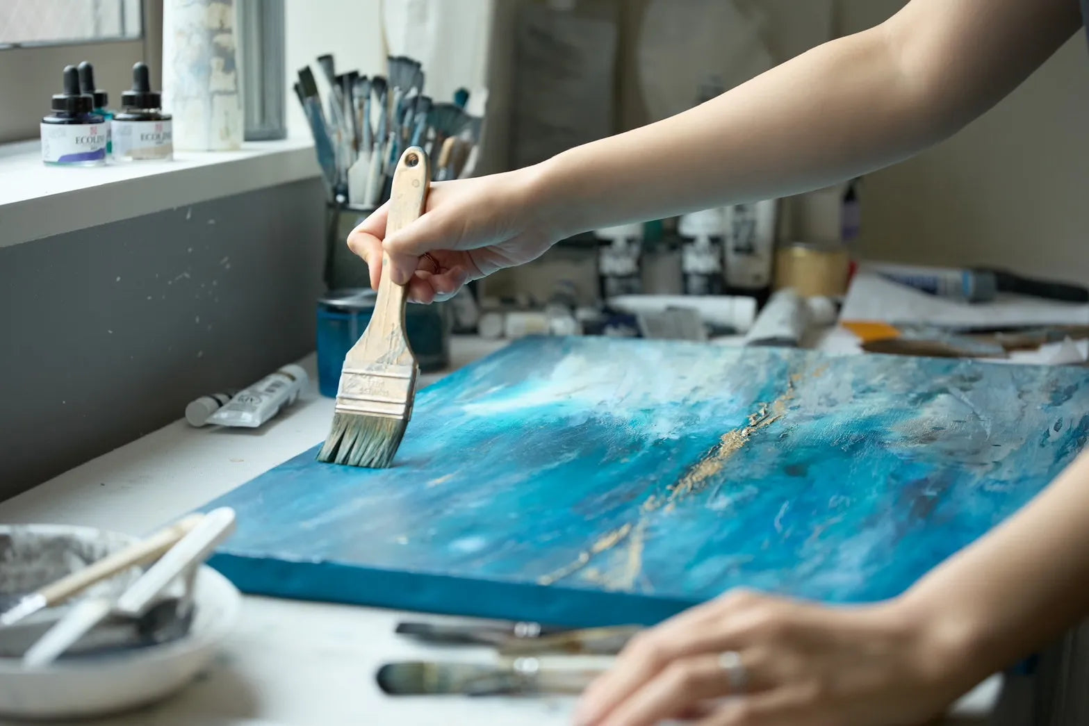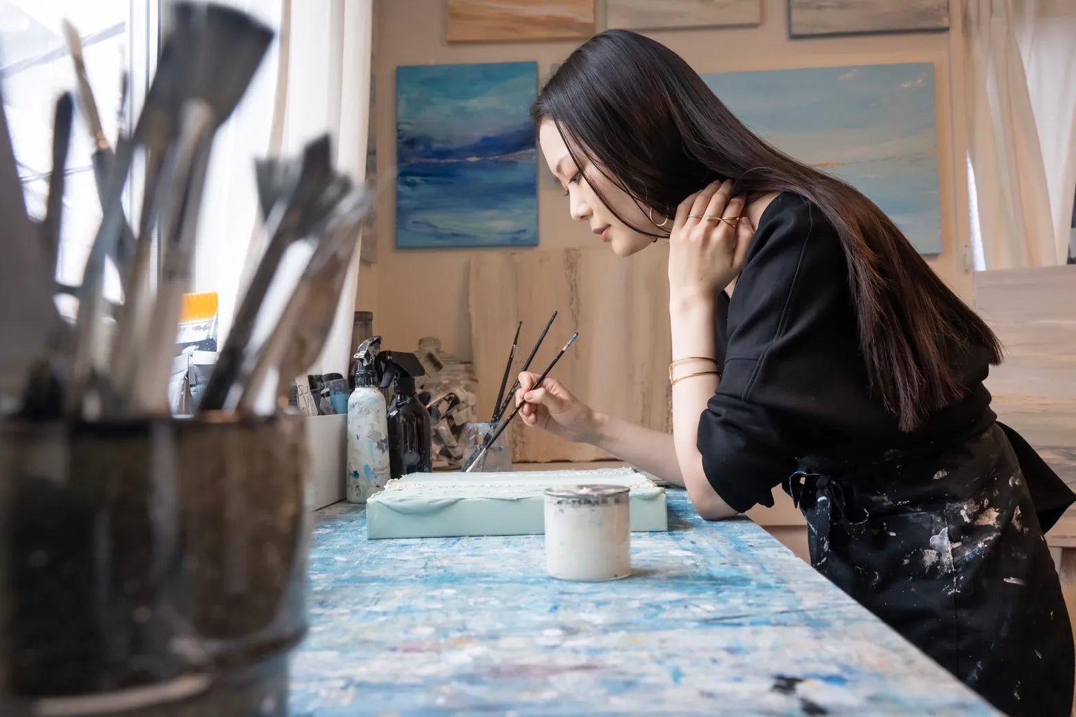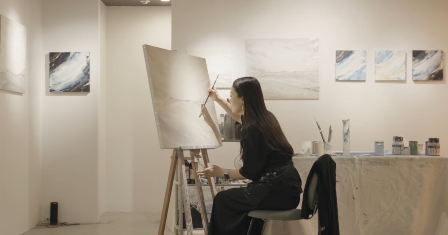 - 早稲田大学国際教養学部卒。オランダ・イギリス留学を経て世界30カ国を旅し、現在は東京で活動中。人生で出会う「美しさ」を再構成し、人々にポジティブなエネルギーを与えるアートとして表現している。海や大地、森の中など自然から着想を得た穏やかな色彩の広がり、温もりや息づかいを感じる質感、そしてエッジの効いた凛とした作風は、時に優しく、時に力強さを感じさせる。 作家自身が幼少期よりつらいことがあったときにアートに救われた経験が原点になっていることから、作品を眺める方に静かに寄り添い、そっと背中を押すような存在になって欲しいと願いを込めて制作を続ける。 2020年、コロナ禍で会社員から画家に転身。国内外のコレクターをはじめ、インテリアスタイリストの間でも口コミで広がり、オフィス、ホテル、家具ショールームなど幅広く作品を展開する。 3歳、1歳児の母親としても奮闘中。
