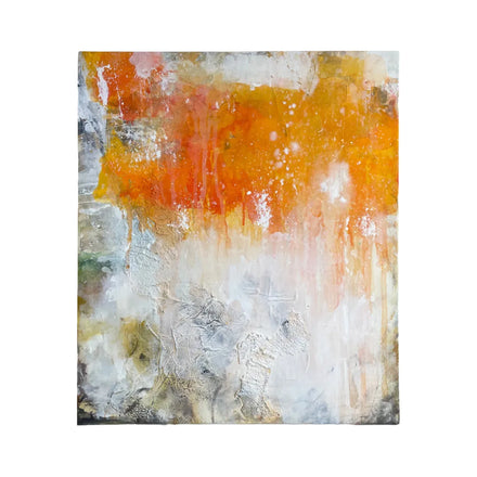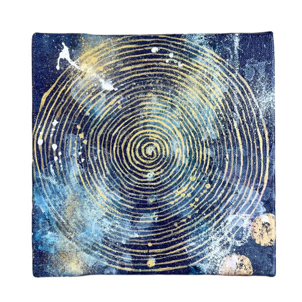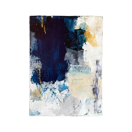 深い青と淡い色彩が織りなす、星が瞬くような抽象画です。煌めく金色の粒子が、広大な宇宙や海辺の夜空を想わせ、空間に幻想的な奥行きをもたらします。リビングや寝室に飾れば、静かで心が洗われるような、ひとときを演出するでしょう。
