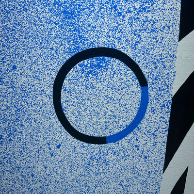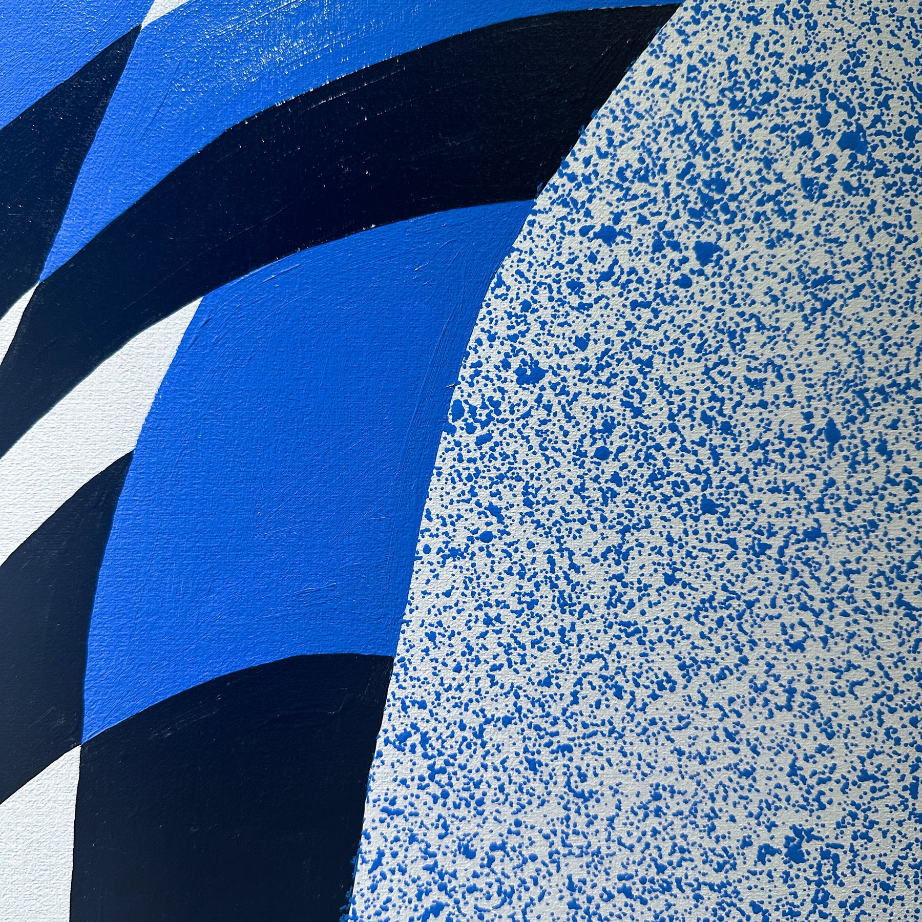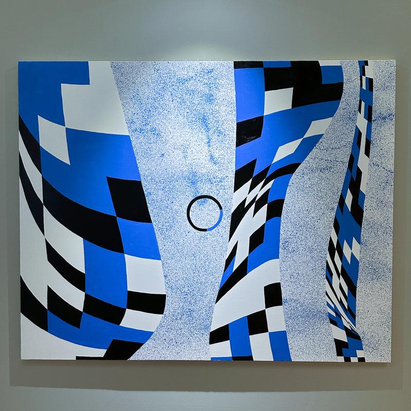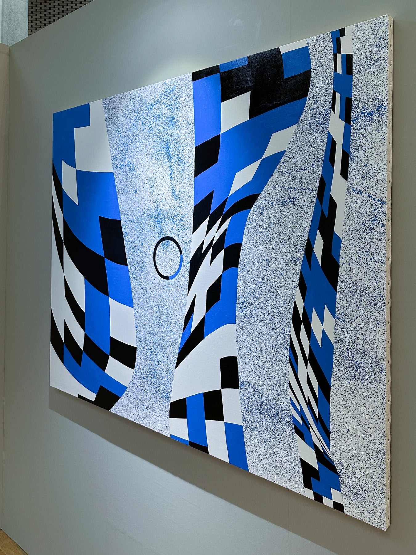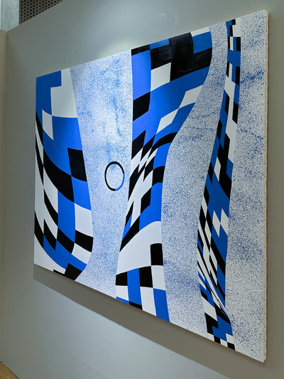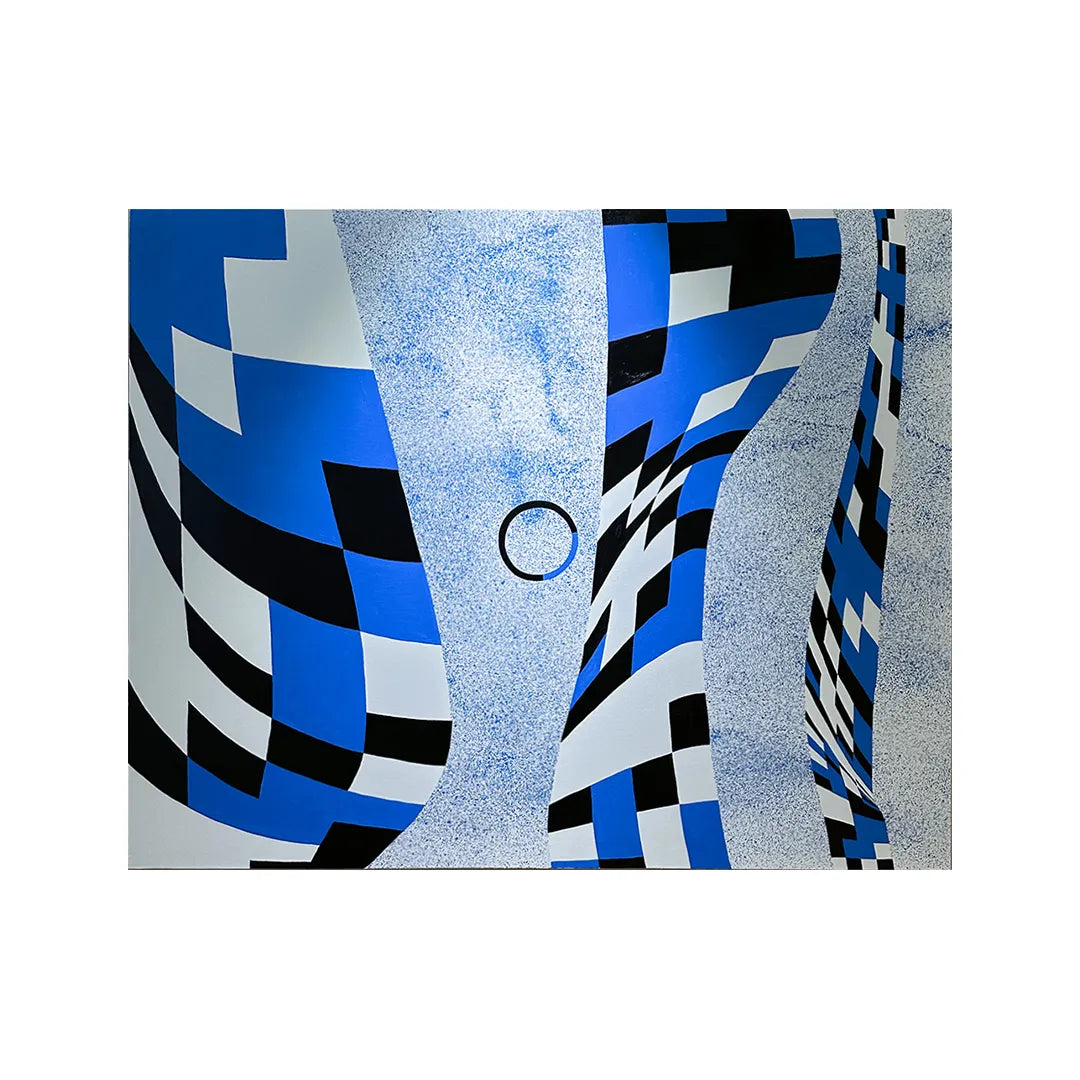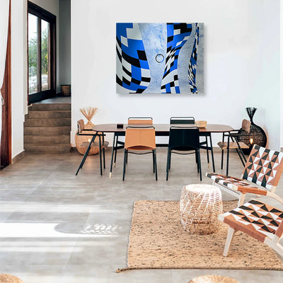 しなやかに揺れるブルーとモノクロのパターンが、まるで風を孕んだ布のように画面を舞います。中央に静かに浮かぶ円は、動の中の静を象徴し、視線を引き寄せます。飾ることで空間に軽やかな緊張感が生まれ、日常に新たなリズムをもたらします。ミニマルな書斎やモダンなリビングにもよく映え、洗練された空気を静かに添えてくれます。