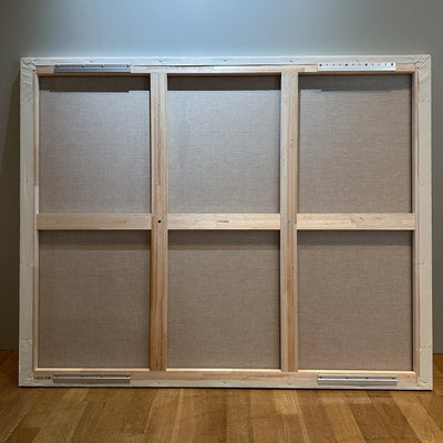 サインあり。裏面木枠に壁掛け用のフレンチクリート(ピクチャーハンガー)が4個ついています。