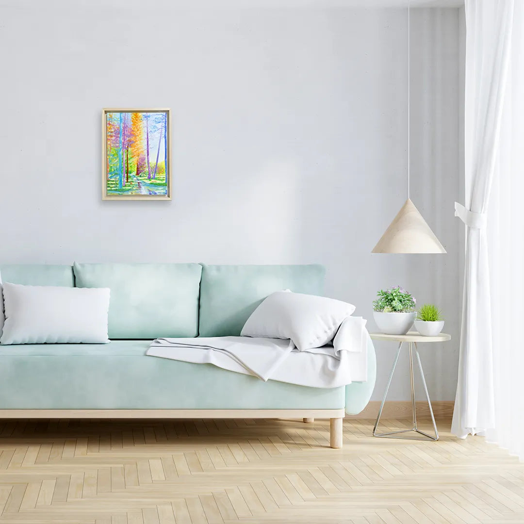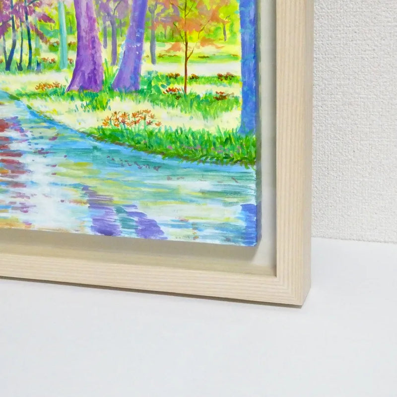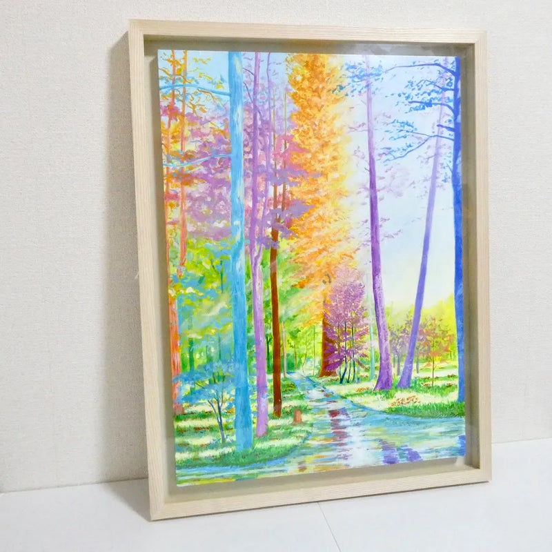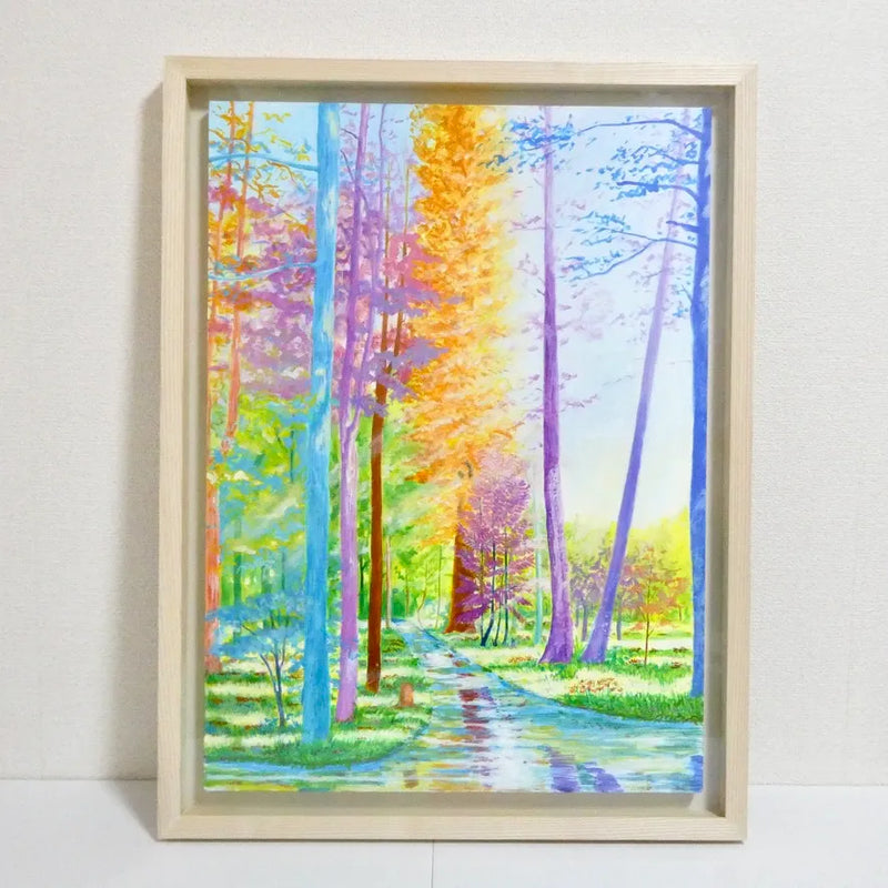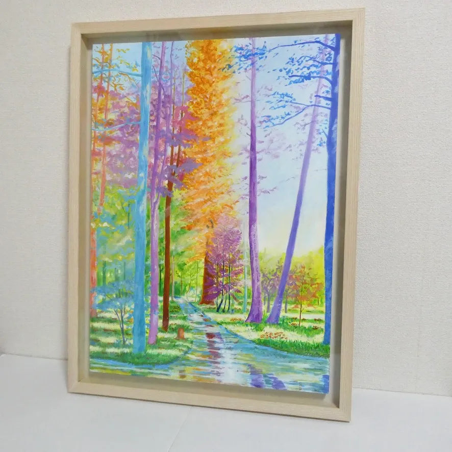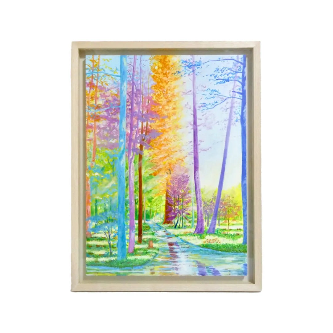 水面のように反射する小道と、虹のように彩られた木々が奥へと誘う風景は、歩くたびに空気の匂いまで変わっていきそうな豊かさを感じさせます。時の移ろいをやわらかく映すようなこの絵を飾ると、部屋全体が開放的で心地よい呼吸を始めます。北欧風のシンプルな家具や、白壁にさりげなく掛ければ、自然光とも響き合いながら、暮らしに軽やかな深みを添えてくれます。