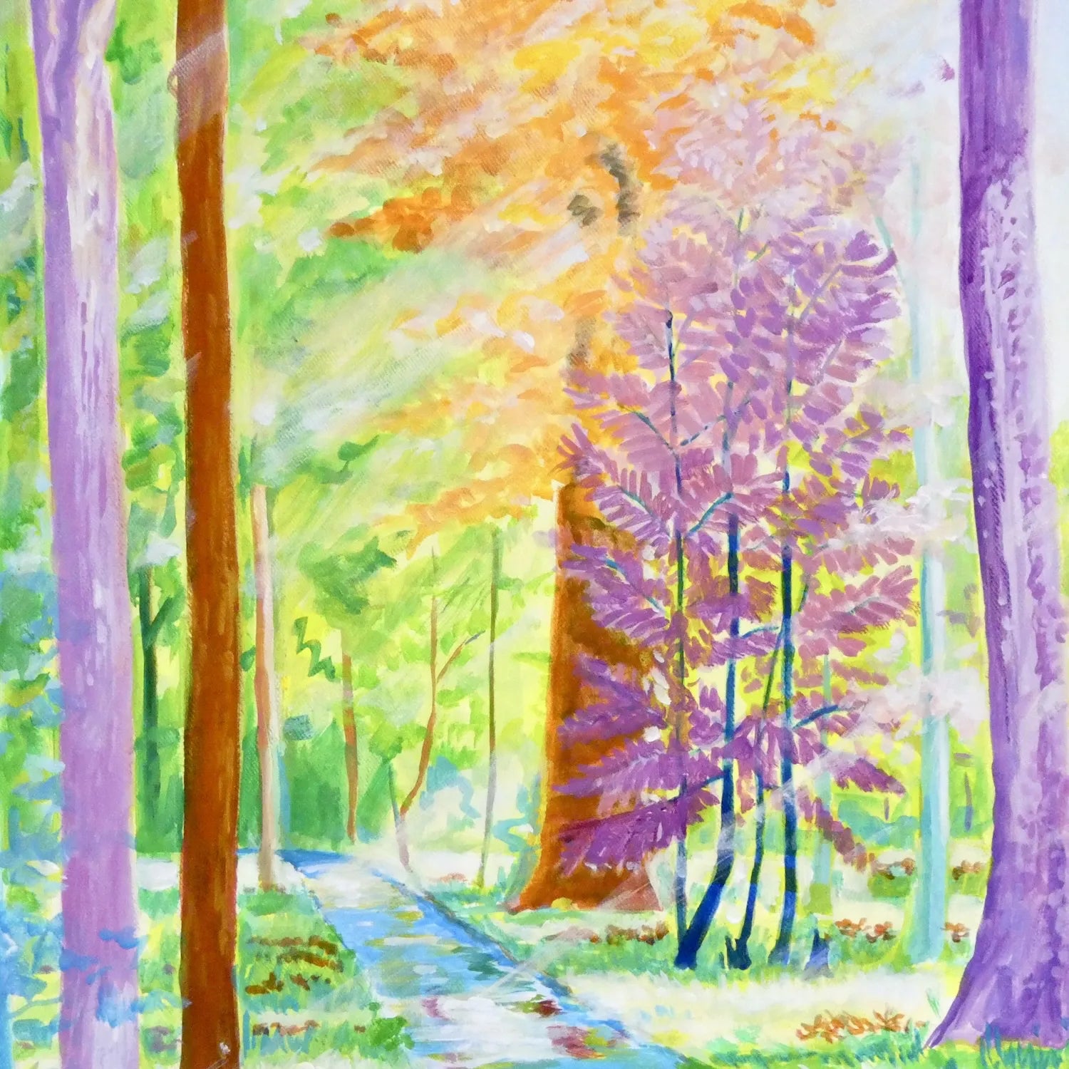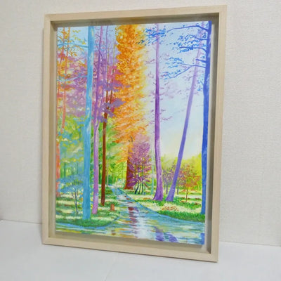 カラフルな森の風景画です。実際に見た景色をもとに想像を膨らませて描いています。自然の中を歩いた時の心健やかで明るくなれる体験を光と色彩で表現しました。鮮やかな色彩でも目に優しい配色にこだわっています。絵からポジティブな力を感じていただけたら嬉しいです。