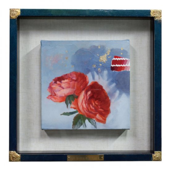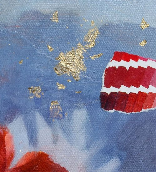 金箔をパラパラとキャンバスに散らし、淡いブルーをベースに赤い花を描いたmiki shirakawaさんの可愛らしい作品。